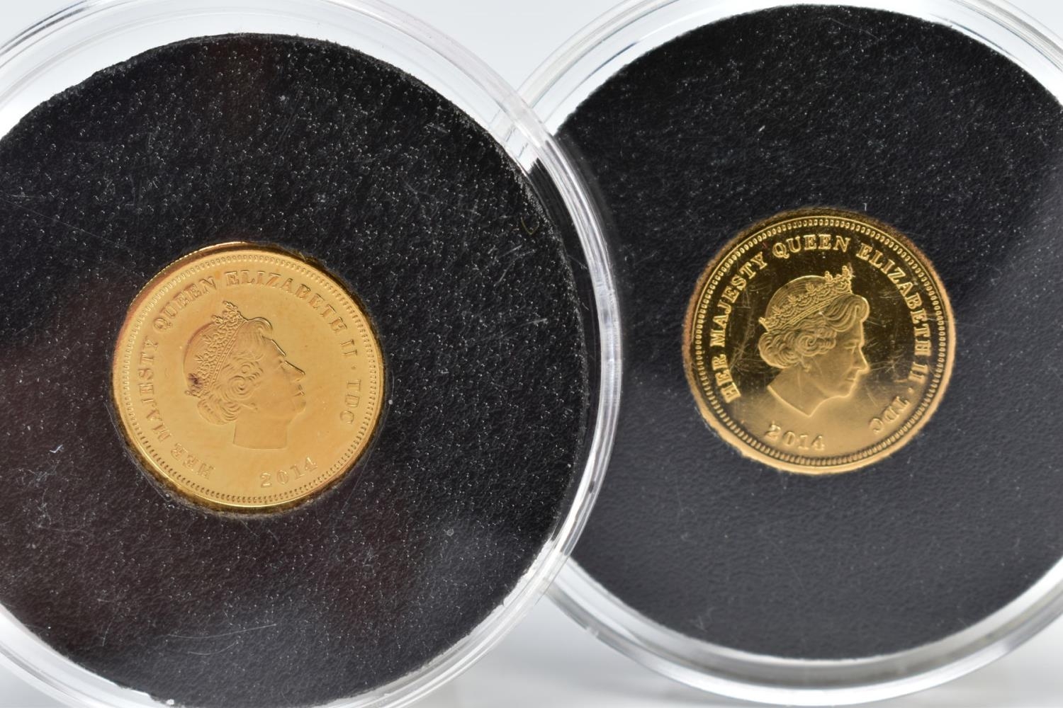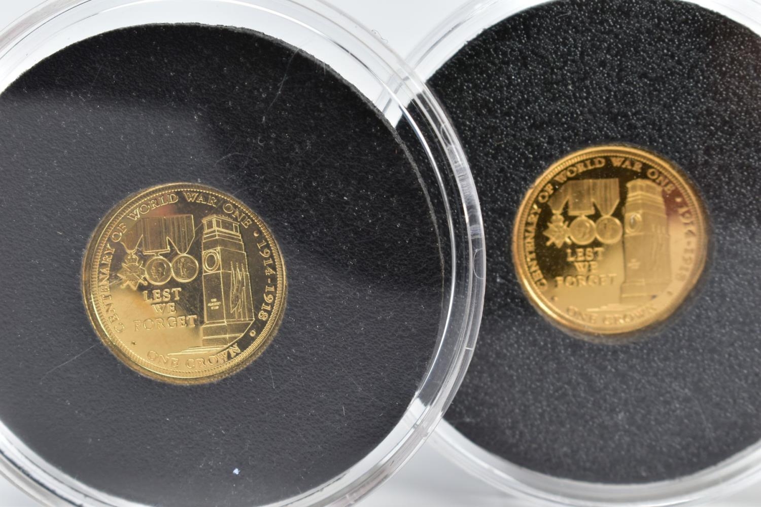 TWO 22CT GOLD COINS, each coin inscribed 'Centeneray of World War One, 1914-1918' one crown, Queen Elizabeth II to the reverse 2014, each within a clear plastic protective case