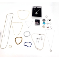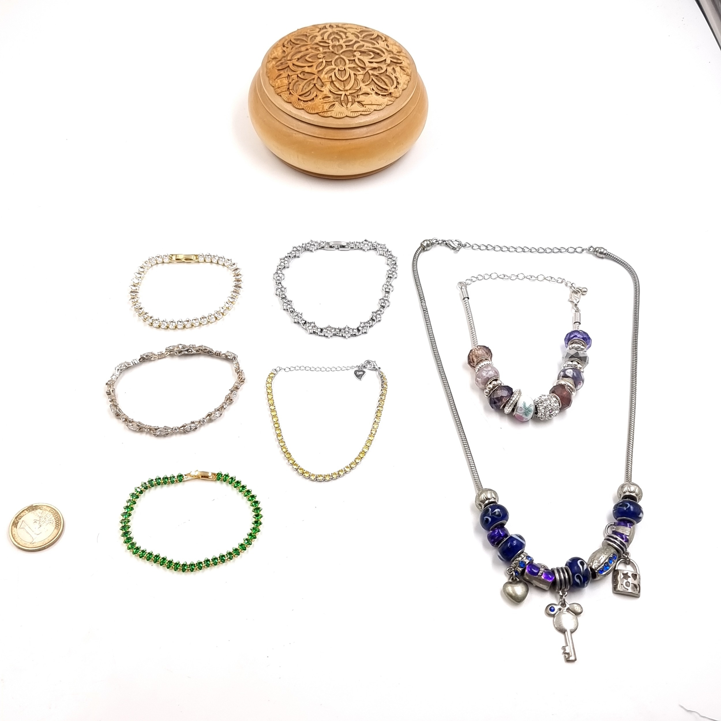 A collection of gem set bracelets and necklaces. Includes some silver content. Contained with in a carved wooden jewelry box.