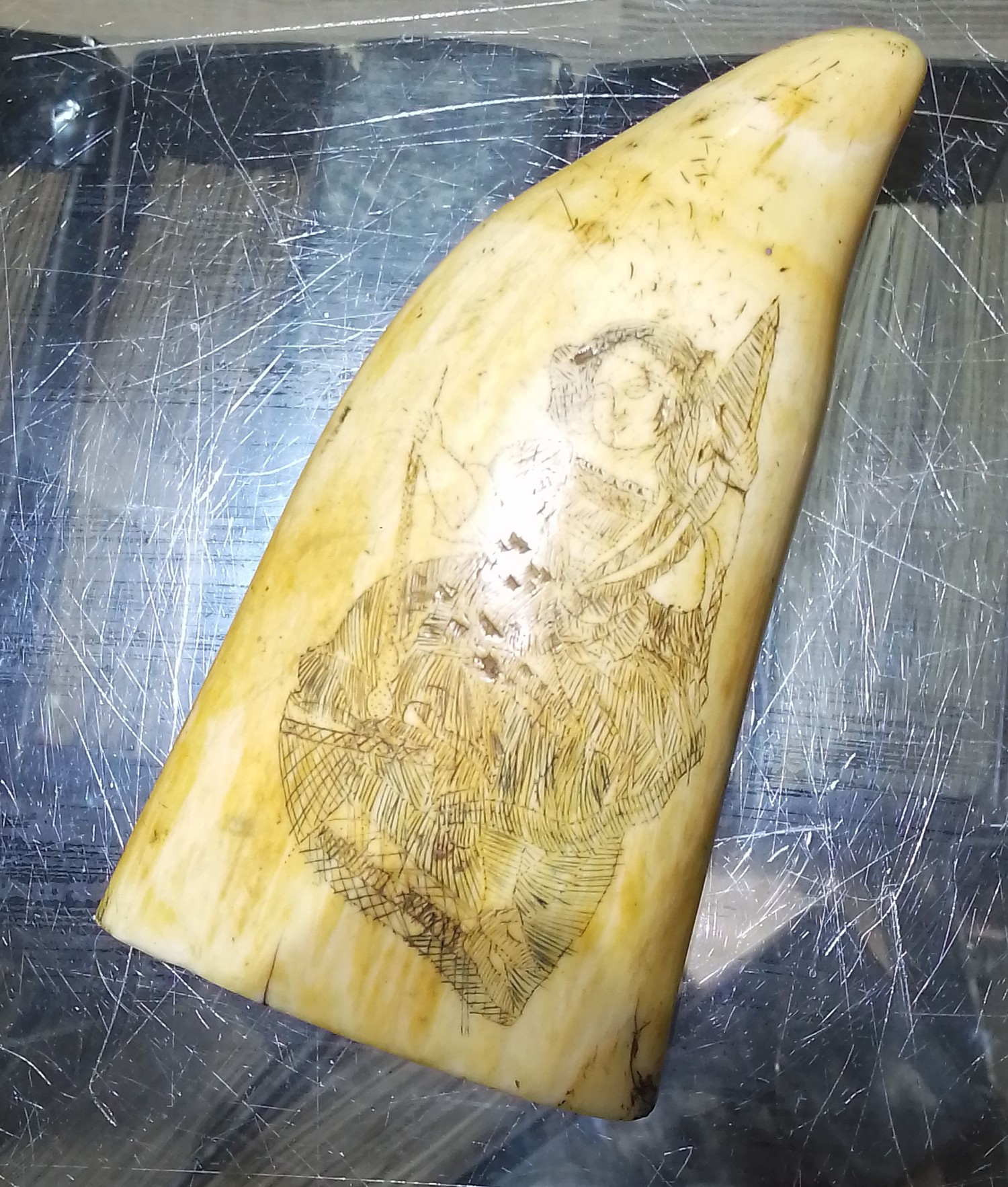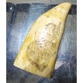 A 19th century sailor's whale tooth scrimshaw, the carving depicting a lady wearing a dress with one arm raised, length 14cm.