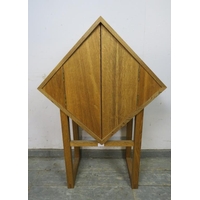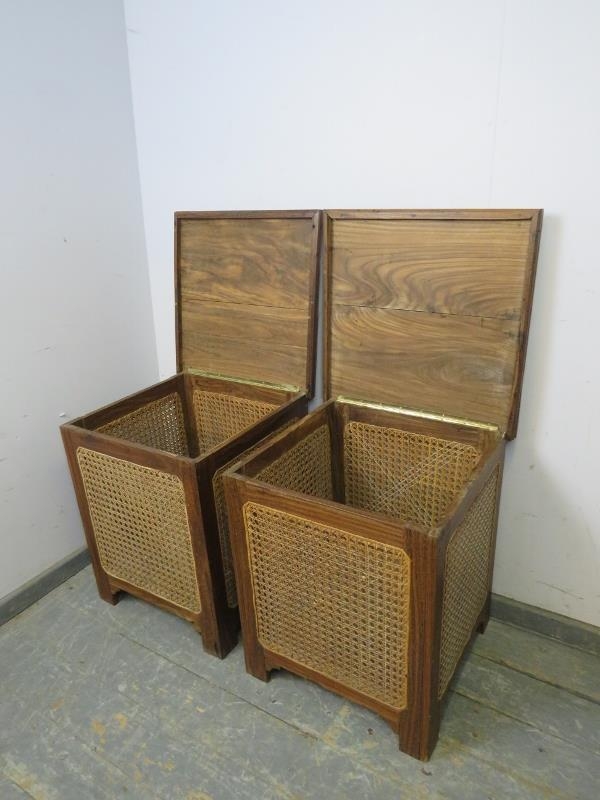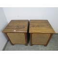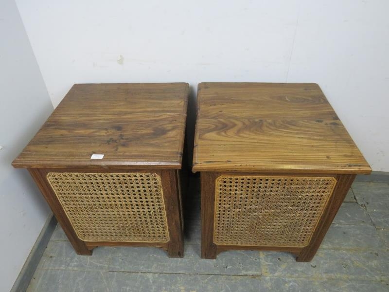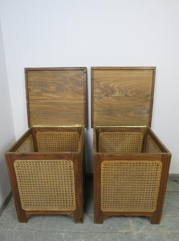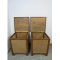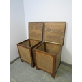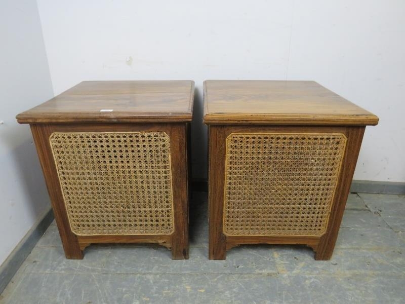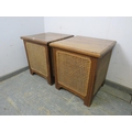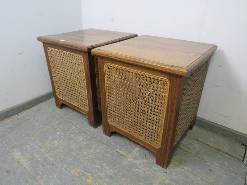 A pair of hardwood side cabinets with double skin bergère panels, the hinged lids opening onto storage wells, on bracket feet.