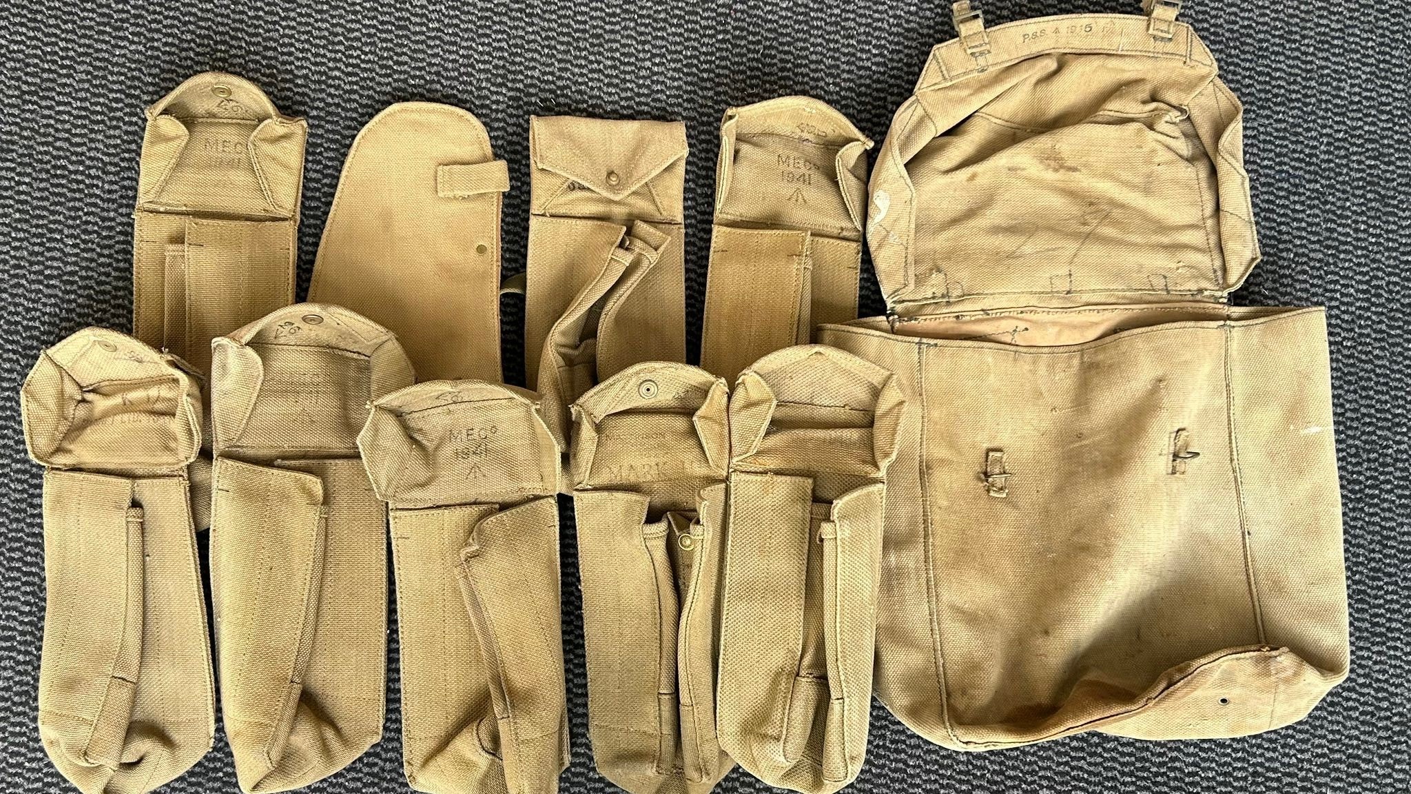 A webbing WW2 radio pack and some other items of webbing equipment GC ) and 8 WW2 dated webbing ammunition pouches in VGC unissued condition.