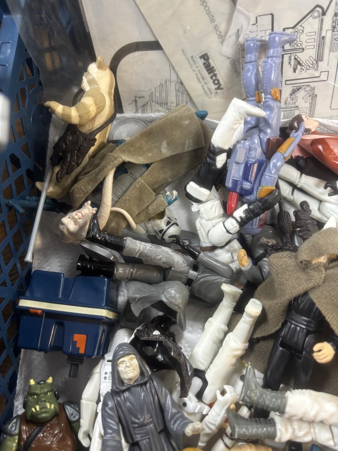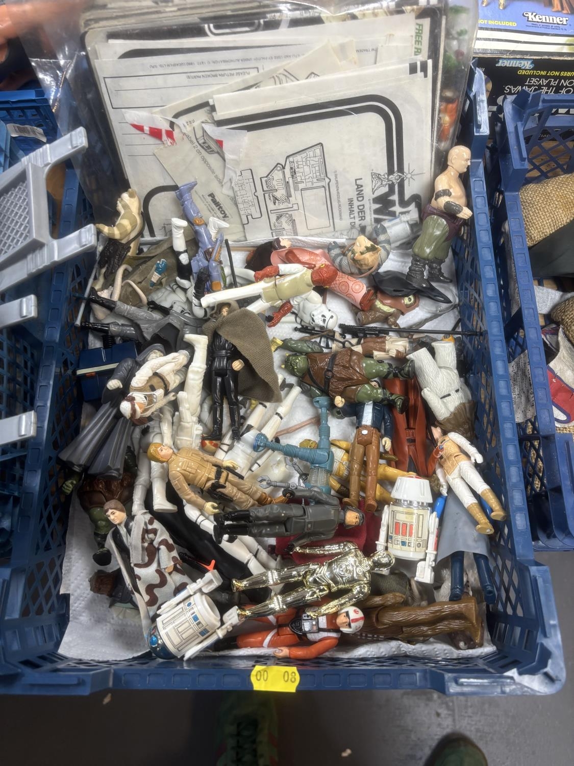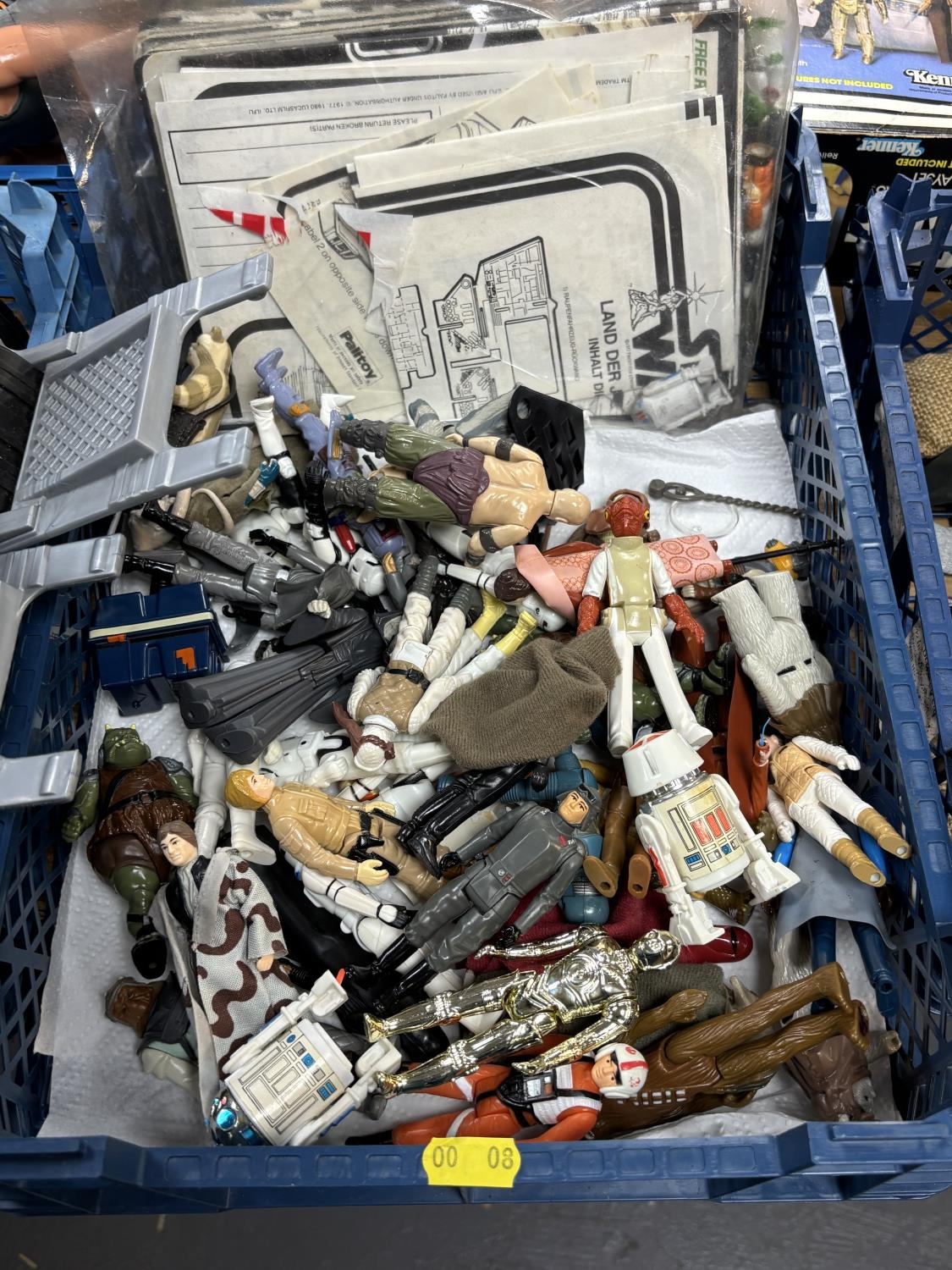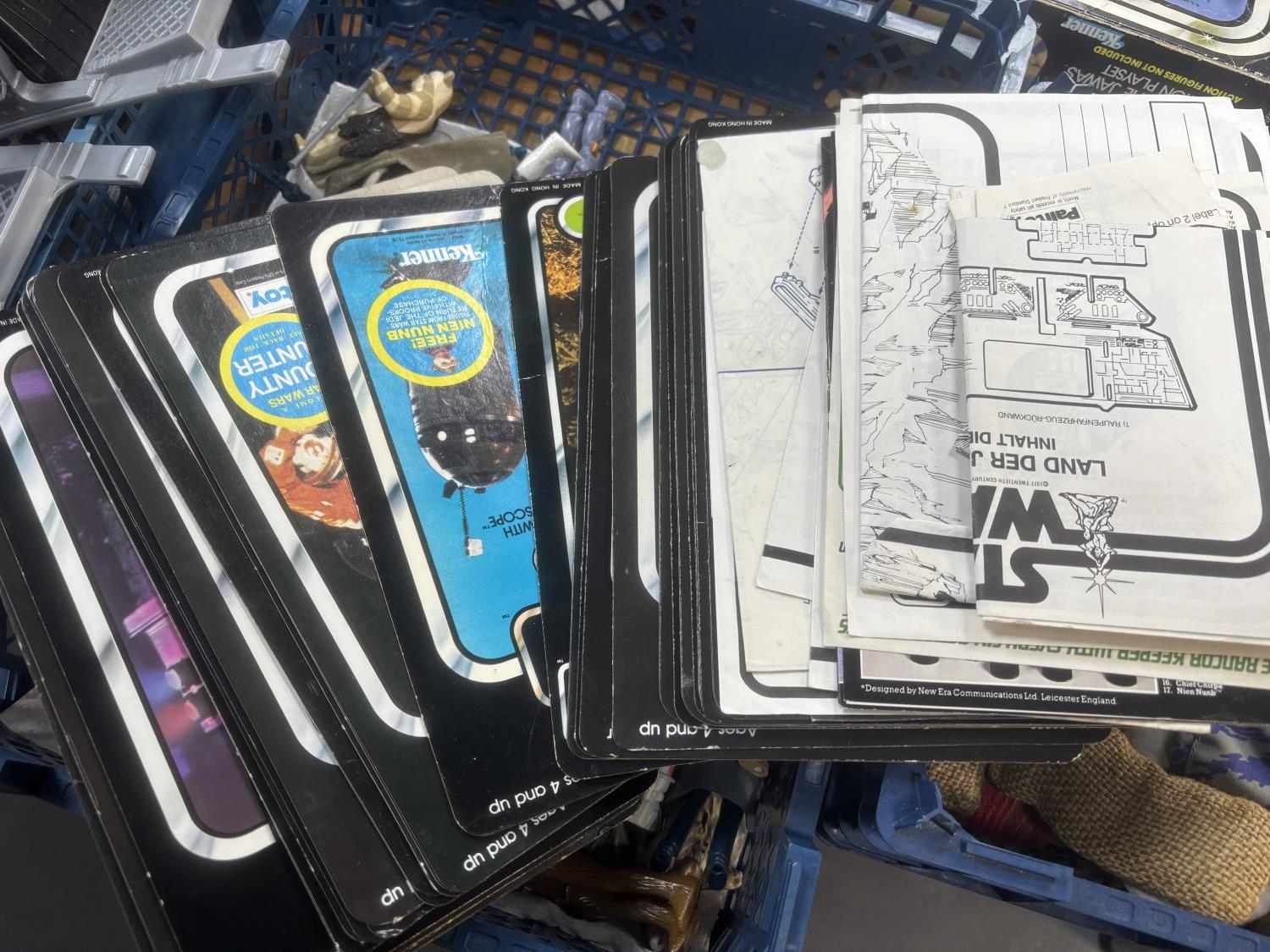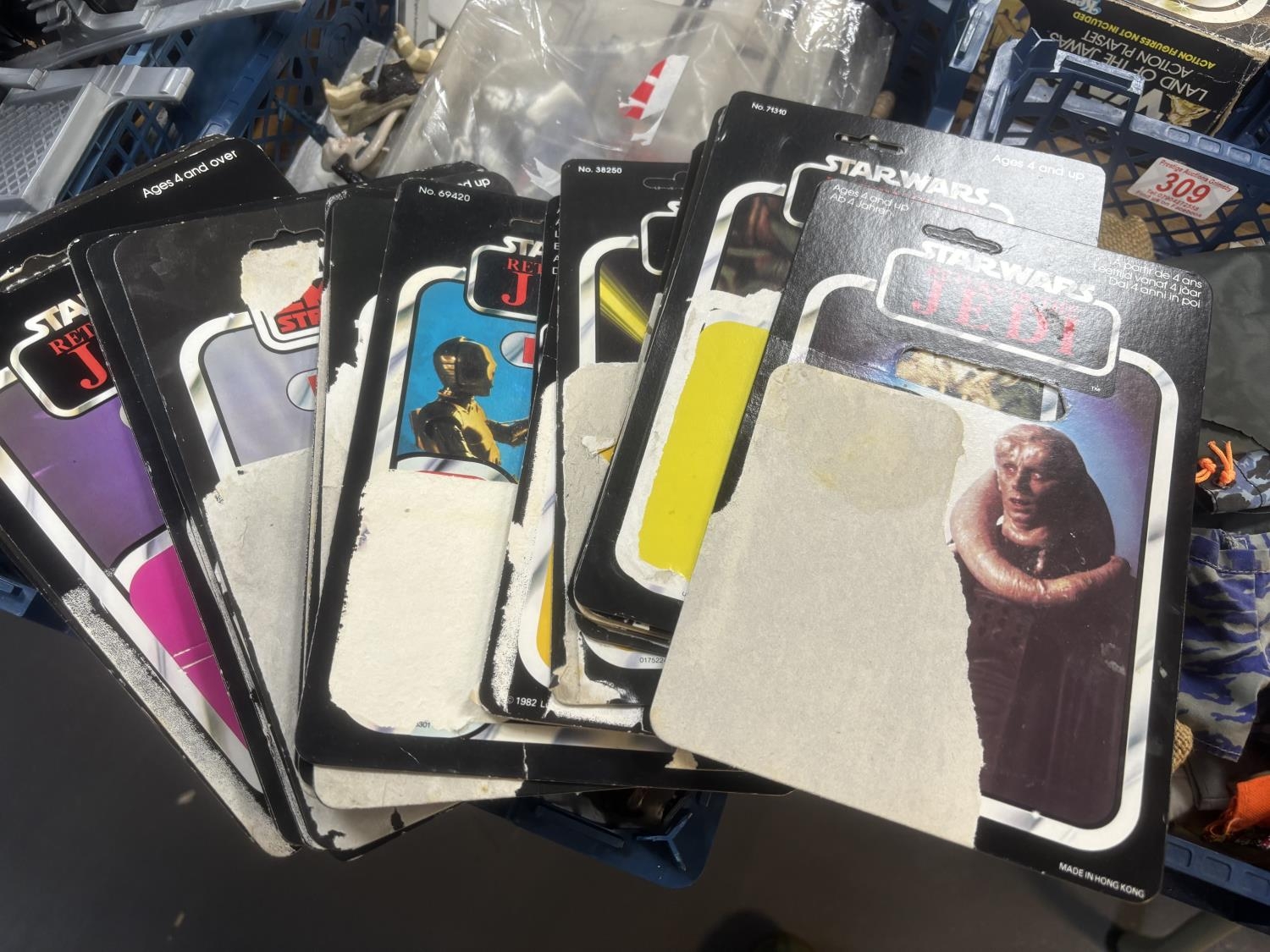 BASKET OF EARLY STAR WARS FIGURES & ACCESSORIES WITH BAG OF ORIGINAL BACK BOARDS THAT THE FIGURES WOULD HAVE ORIGINALLY BEEN ON PLEASE SEE PICTURES FOR DETAILS
