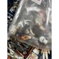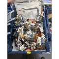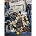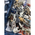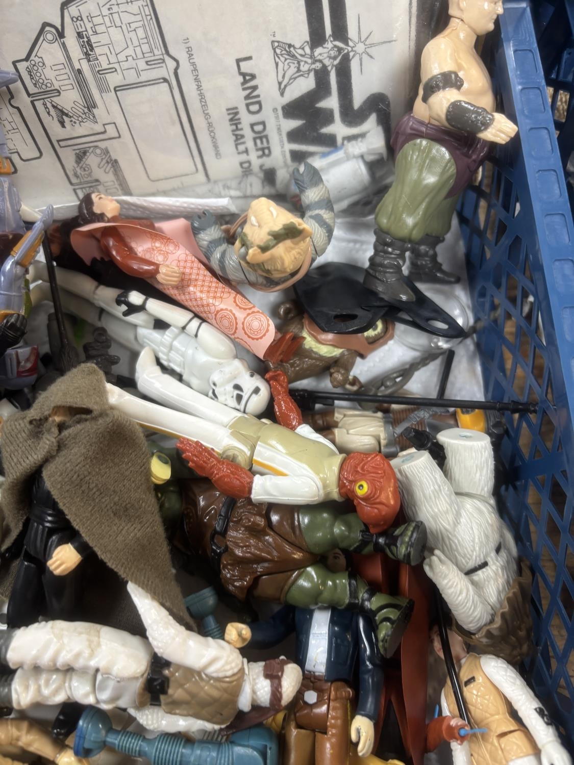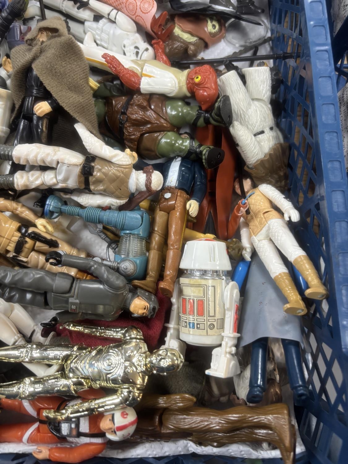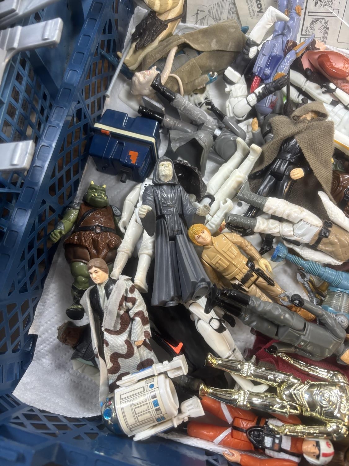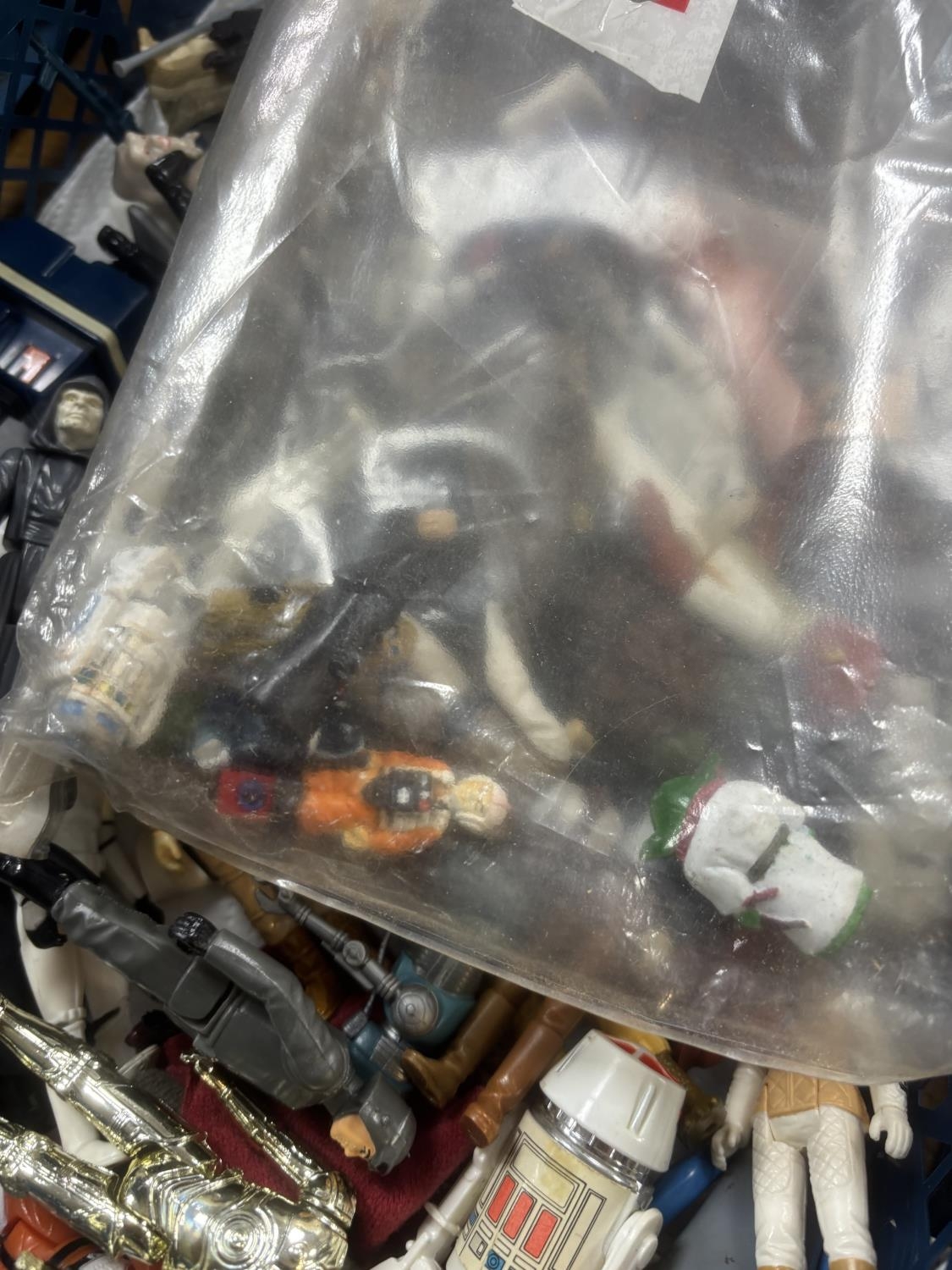 BASKET OF EARLY STAR WARS FIGURES & ACCESSORIES WITH BAG OF ORIGINAL BACK BOARDS THAT THE FIGURES WOULD HAVE ORIGINALLY BEEN ON PLEASE SEE PICTURES FOR DETAILS