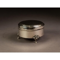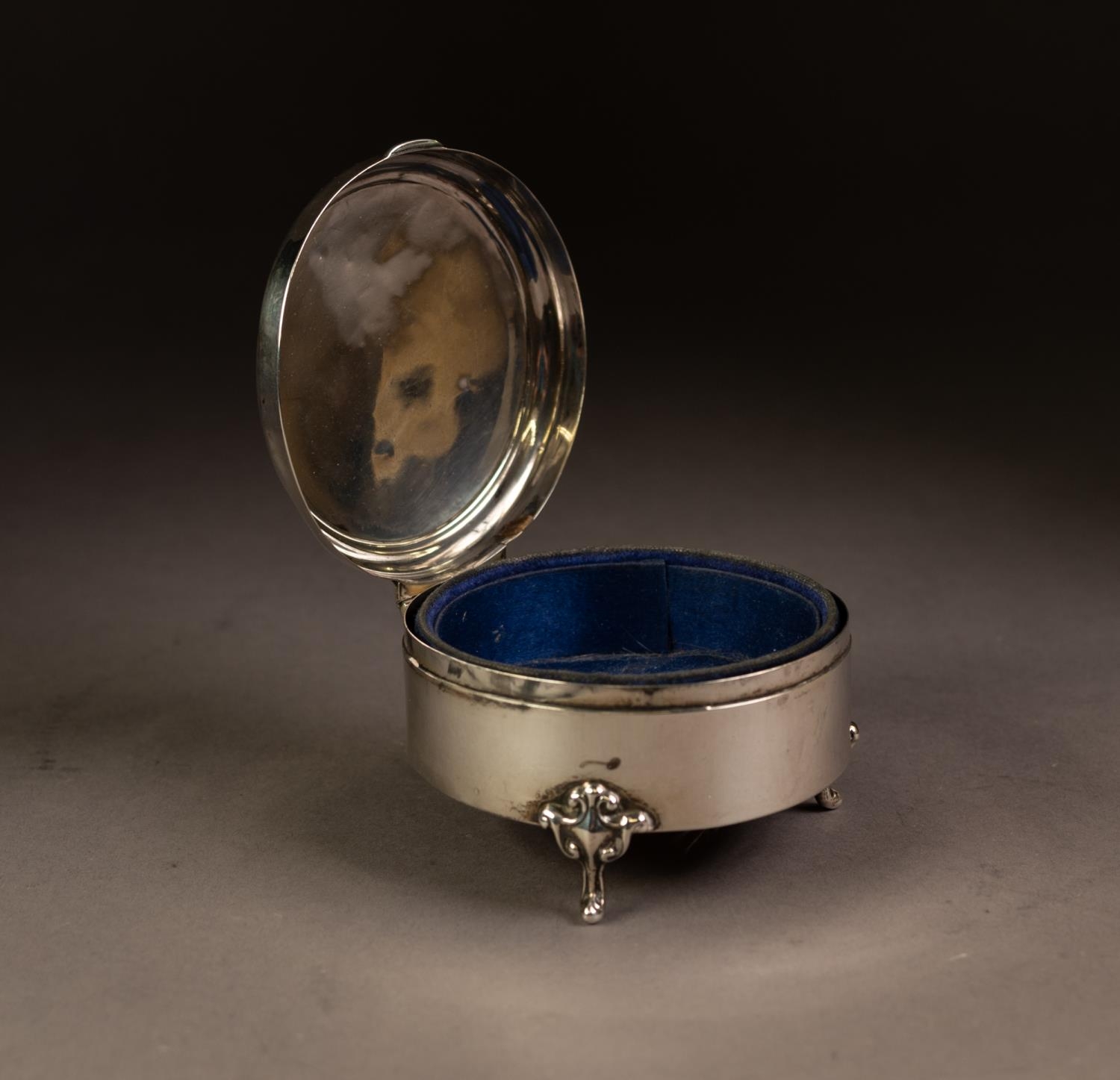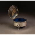 GEORGE V SILVER TRINKET BOX, of circular form with Greek key border to the hinged top, blue silk lined interior and fancy scroll feet, 3” (7.6cm) diameter, Birmingham 1914, 3.7oz gross