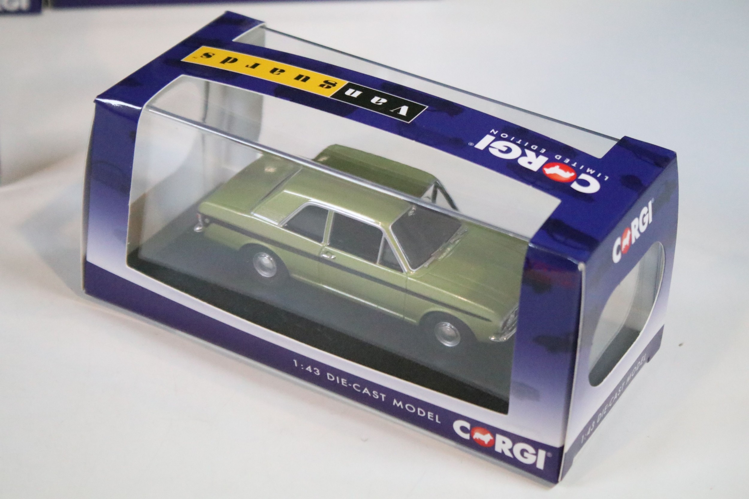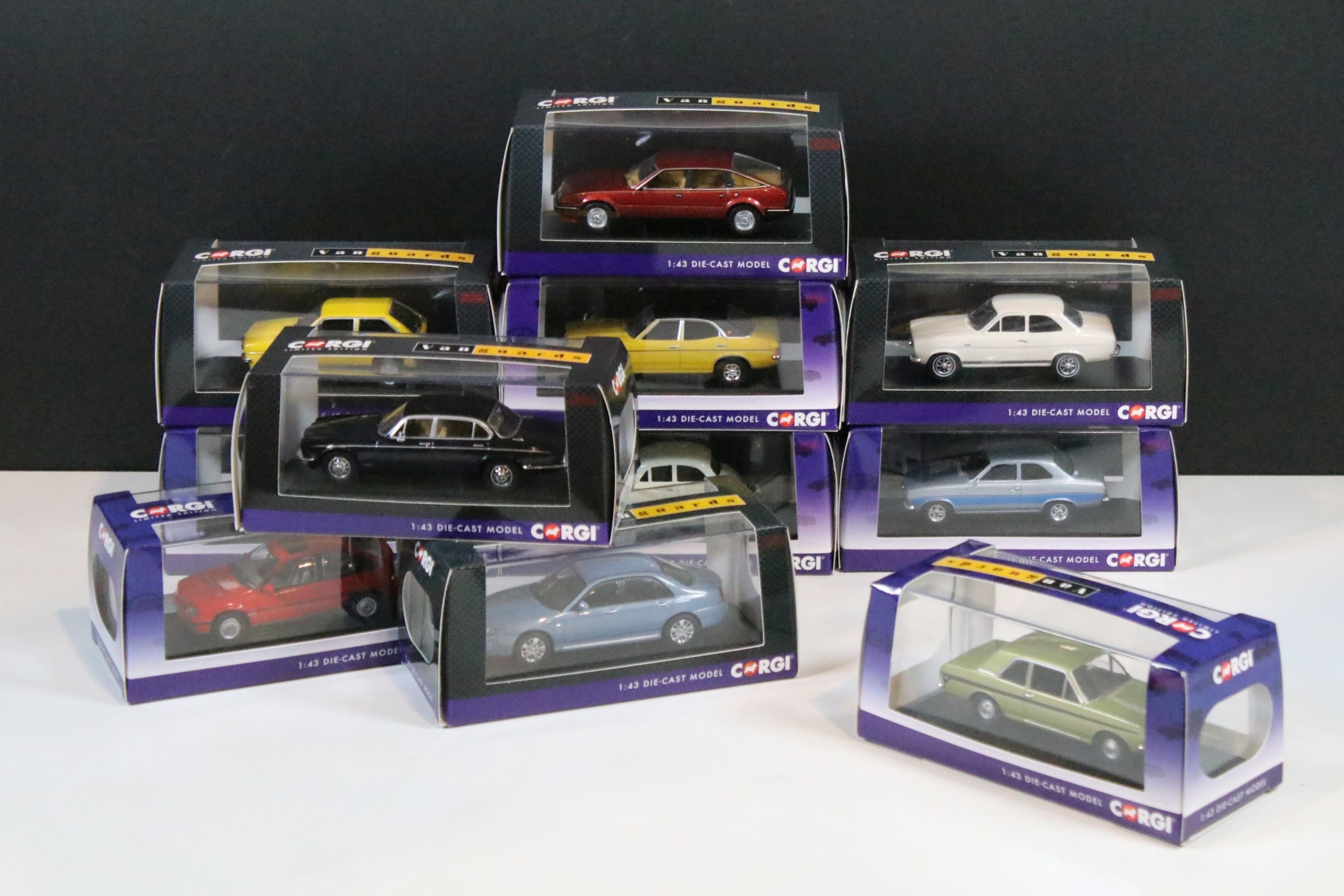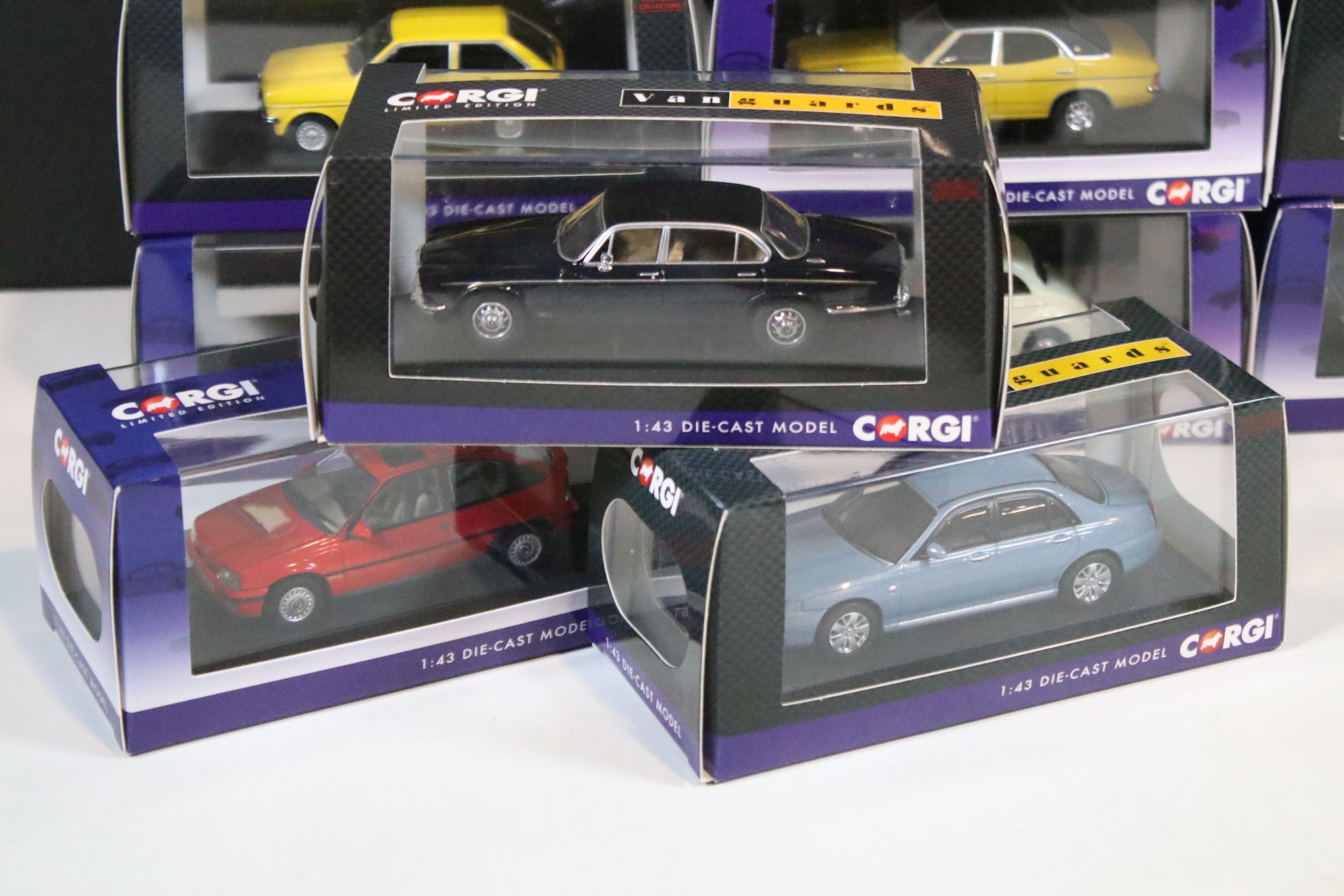 11 Boxed / cased ltd edn Corgi Vanguards diecast models to include VA09206 Rover 75 V6 Contemporary SE Ski Blue, VA13906 Jaguar XJ6 Series 2 4.2 Litre Dark Blue, VA13208 Vauxhall Astra GTE 16V Carmine Red, VA04121 Ford Cortina Mk2 Lotus Fern Green, VA09530 Ford Escort Mk1 RS2000 Stardust Silver, VA09015 Rover 3500 SE SD1 Oporto Red, VA10320 Ford Cortina Mk3 2.0 GXL Daytona Yellow, etc, all ex