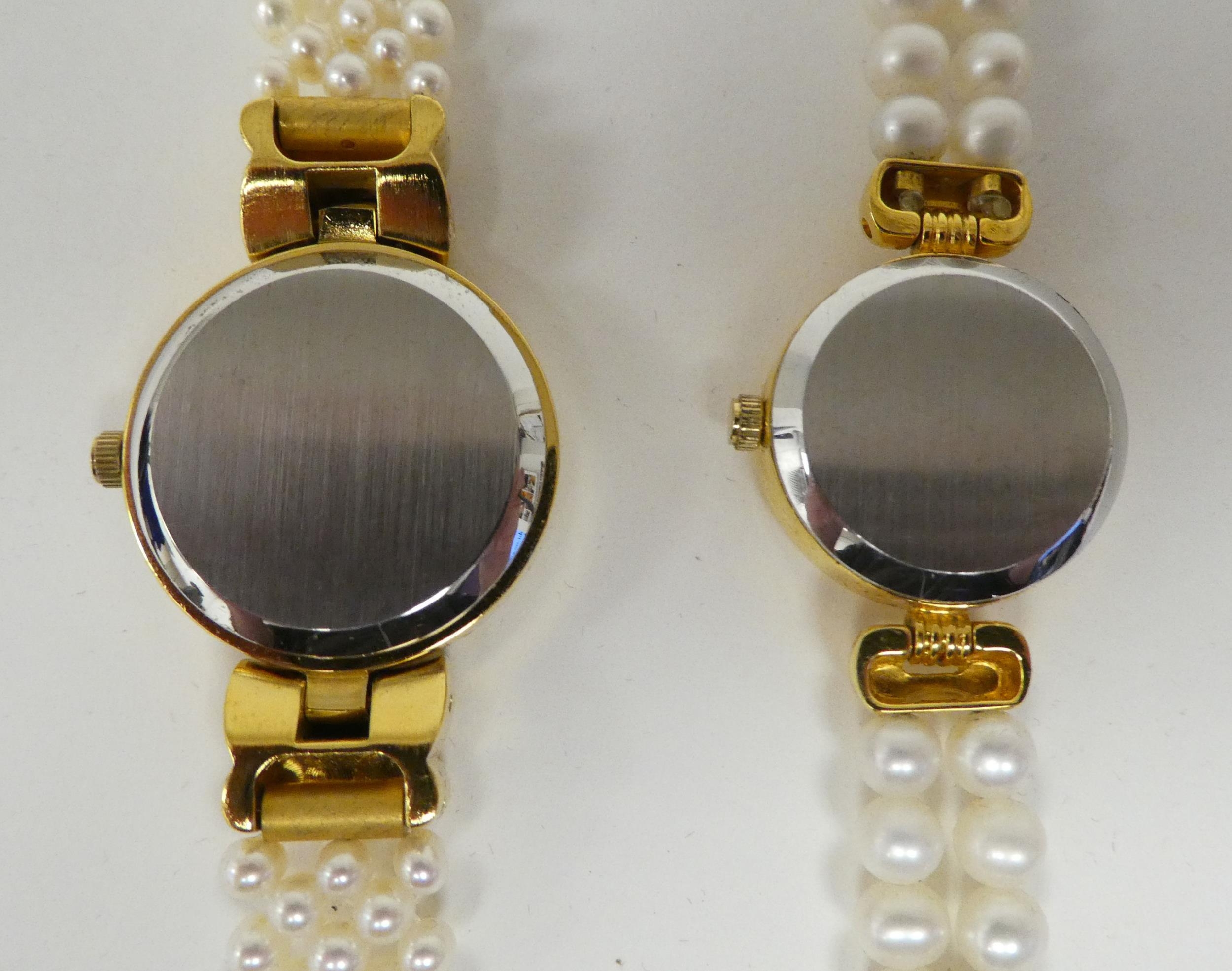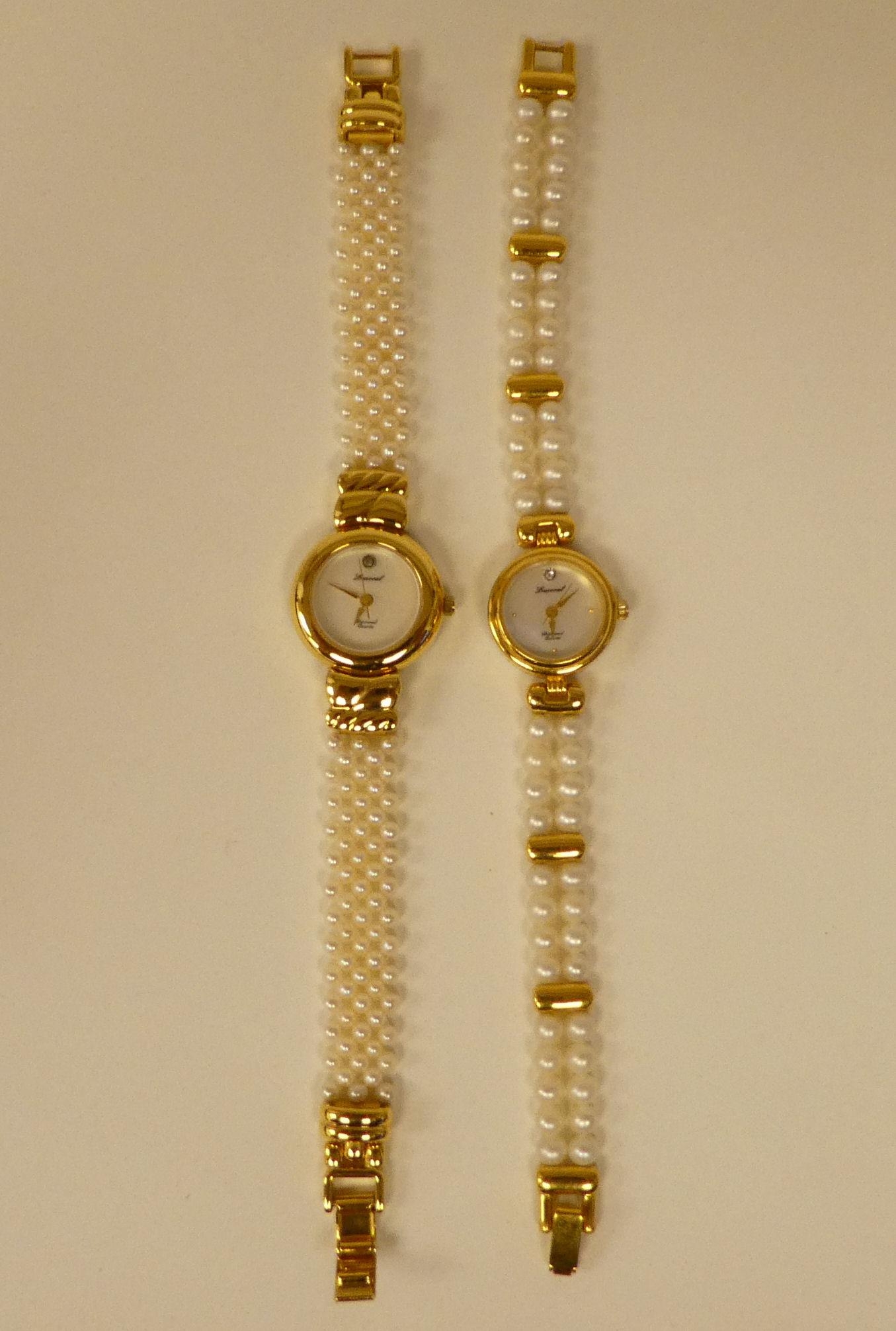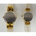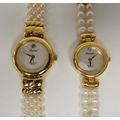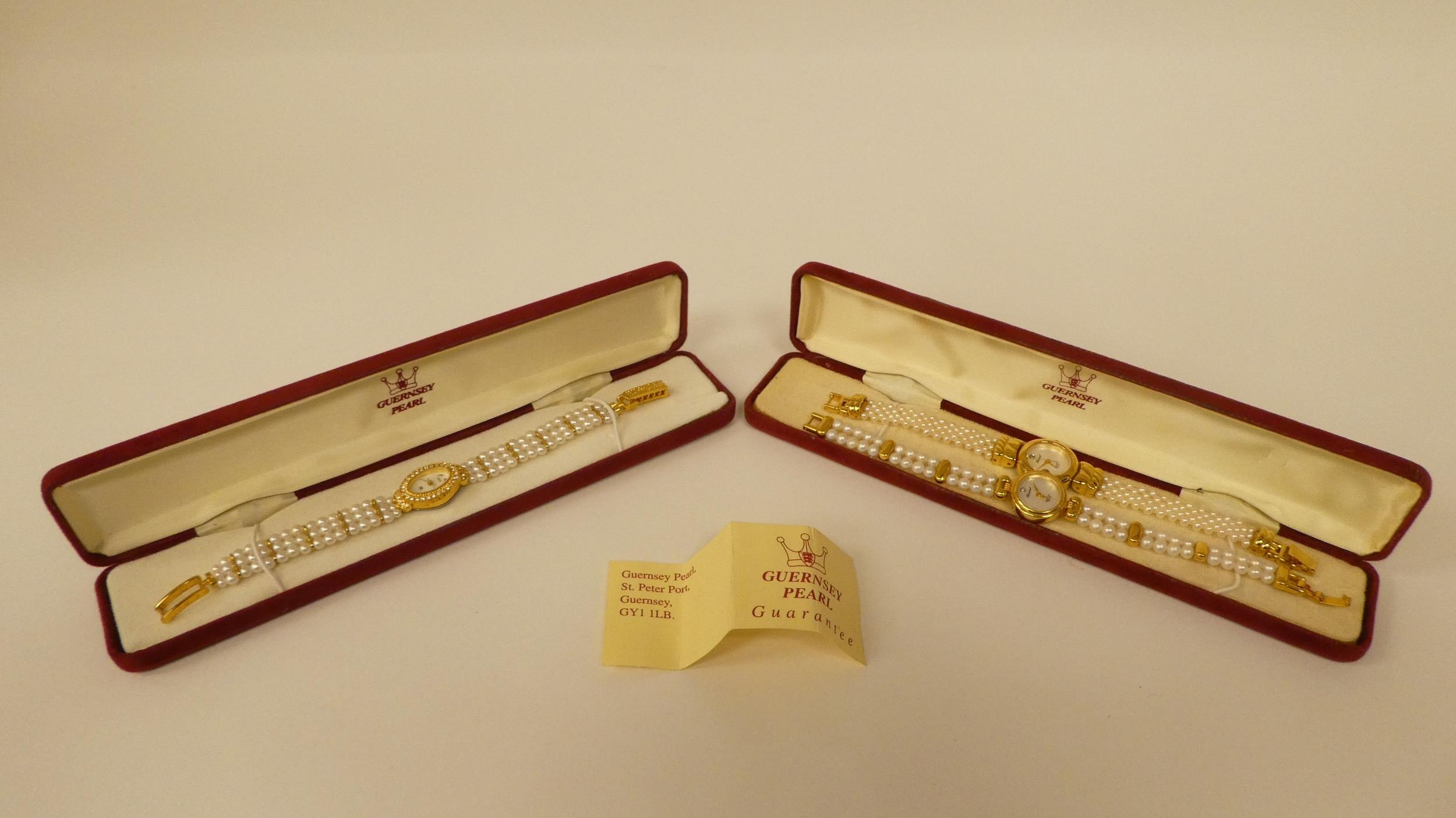 Three ladies Guernsey gold plated and steel cased wristwatches, each pearl set two boxed