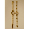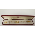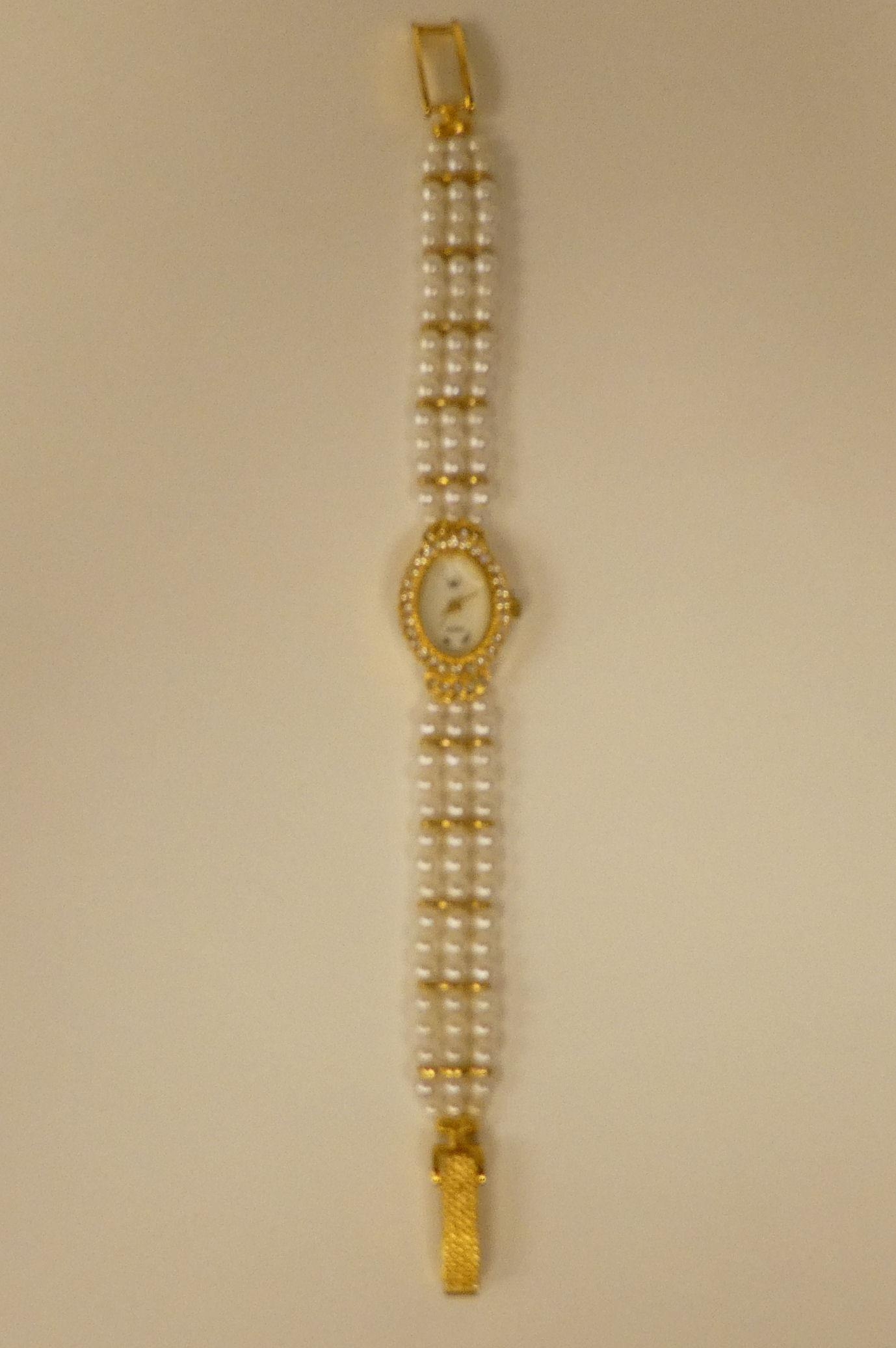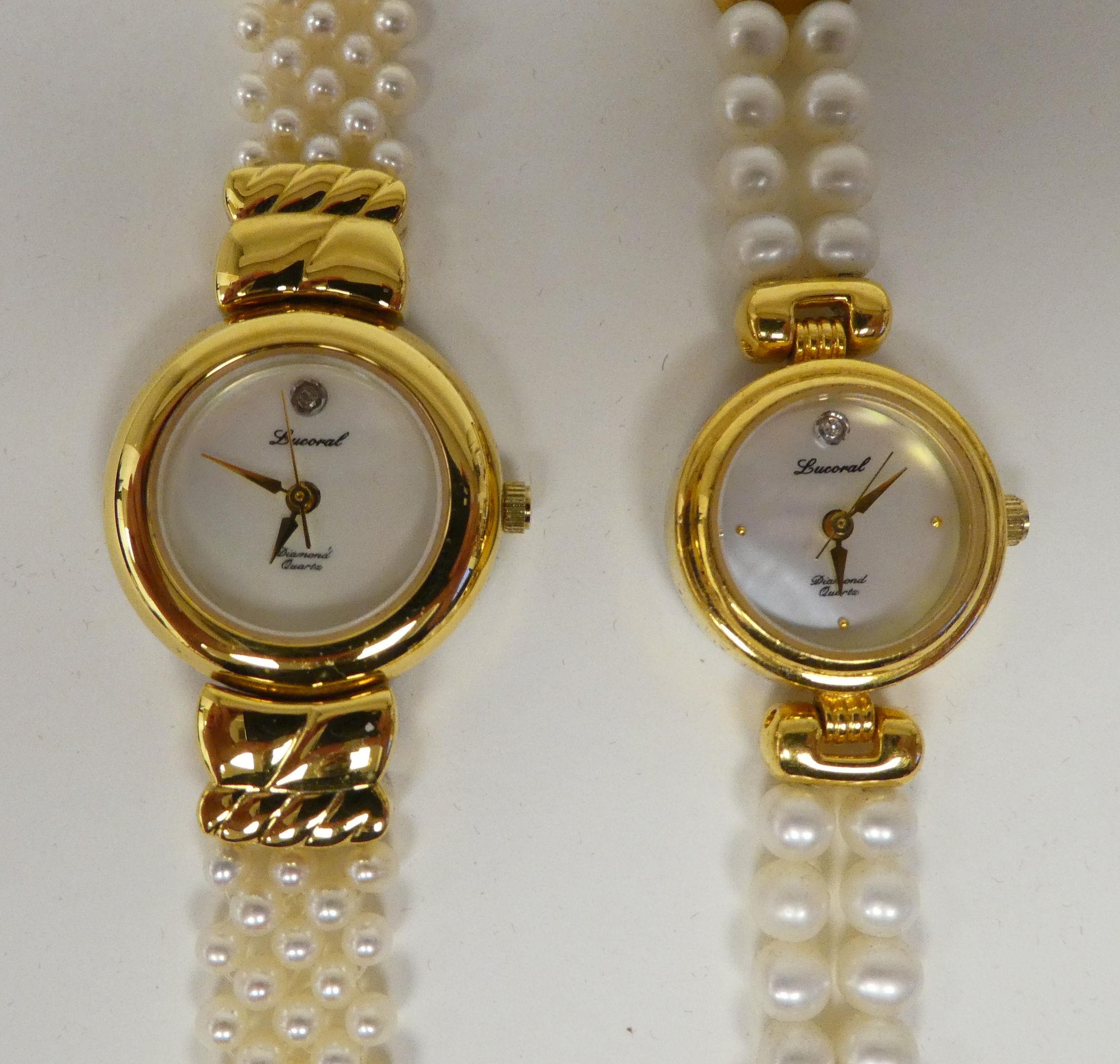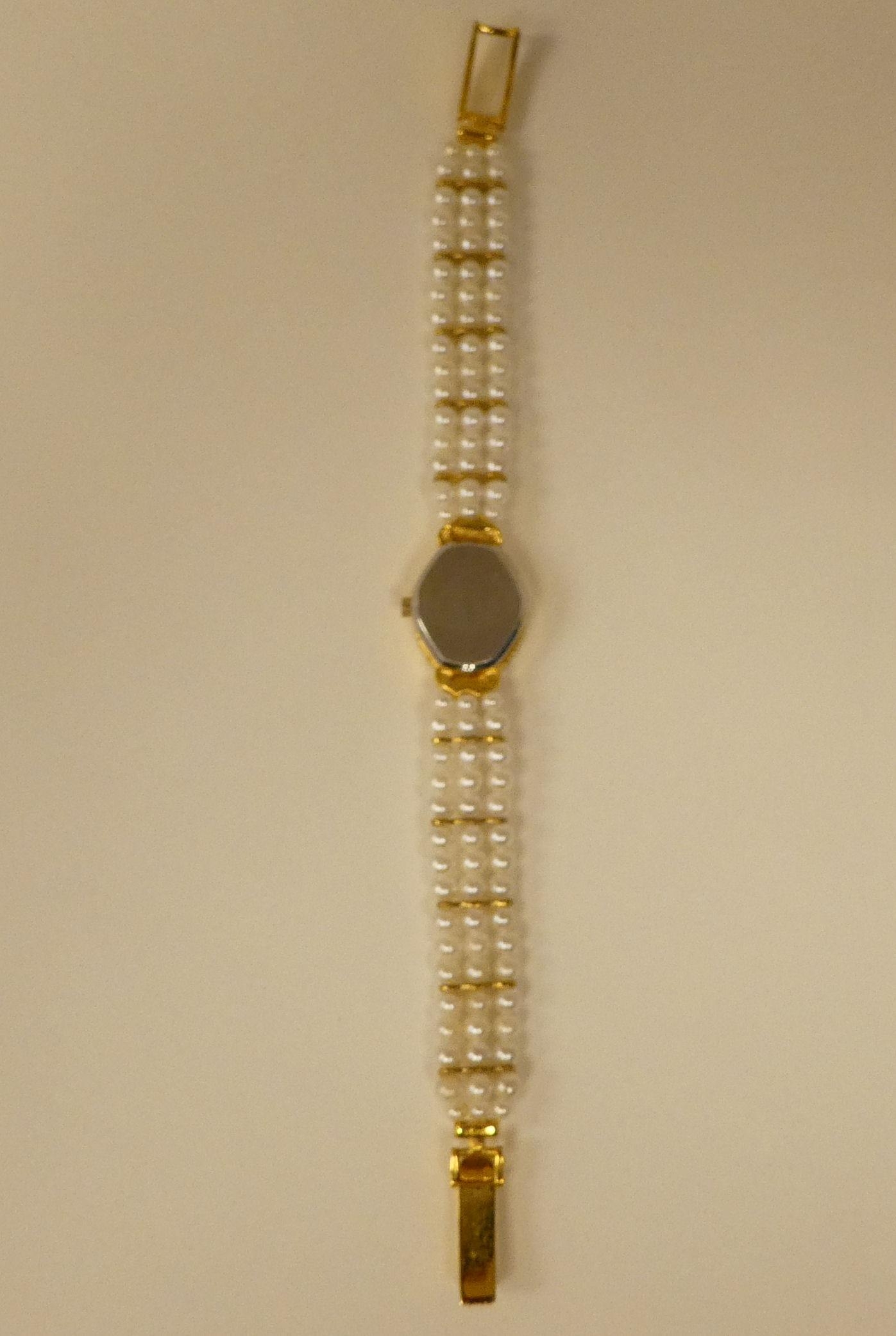 Three ladies Guernsey gold plated and steel cased wristwatches, each pearl set two boxed