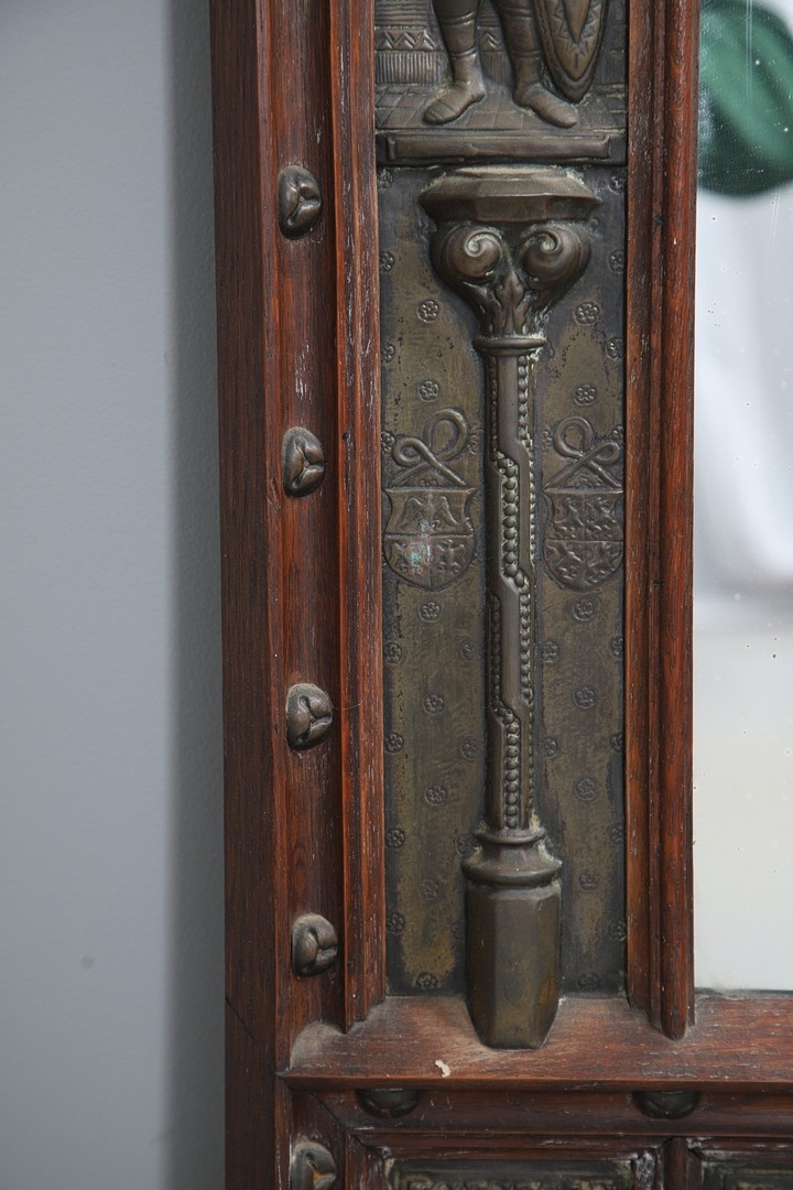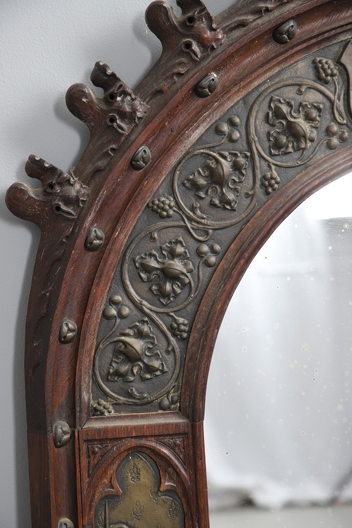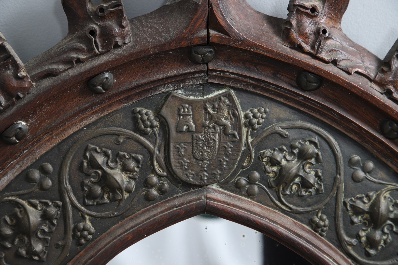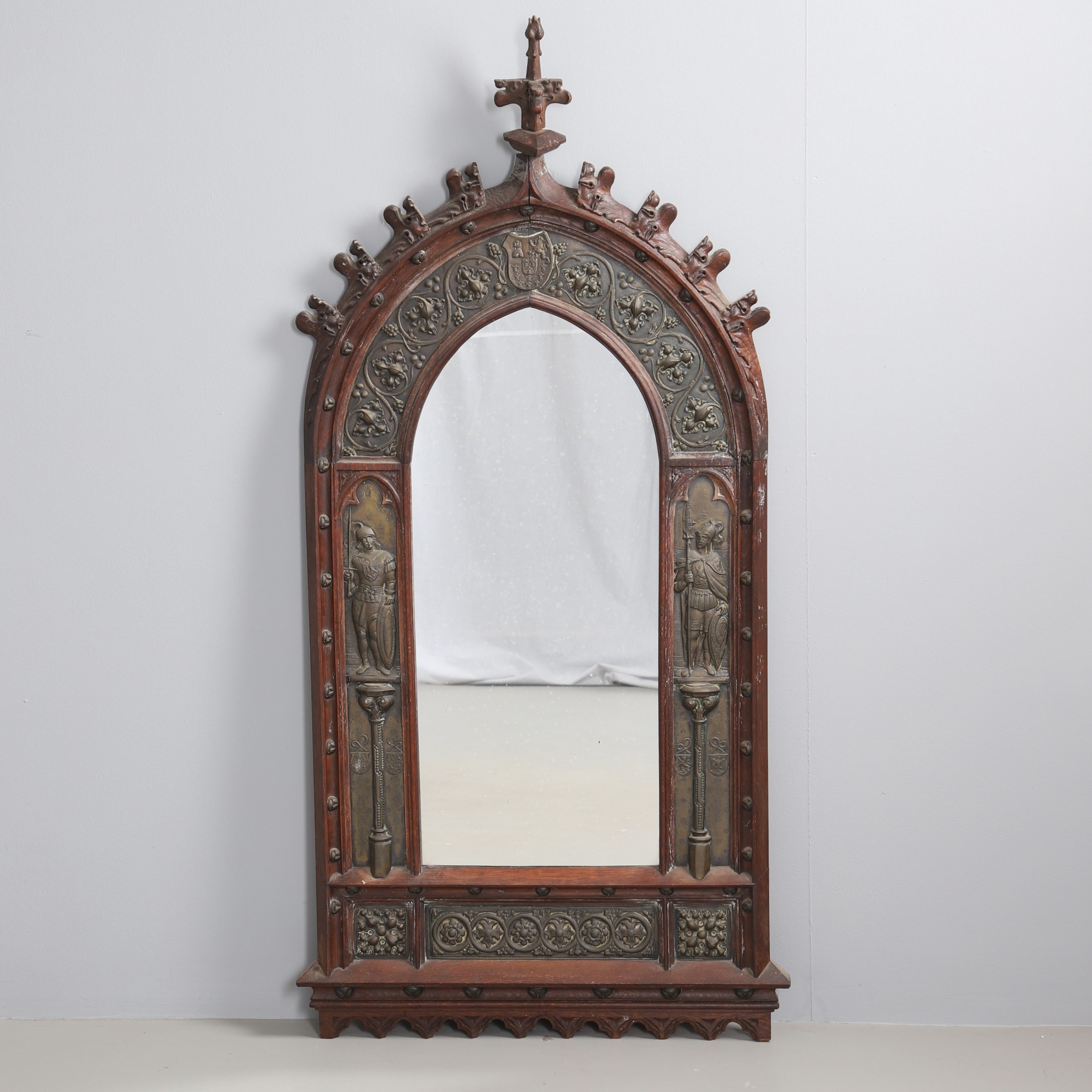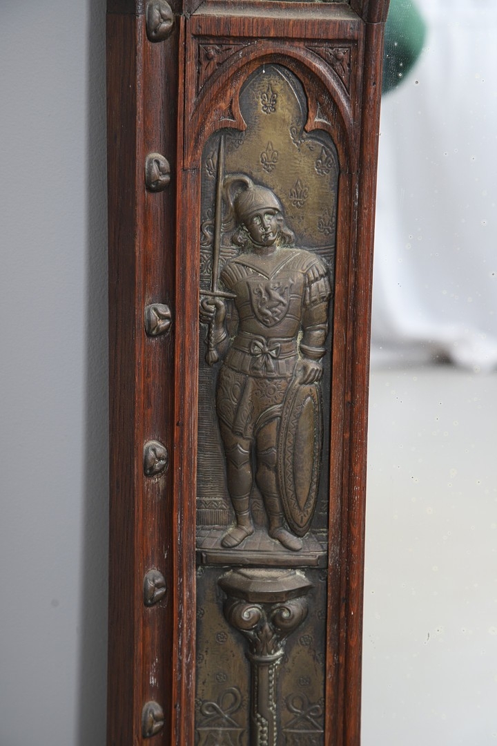A LATE 19TH CENTURY 'GOTHIC' OAK AND BRASS WALL MIRROR. the carved arched surround to pressed brass panels, illustrating knights, a heraldic shield, and stylised foliage, height 146cm, width 71cm.