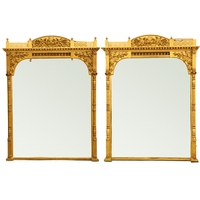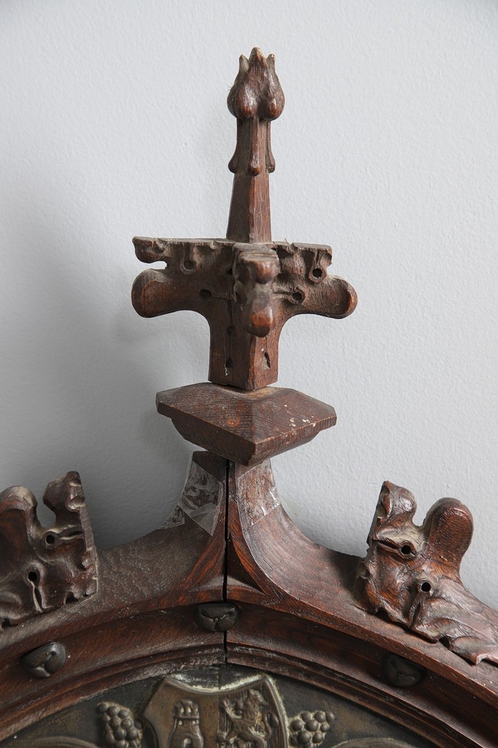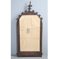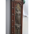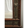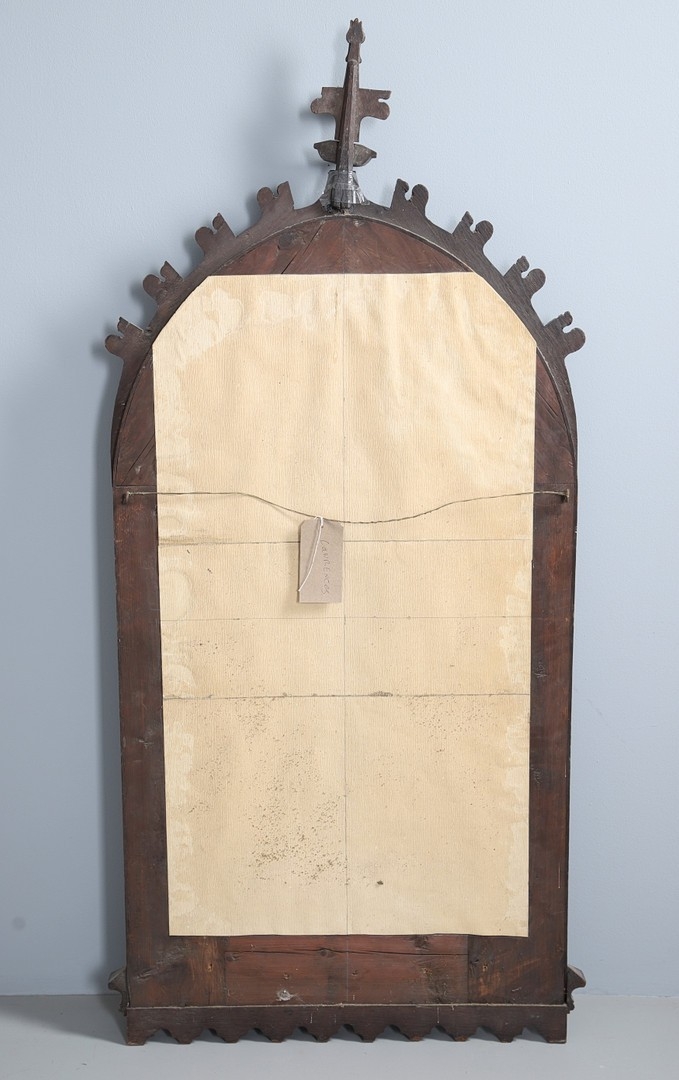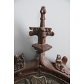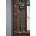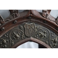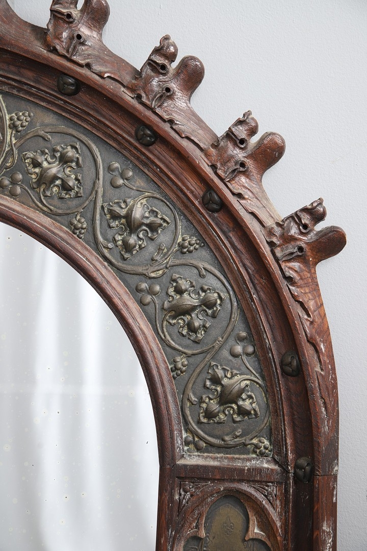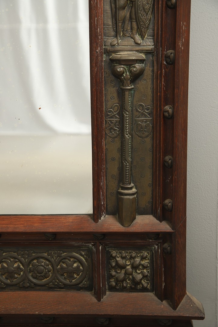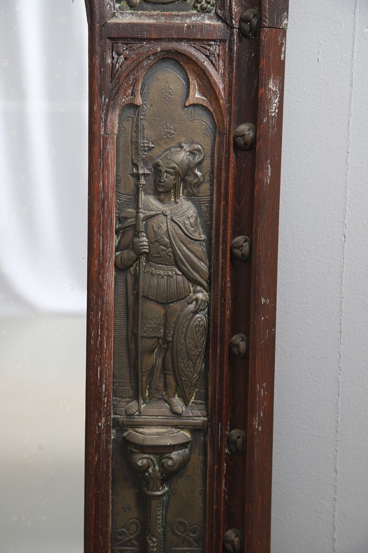A LATE 19TH CENTURY 'GOTHIC' OAK AND BRASS WALL MIRROR. the carved arched surround to pressed brass panels, illustrating knights, a heraldic shield, and stylised foliage, height 146cm, width 71cm.