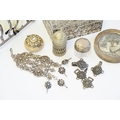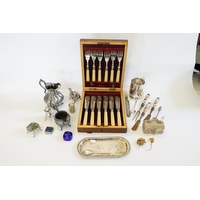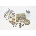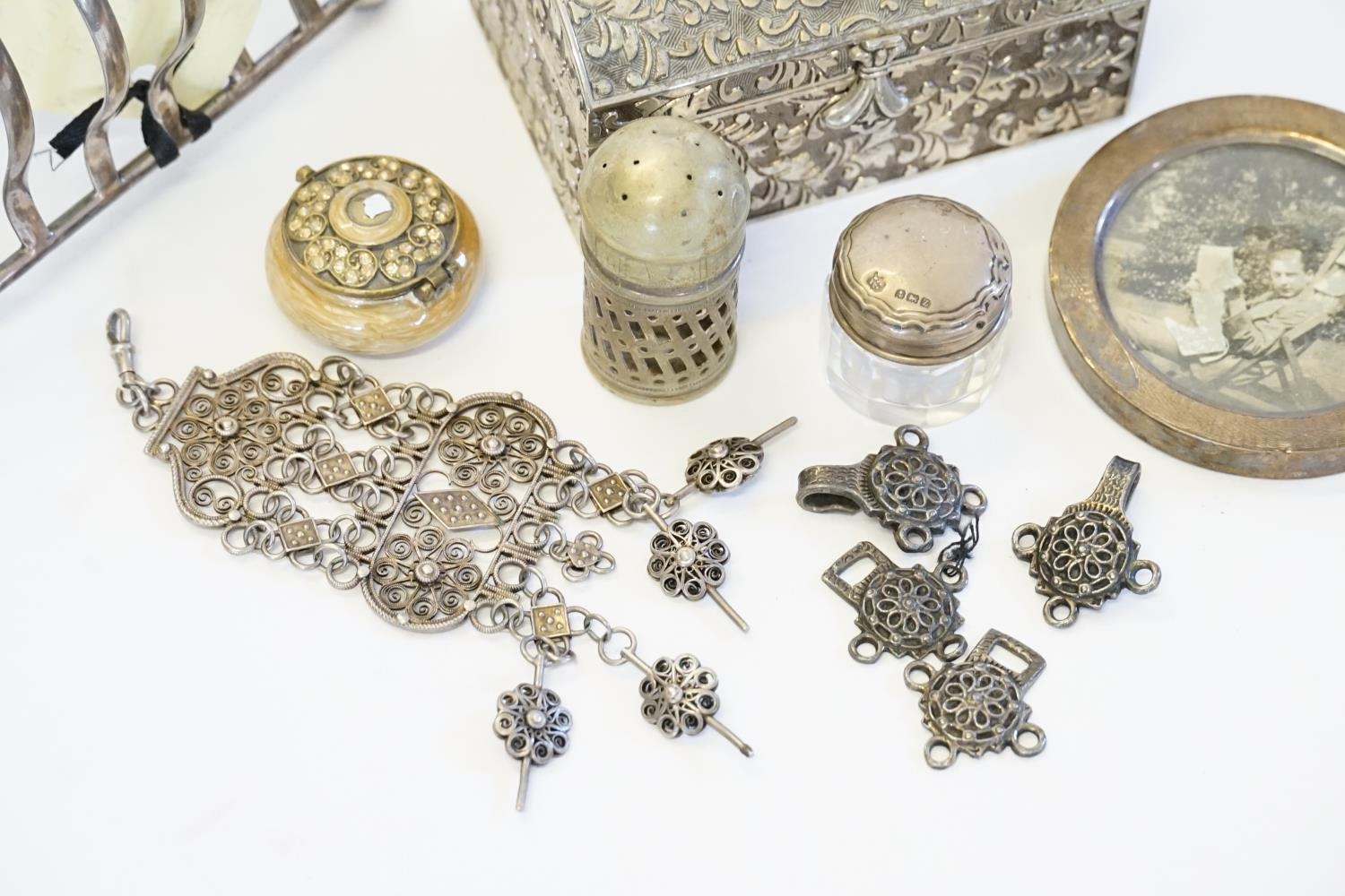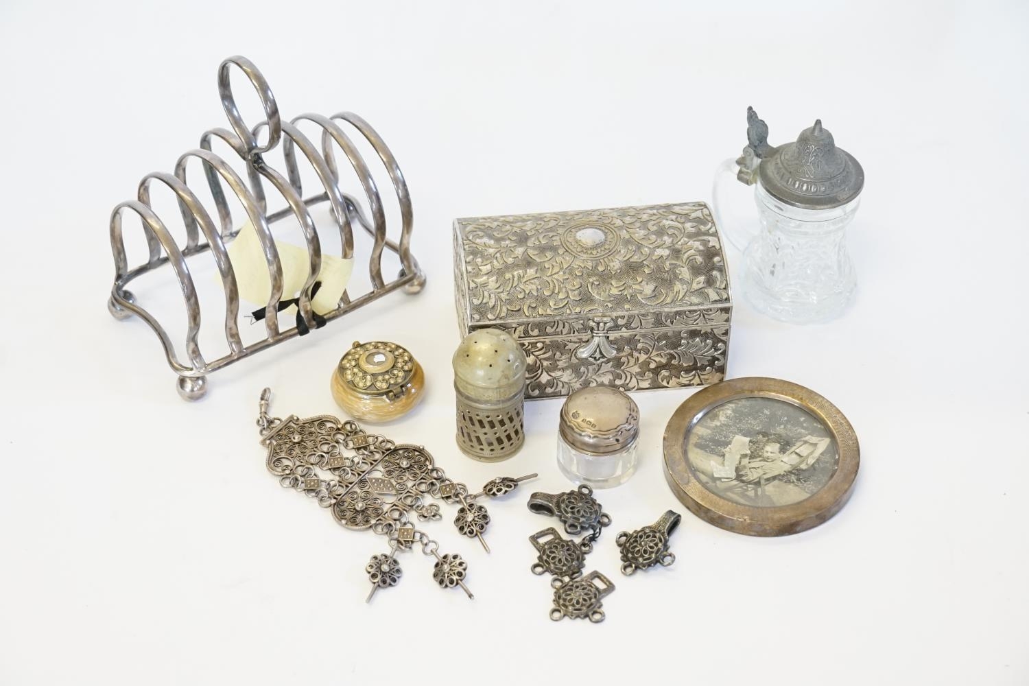 A collection of Silver plate, to include a trinket dish, toast rack, stein, pill box, filigree pendant, and a silver photo frame.