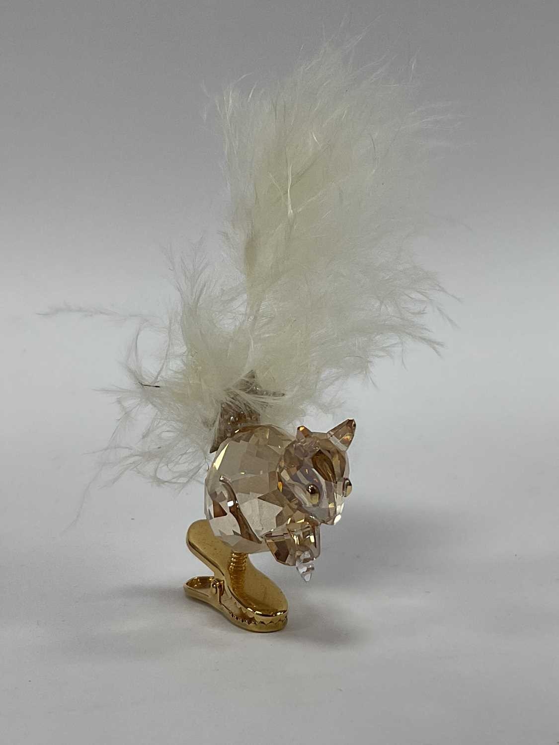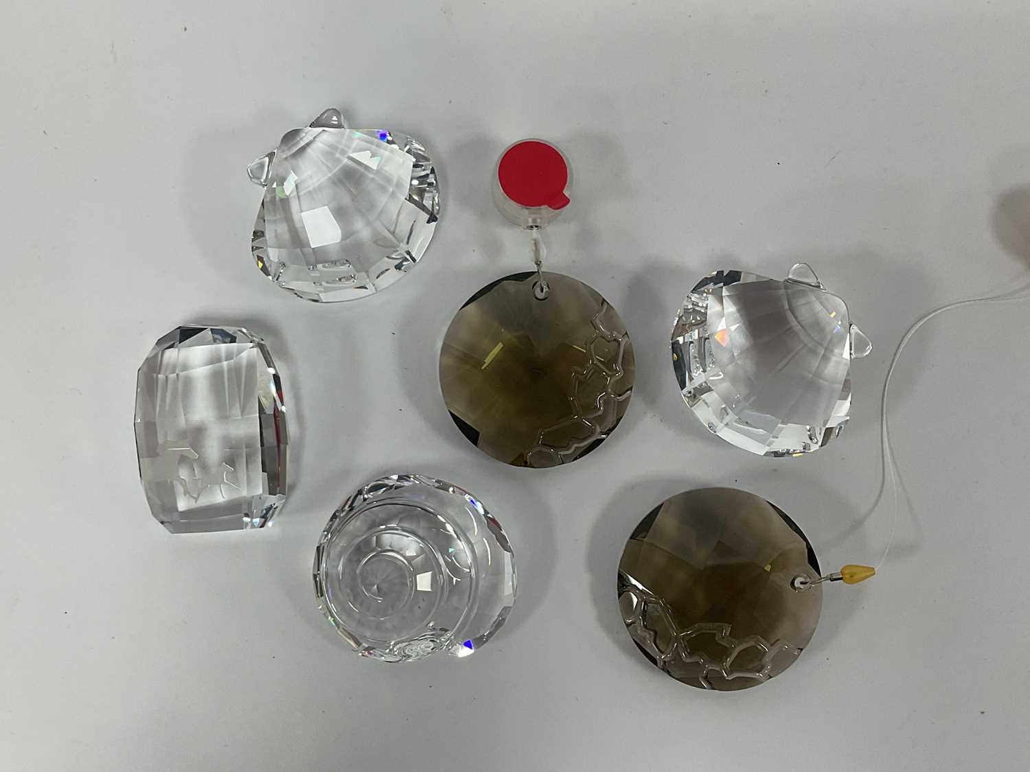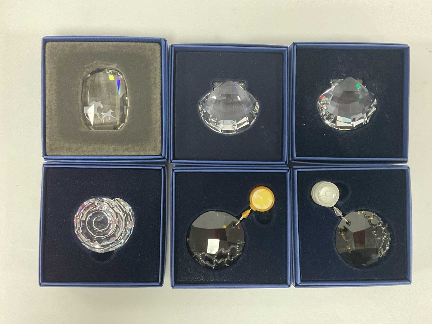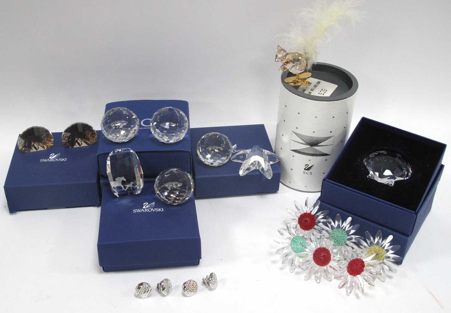 Swarovski Crystals, boxed and loose pieces, including seven boxed (SCS 1993-1995, x2 NR024 Clam, x2 NR156 Sun-catcher, NR458 Horse paperweight, NR065 Top Shell), Winter Squirrel clipper, six Daisies, eight assorted paperweights, four lapel badges:- One Tray.