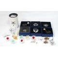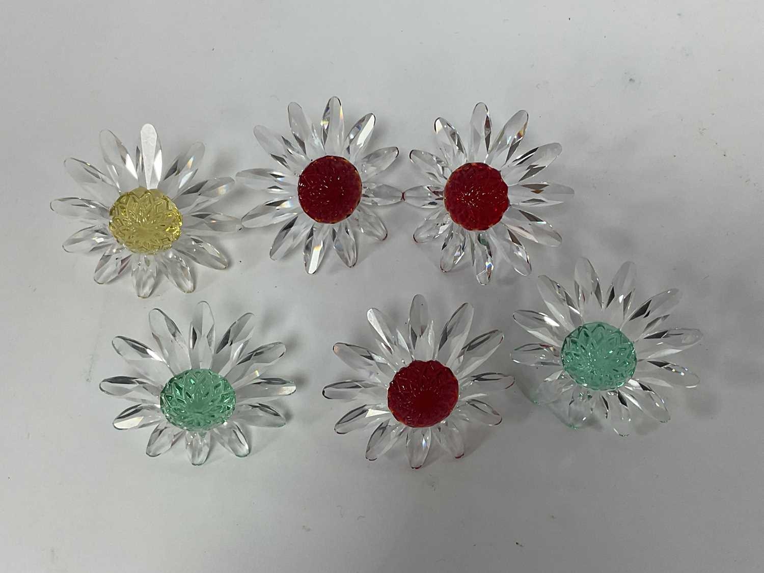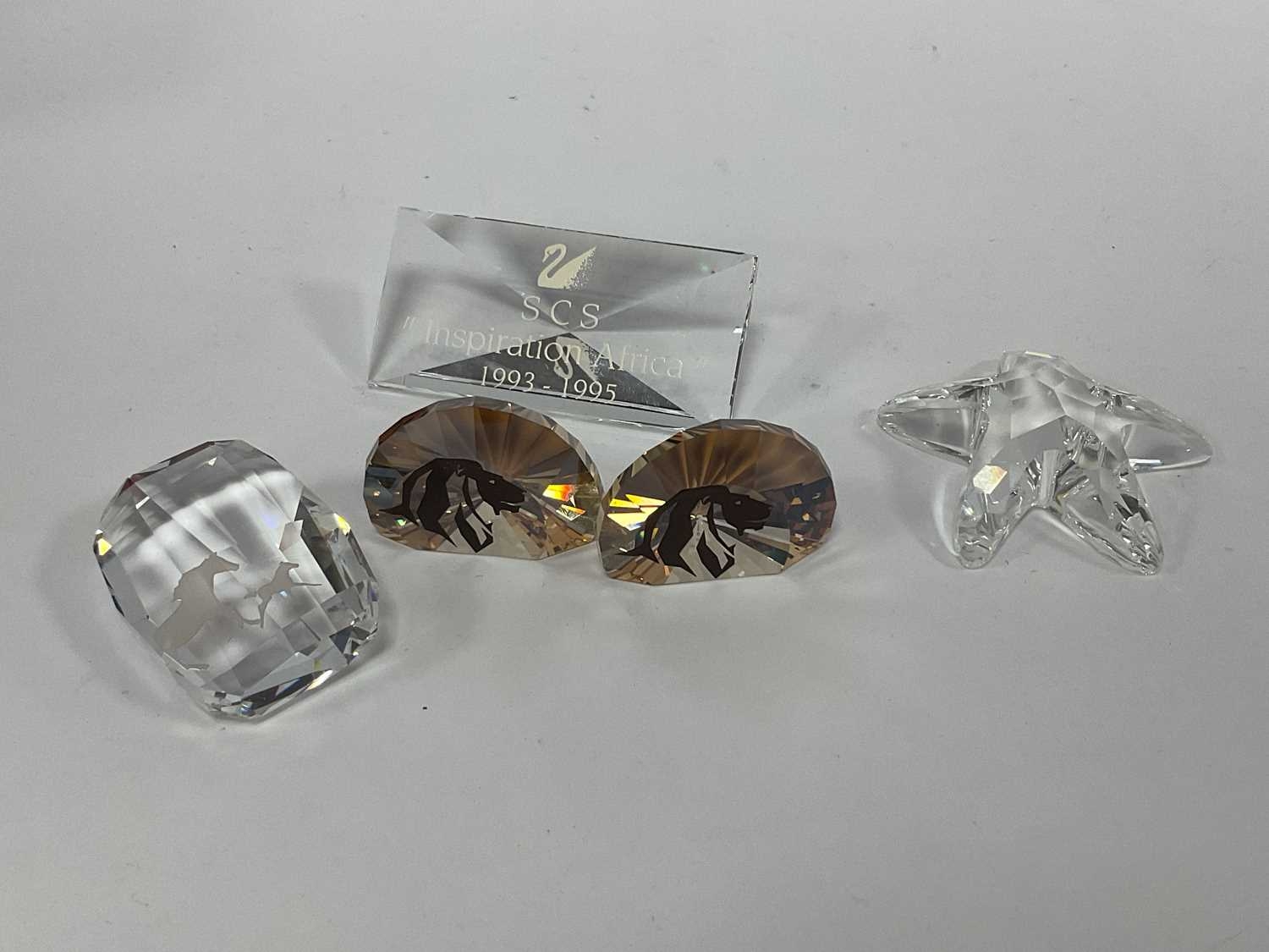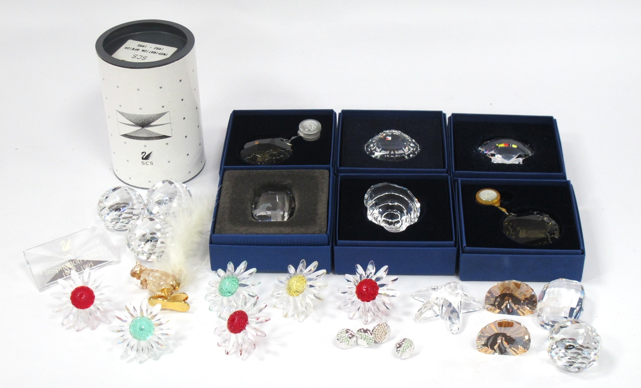 Swarovski Crystals, boxed and loose pieces, including seven boxed (SCS 1993-1995, x2 NR024 Clam, x2 NR156 Sun-catcher, NR458 Horse paperweight, NR065 Top Shell), Winter Squirrel clipper, six Daisies, eight assorted paperweights, four lapel badges:- One Tray.