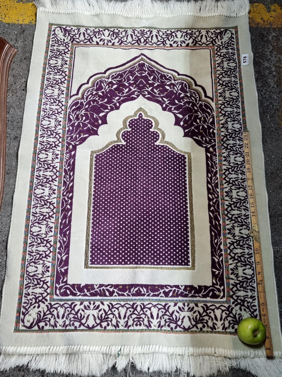 Persian Silk prayer rug in Creams and purples.