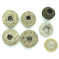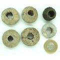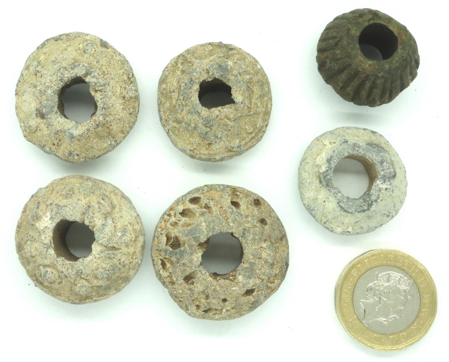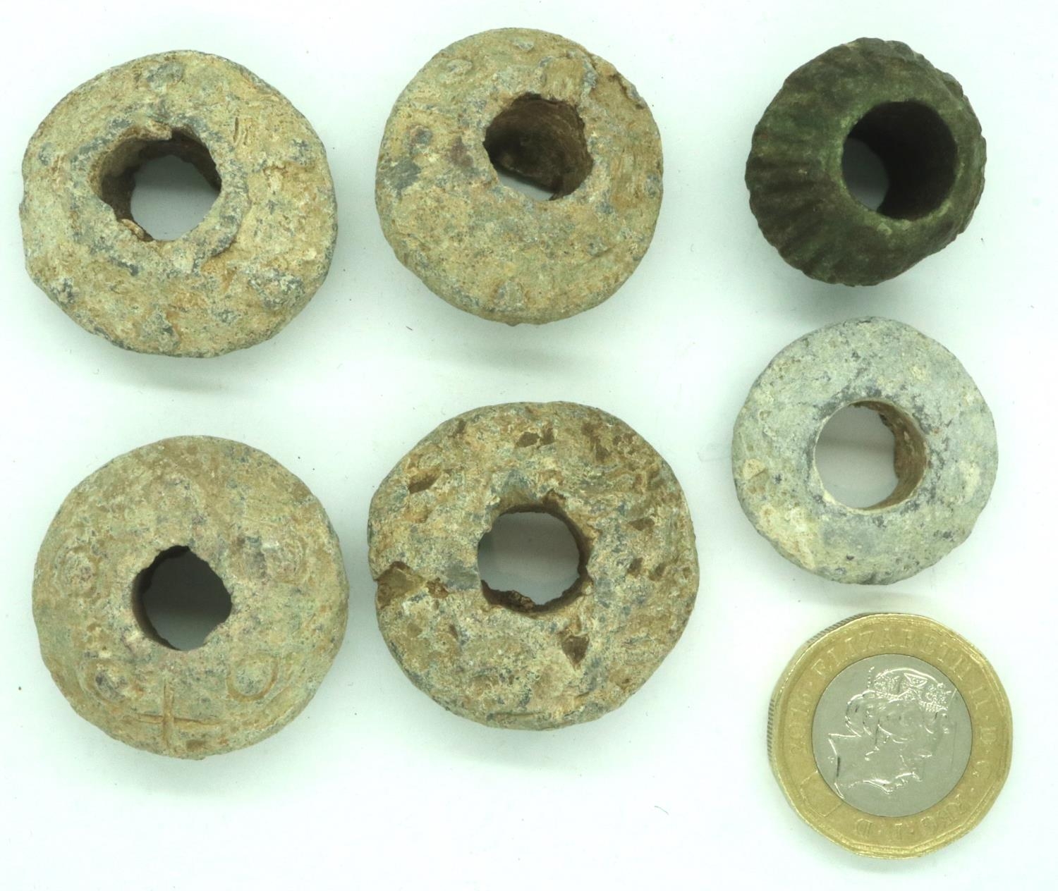 Six lead Medieval spinning whorls, approximately largest D: 30 mm. P&P Group 0 (£5+VAT for the first lot and £1+VAT for subsequent lots)