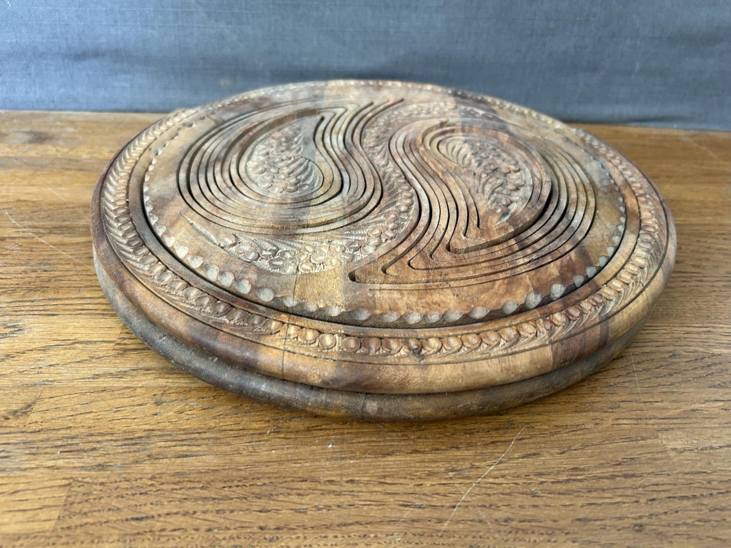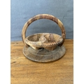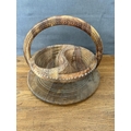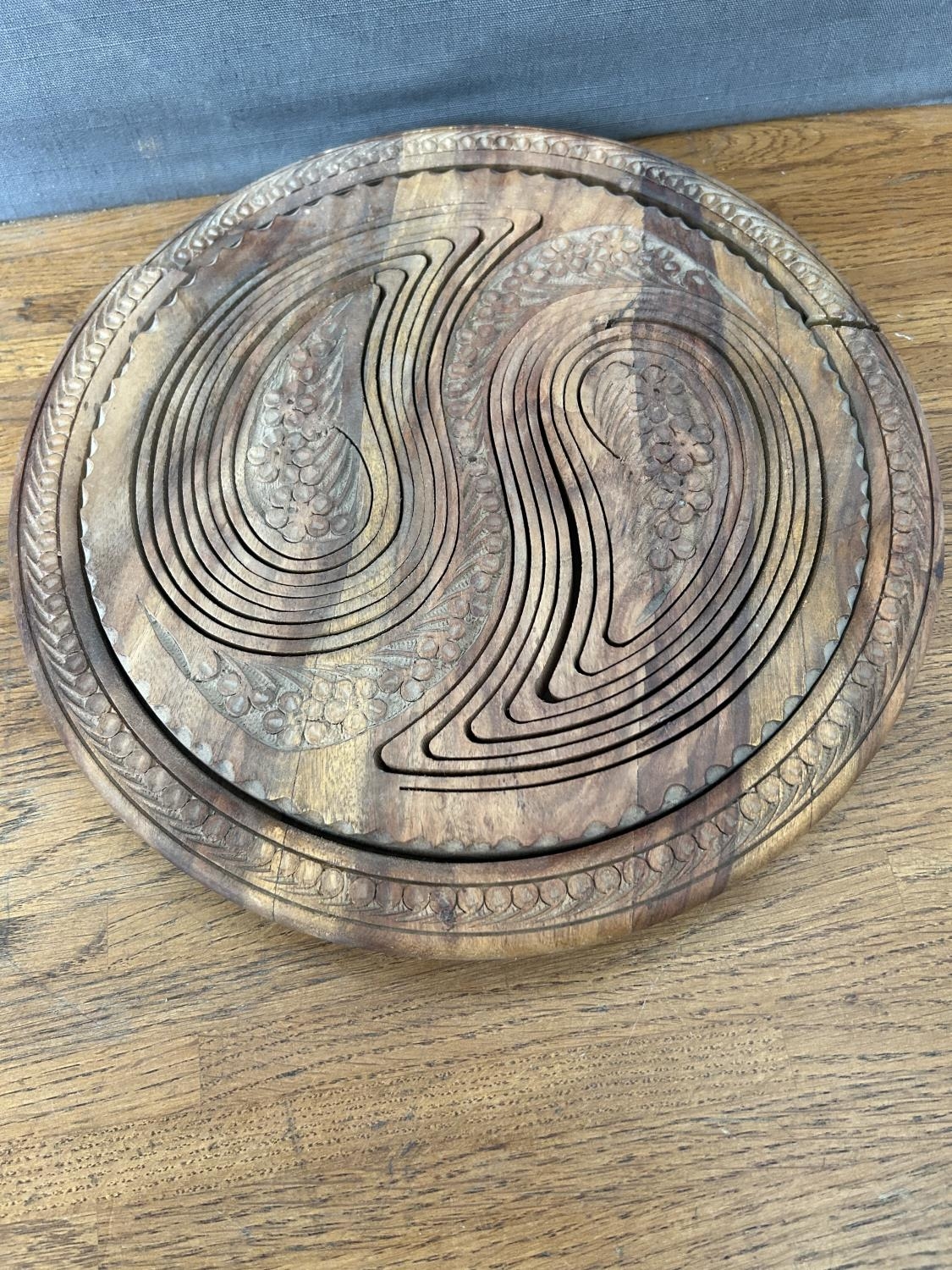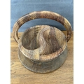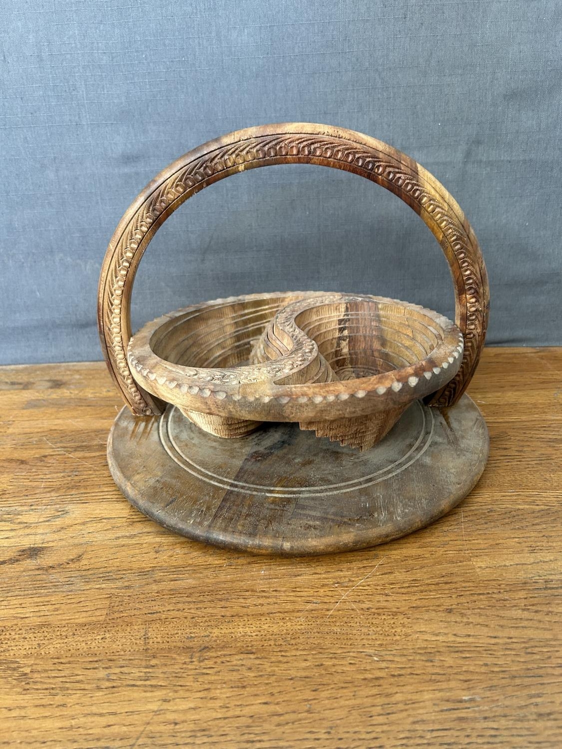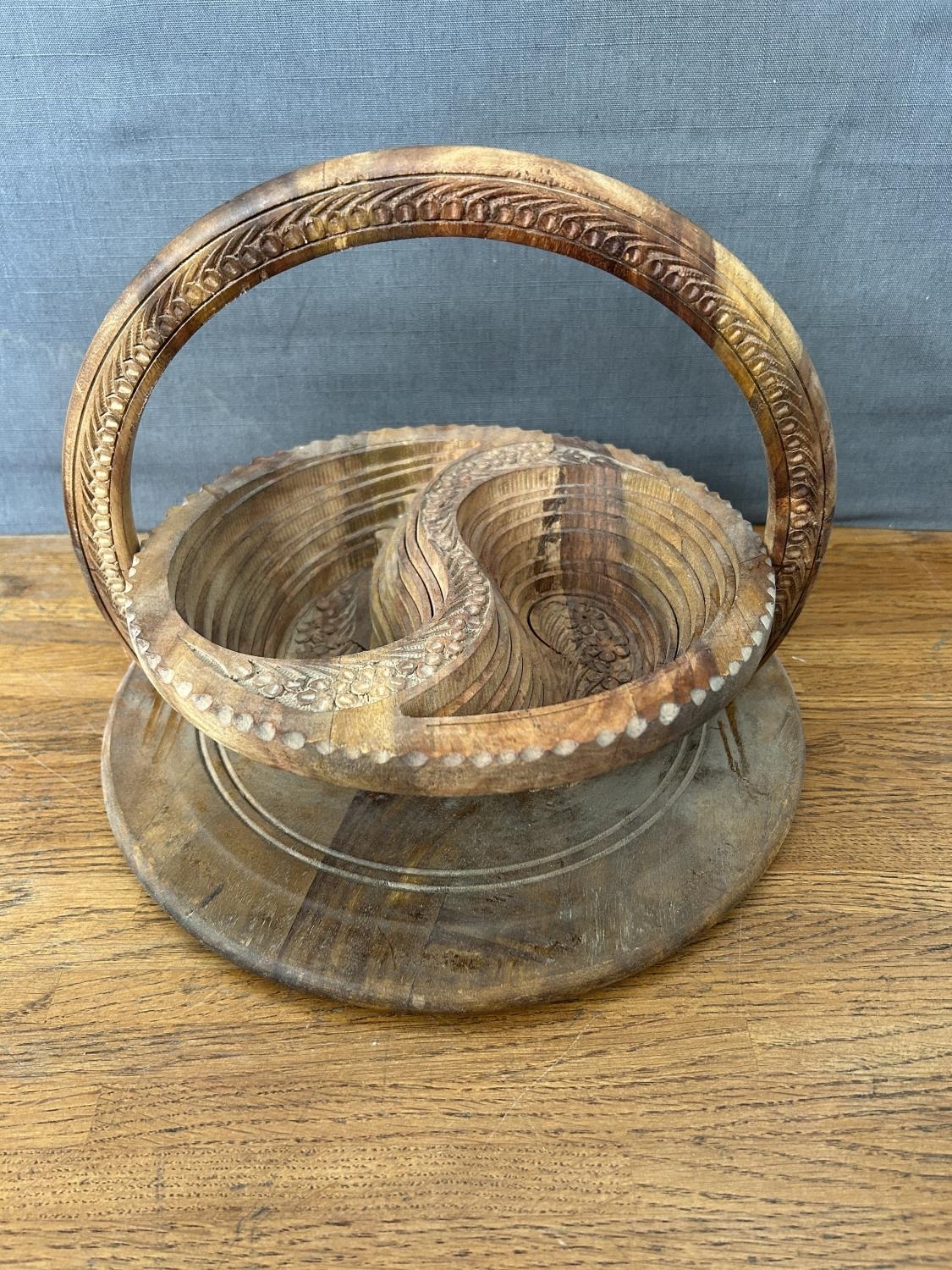 Hand- Carved Folding Collapsible Wooden Basket Bowl with 2 Compartments and a Handle