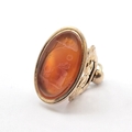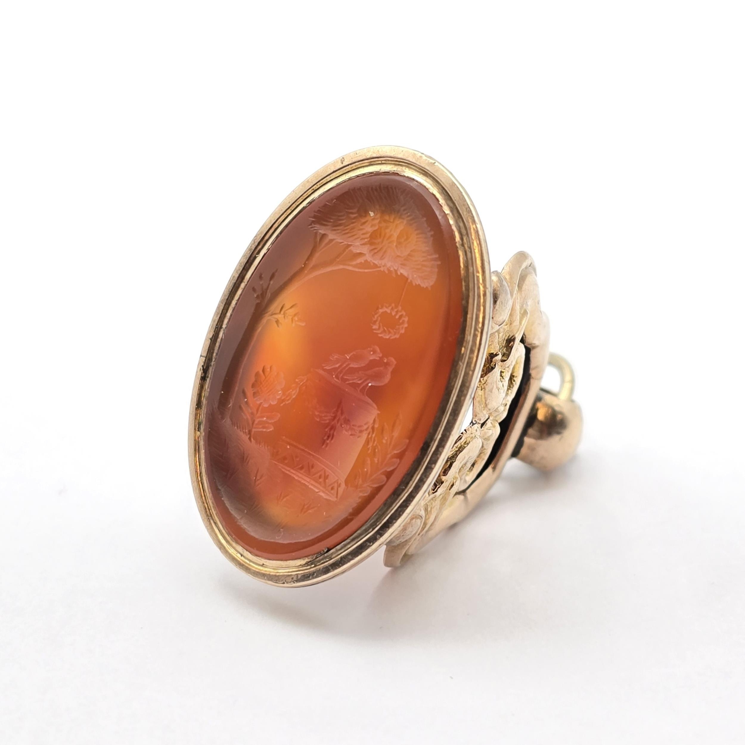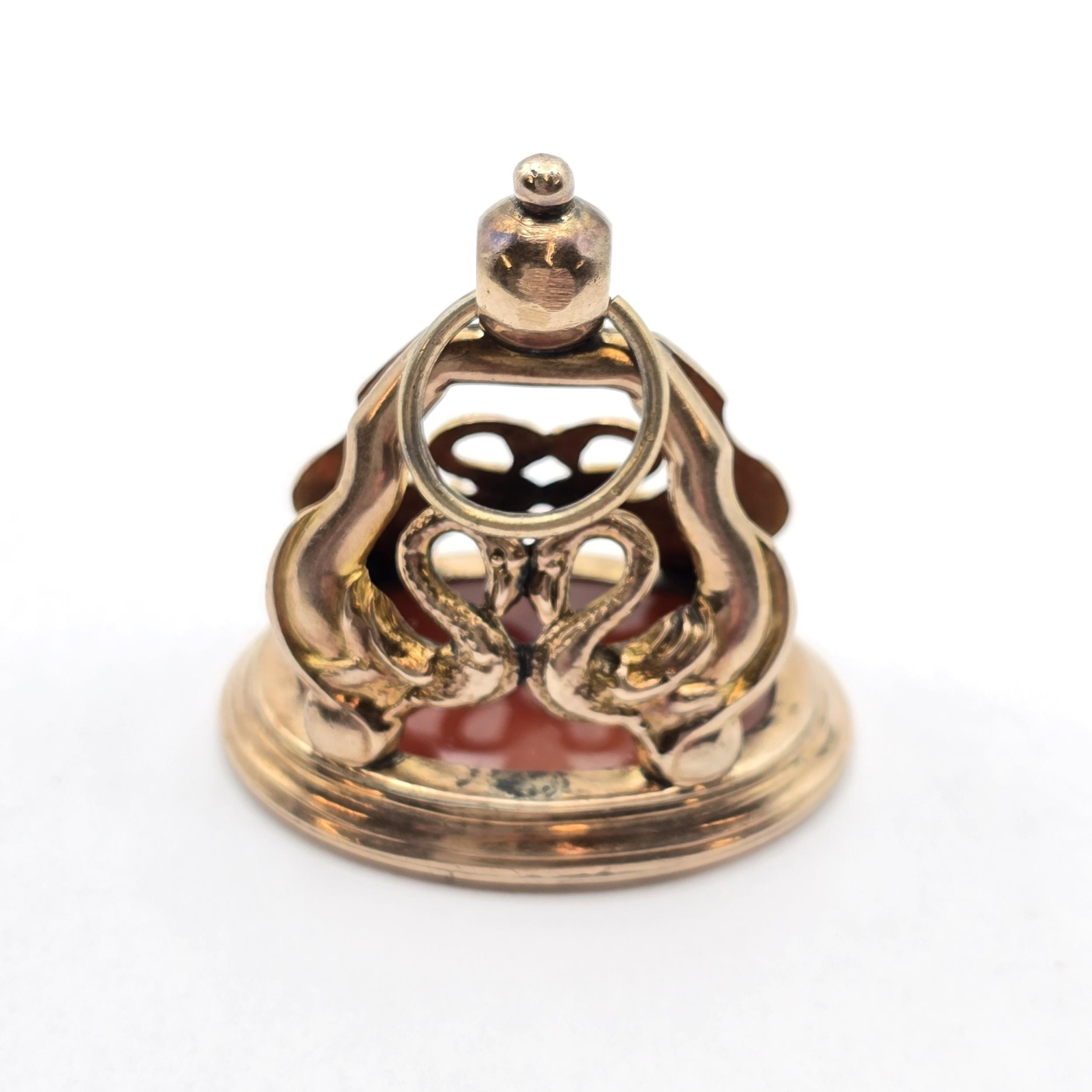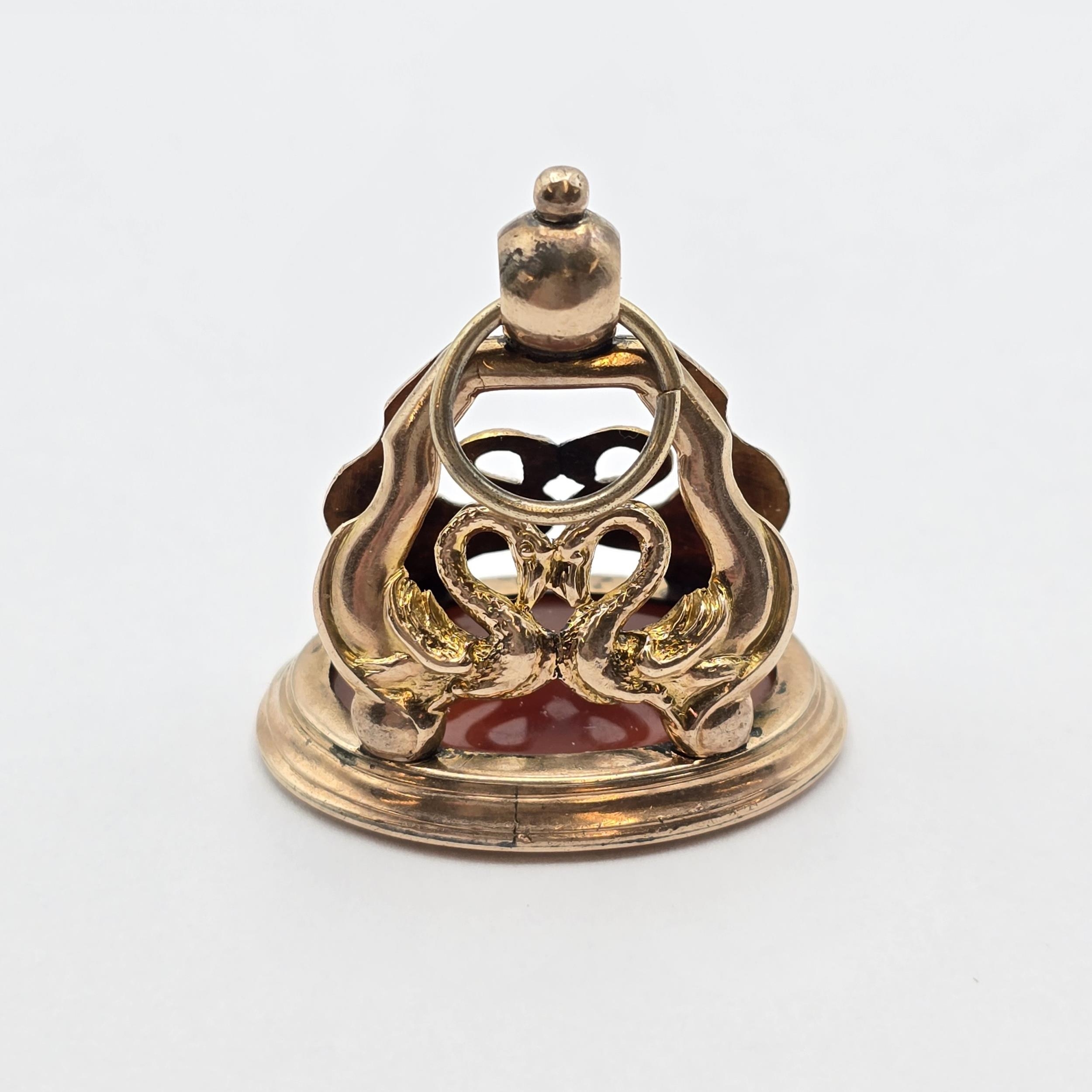 A Victorian Fob Seal having carved carnelian intaglio of pair of birds atop a plinth set in gold metal mount (tests as 9ct) featuring paired swans, 33 x 25mm, 17.4gms