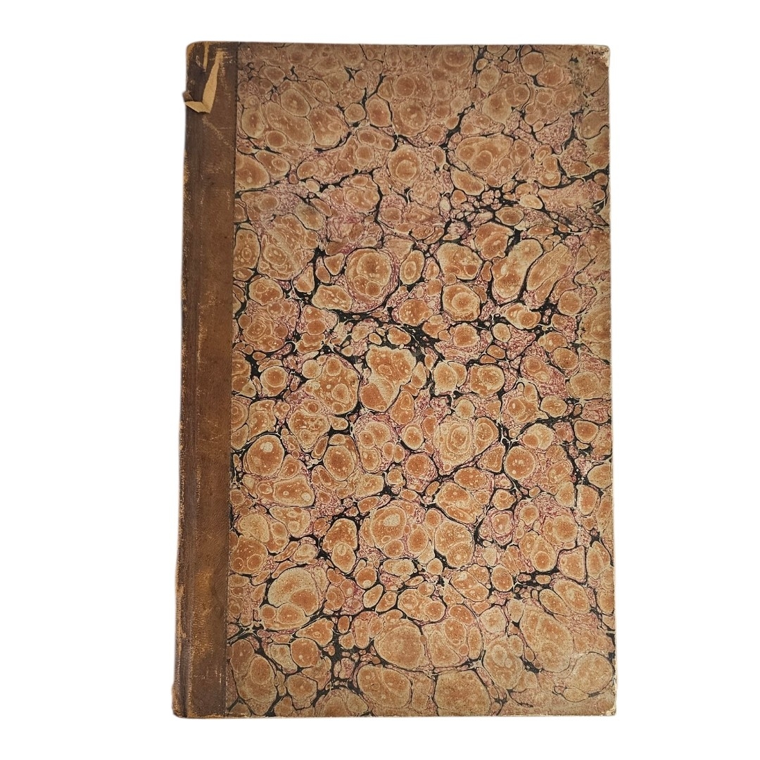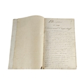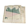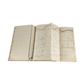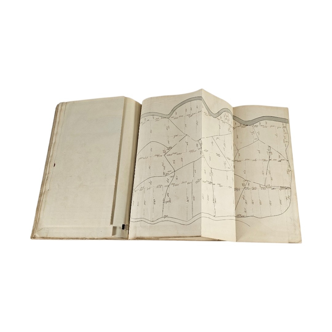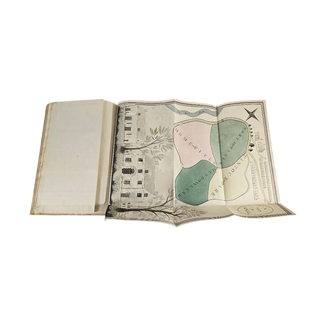 Titled ‘A system of Land Surveying, attributed to William Purves (later Captain William Purves of 9th Native Infantry, an illustrated volume in fine copperplate handwritten containing technical descriptions of Gunter’s Chain and ‘Methods’ for measuring distance, alongside charming watercolor illustrations. Highlights include large, hand-colored folding maps titled ‘A Plan of Stumps and Hall’, depicting a Georgian house and estate, in marbled binding.