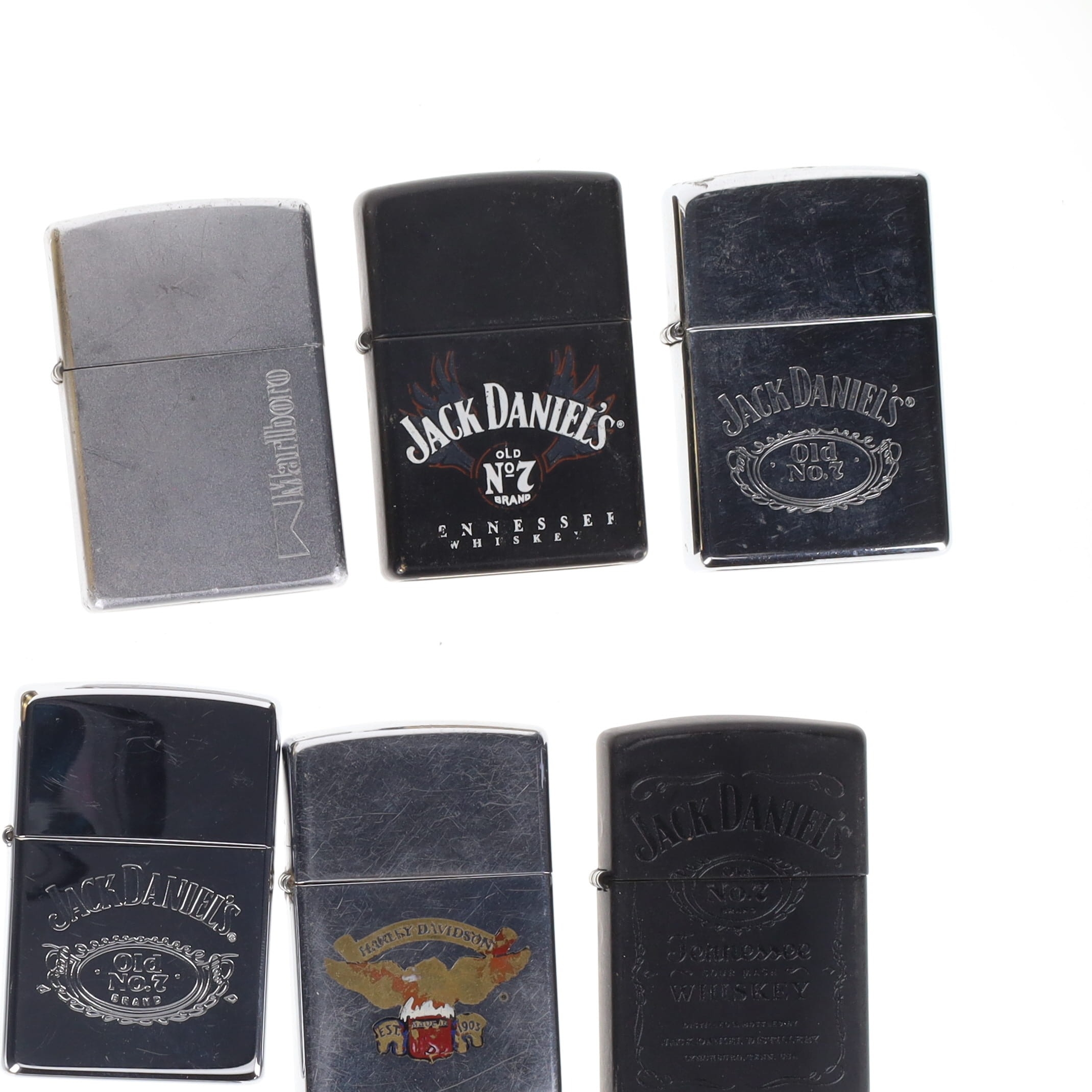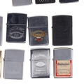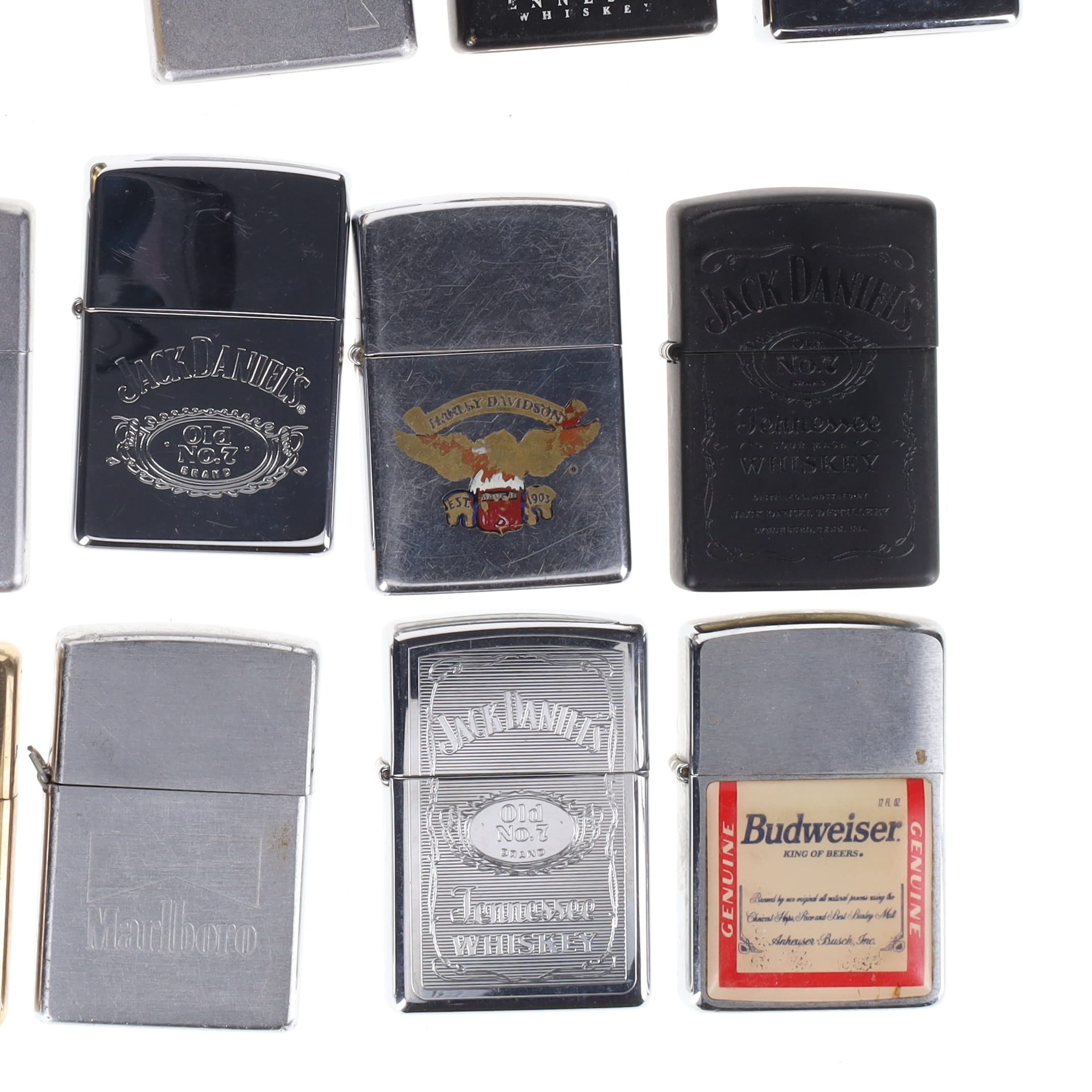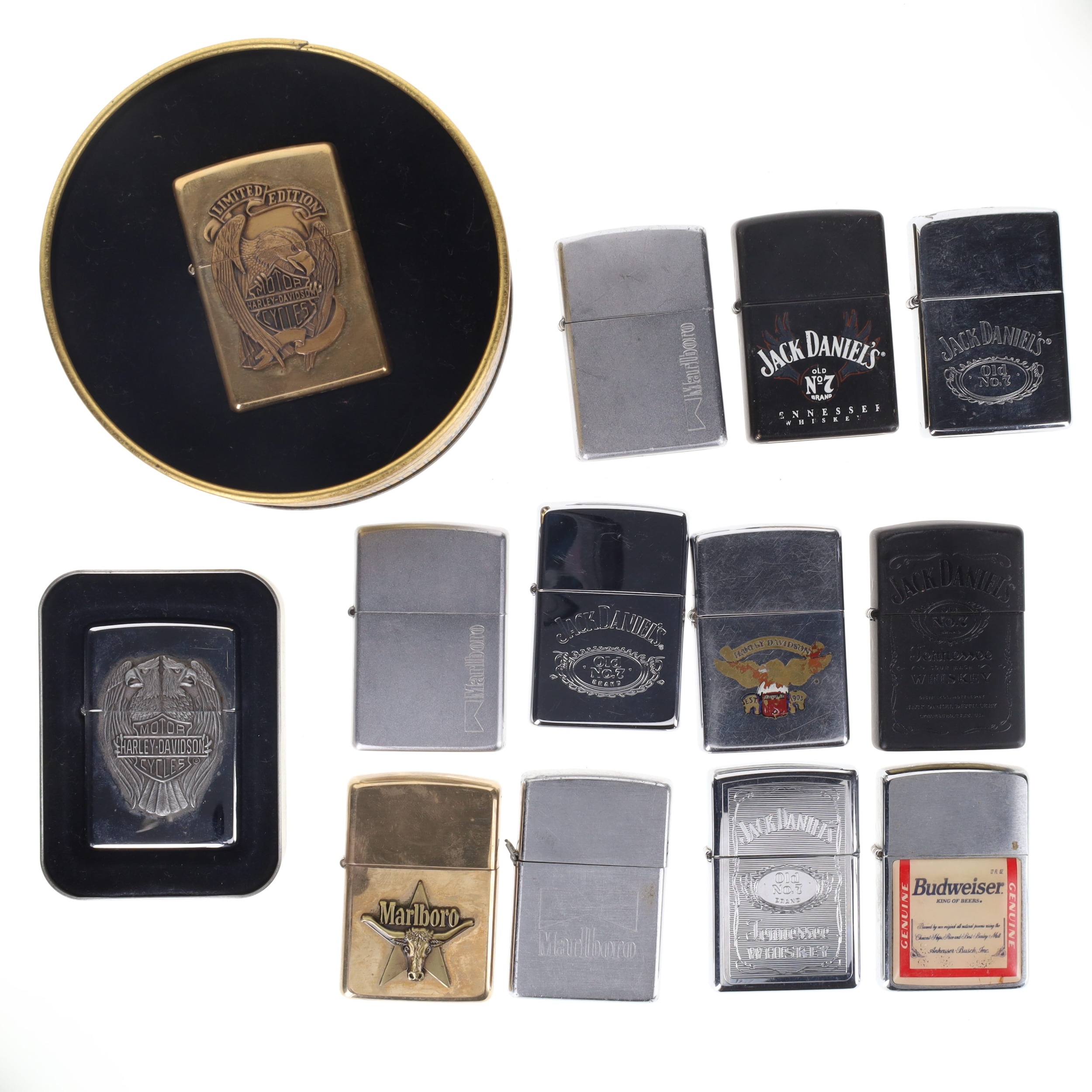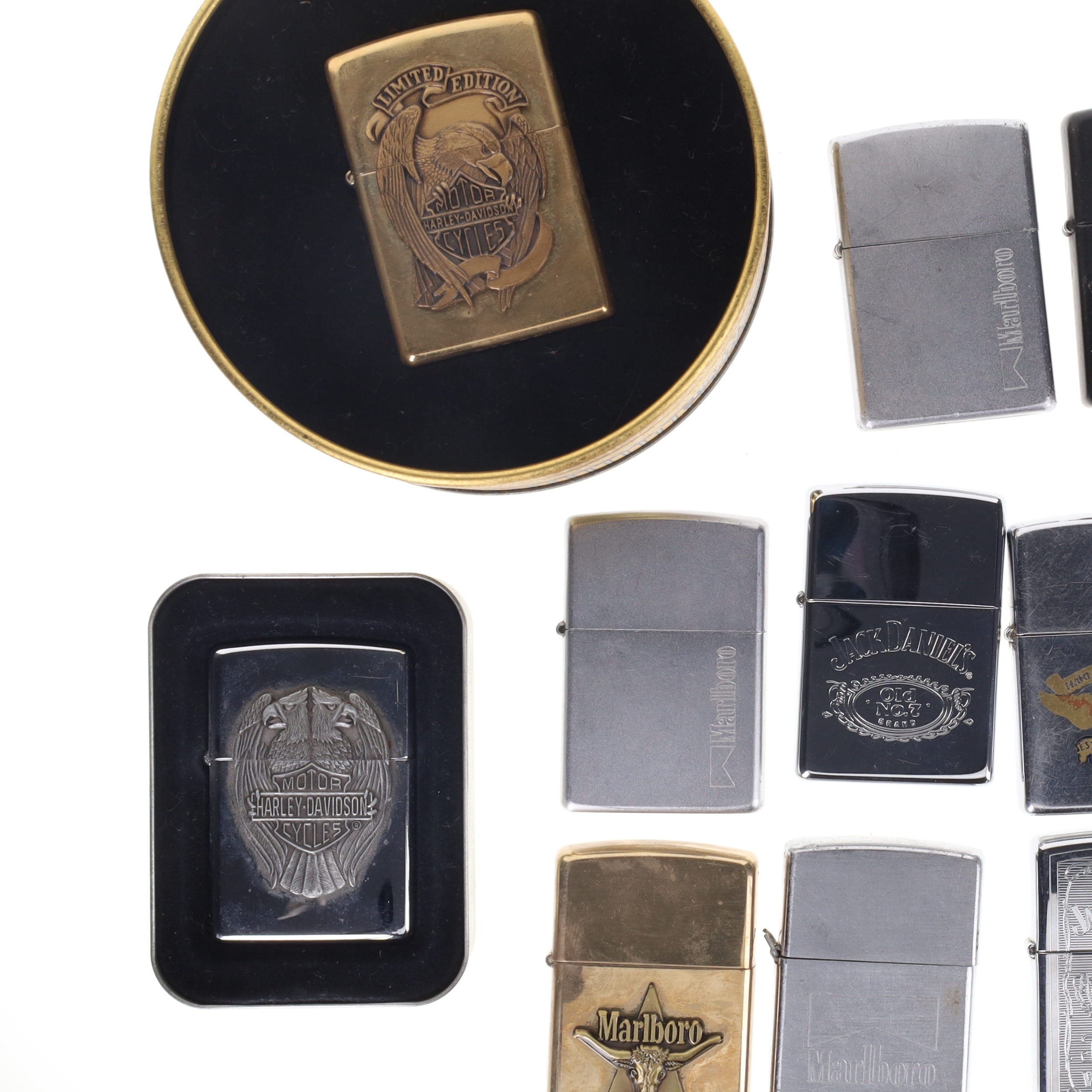 Zippo - Pocket Lighters Collection incl. Branded, Harley Davidson, Lighter Stand. Collection includes a boxed limited edition Harley Davidson lighter, a lighter stand and loose assorted branded lighters. These lighters are in various levels of working condition, with some good sparks, and some with no spark. There are some signs of age and use, including tarnished metal and faded decals.