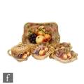A collection of later 20th Century 'Fine Bone China' decorated by former Royal Worcester artist Richard Budd in the Fallen Fruit style comprising a square cake plate, three pin dishes and a sugar bowl and cover, printed marks, each piece signed, one pin dish A/F. (5)