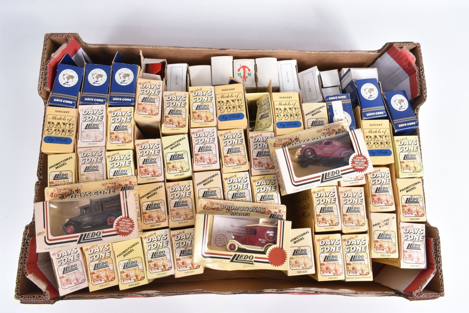 A COLLECTION OF BOXED LLEDO DIECAST MODEL VEHICLES, to include Promotional models, World Collectors Club Series, models such as a MG Racing Car with transfers in blue no. PM101 M, an Alfa Romeo Brooklands in green with transfers no. PM104 AR, an Aston Martin in red with transfers no. PM102 AM and similar models, the models appear in good condition, the outer packaging is in good condition showing slight wear on corners and edges, contents unchecked for completeness (2 boxes)