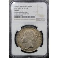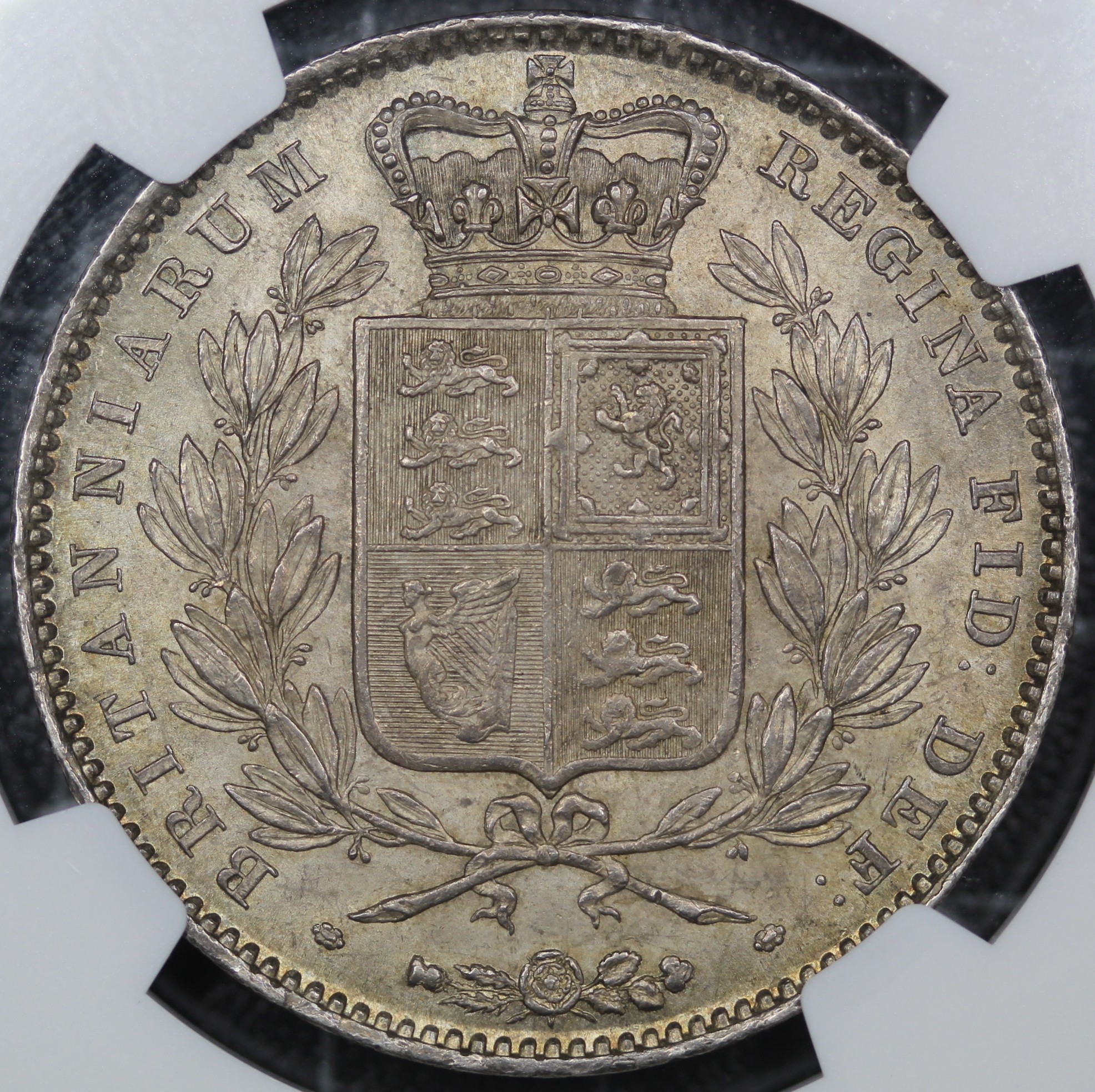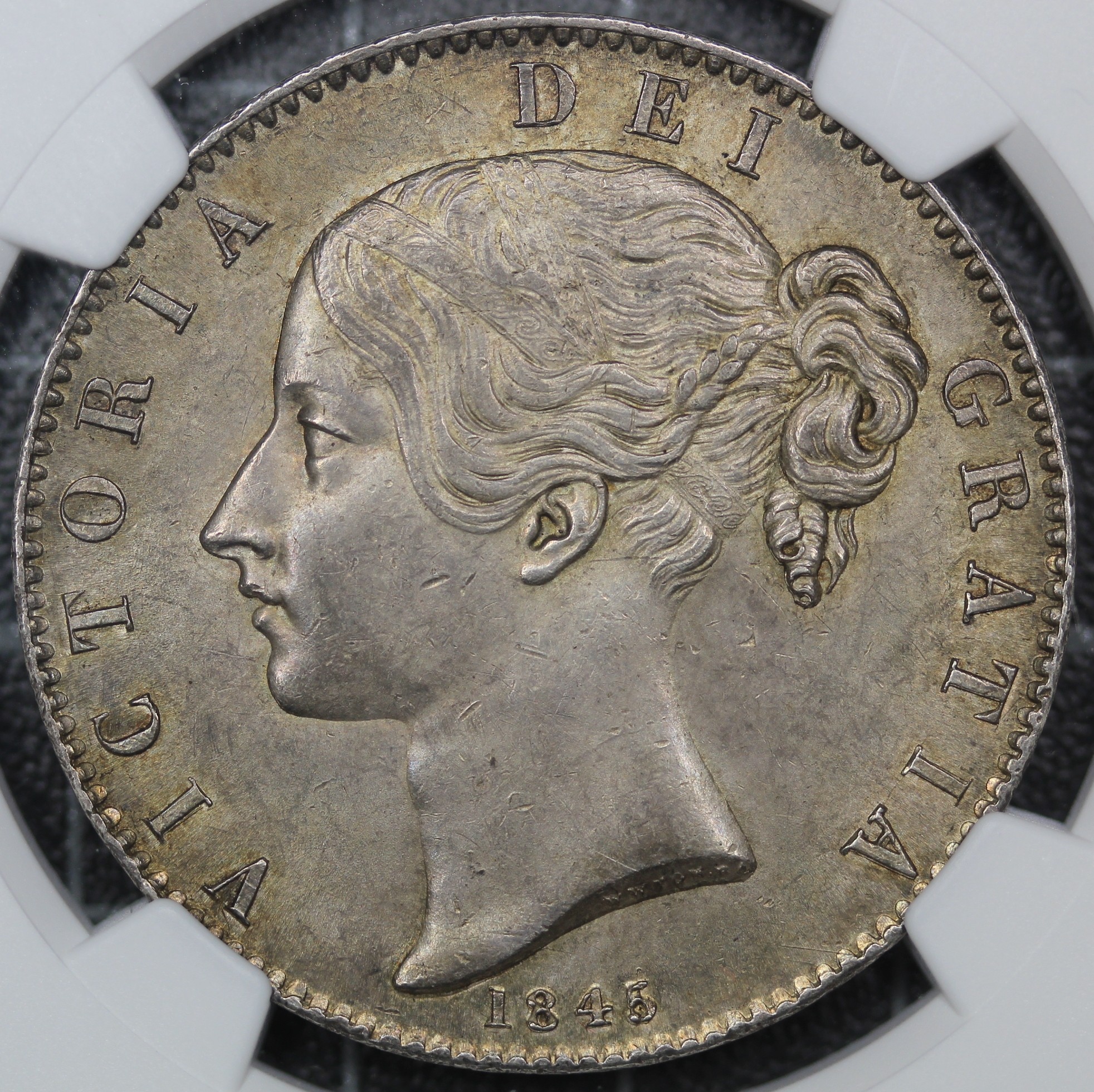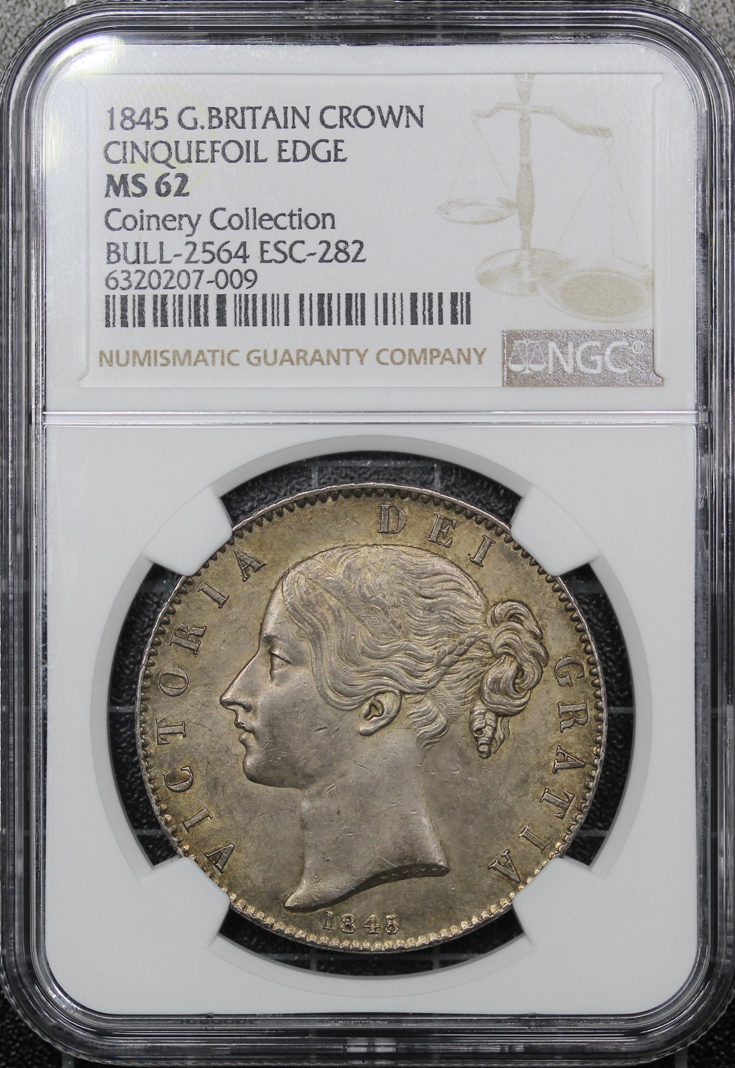 1845 Crown, Edge Cinquefoil, Victoria (ESC 282, Bull 2564, S.3882). Graded NGC MS6 and presented in a Coinery Collection holder. Victorian young head crowns extremely scarce at this level and are always highly desirable. Golden toned with underlying lustre.