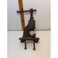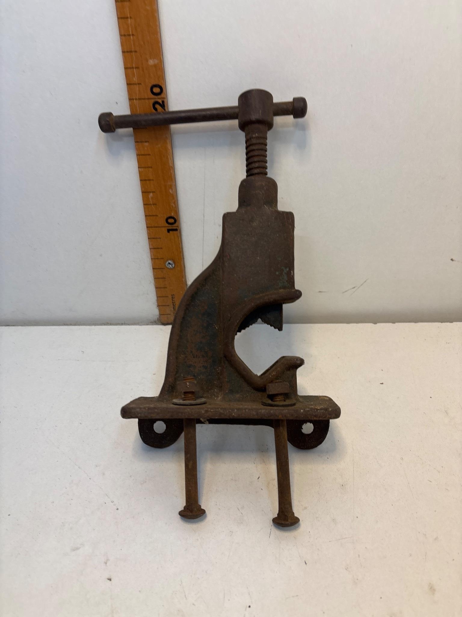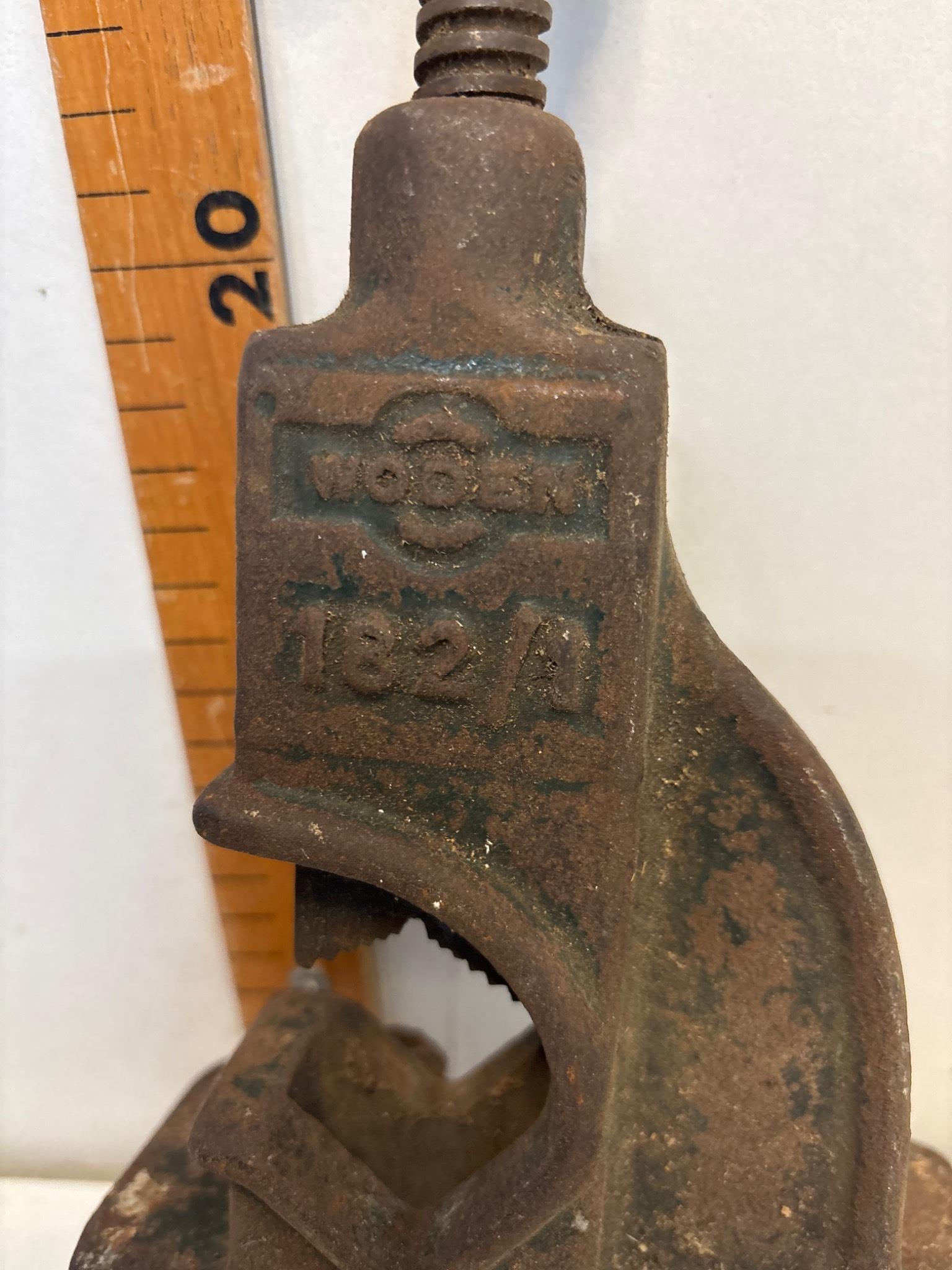 Woodson 182A cast iron vise with clamp attachment and 20 cm scale rule in display.