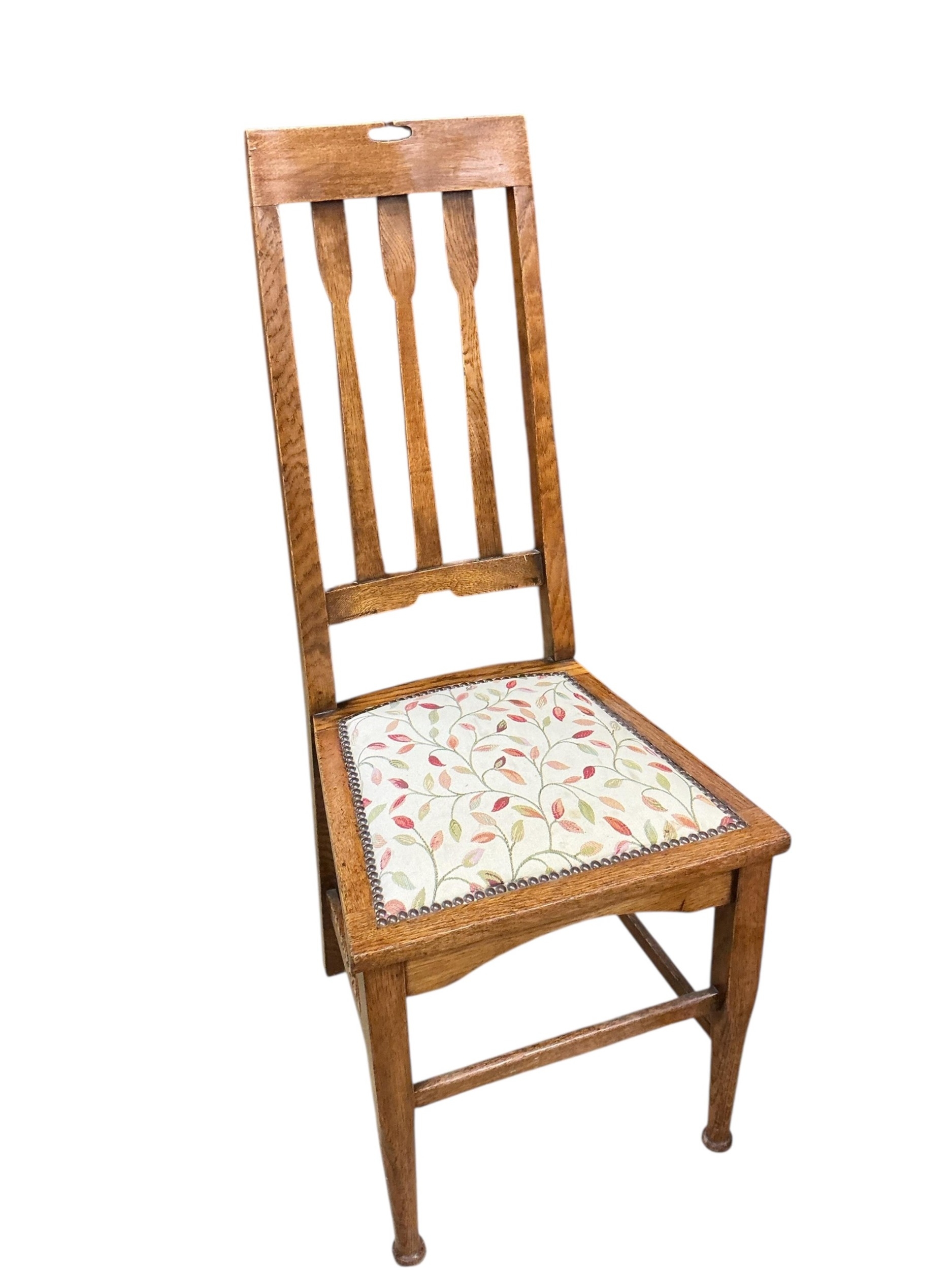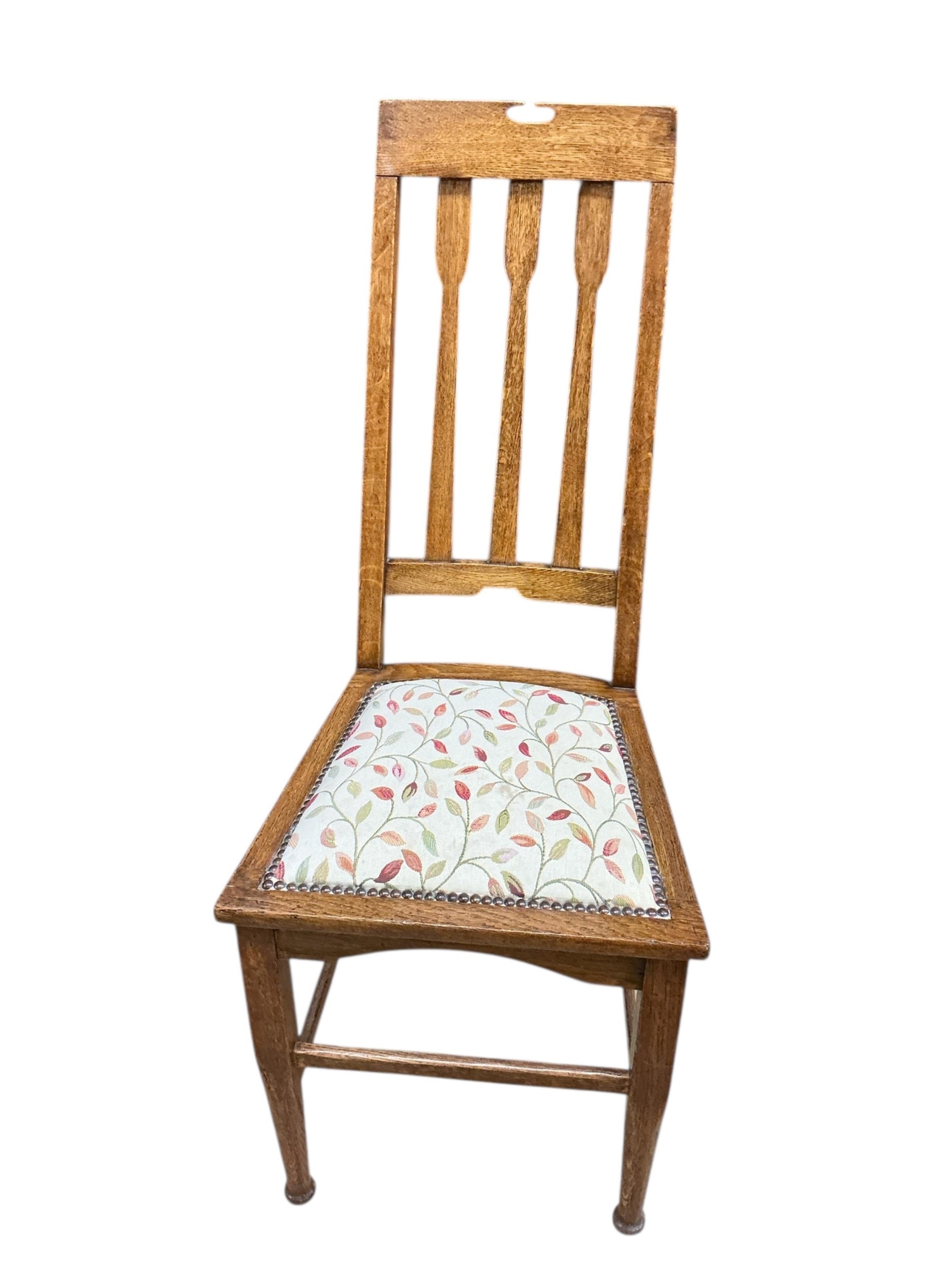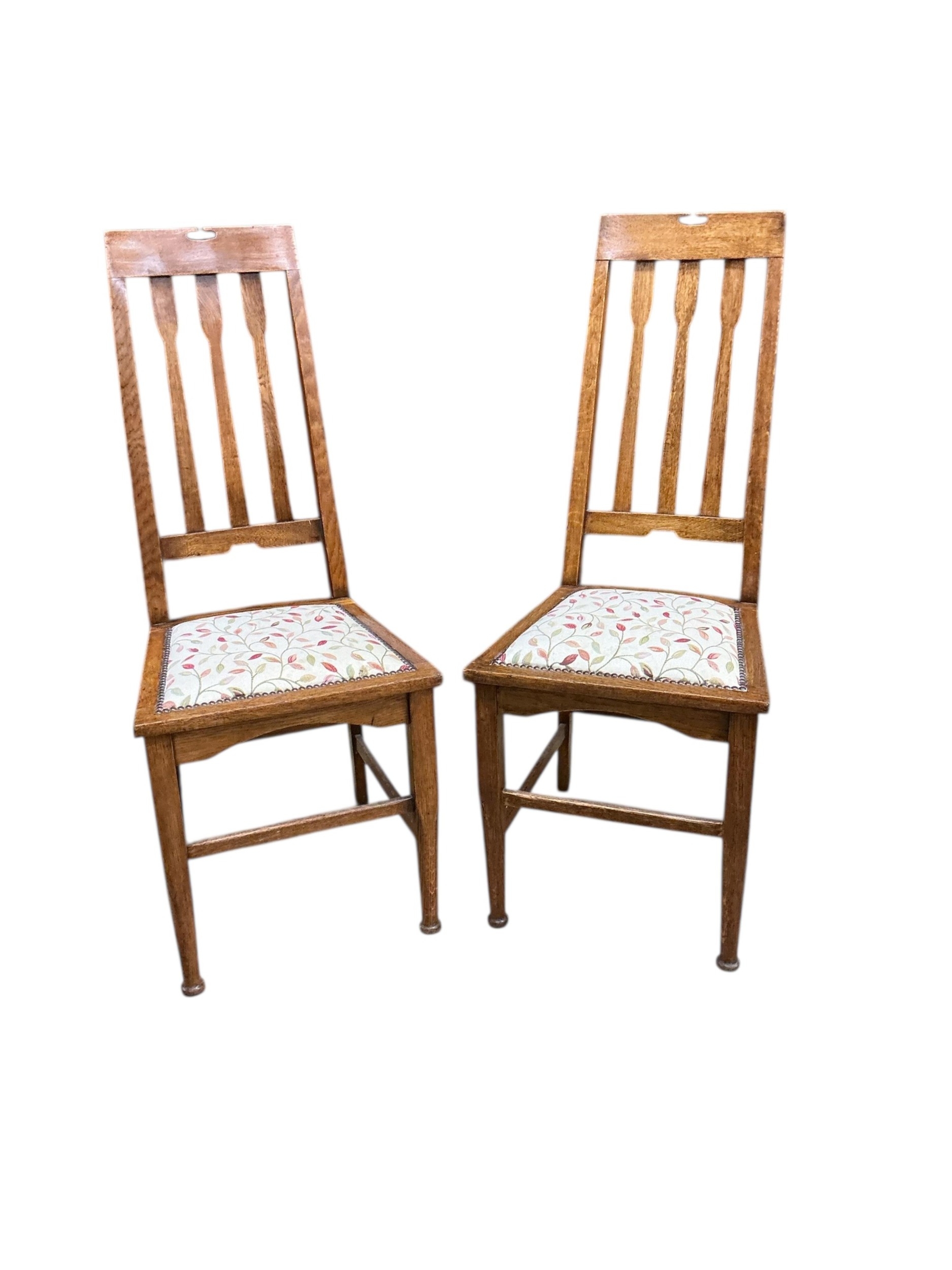 A pair of early 20th century Liberty style oak dining chairs, height 106cm