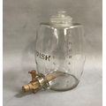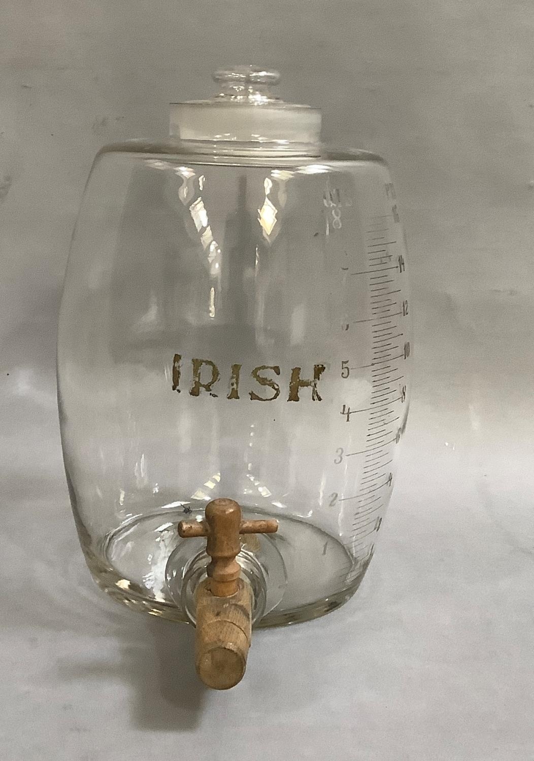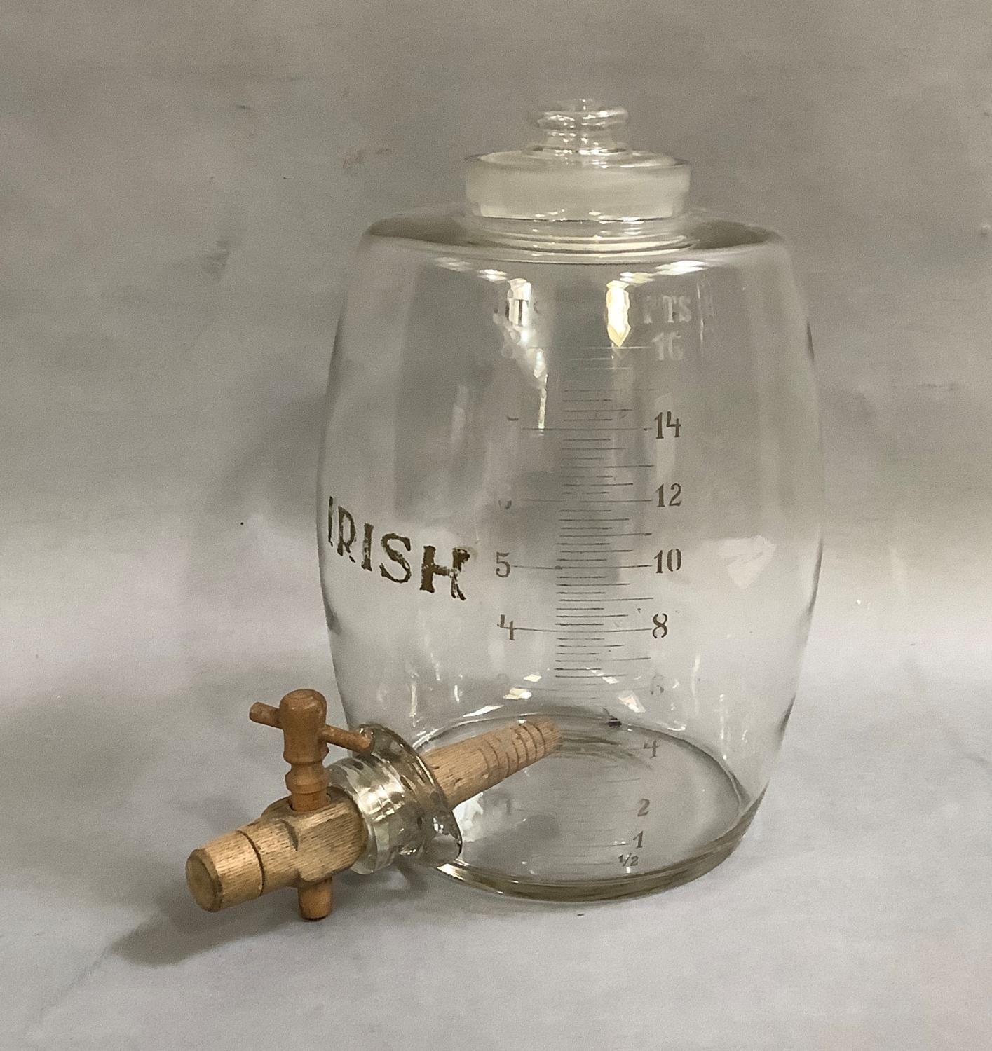 An Irish glass whiskey barrel, lettered in gilt and engraved with measure to 8 quarts - 16 pints, wooden spigot, 34.5cm high