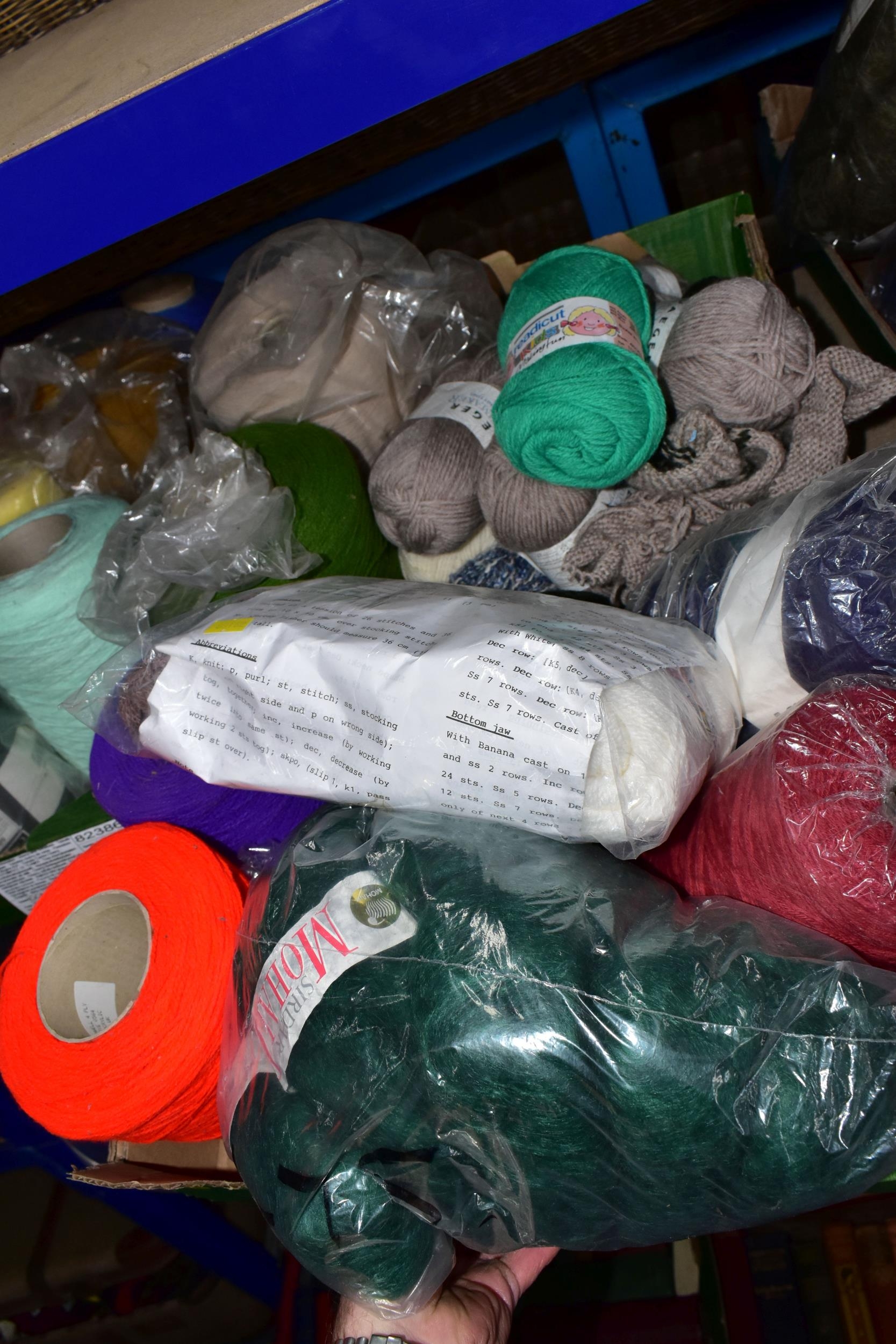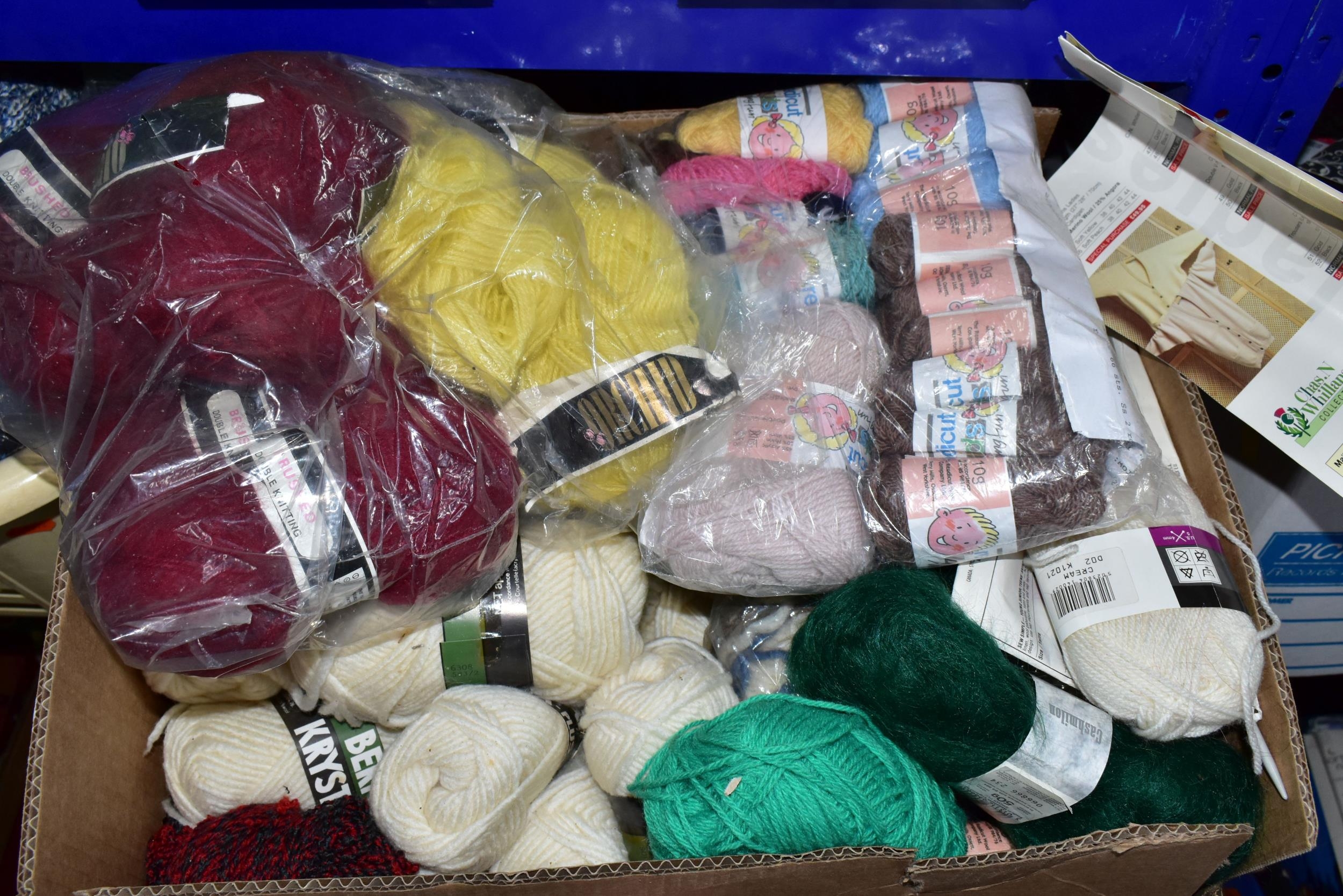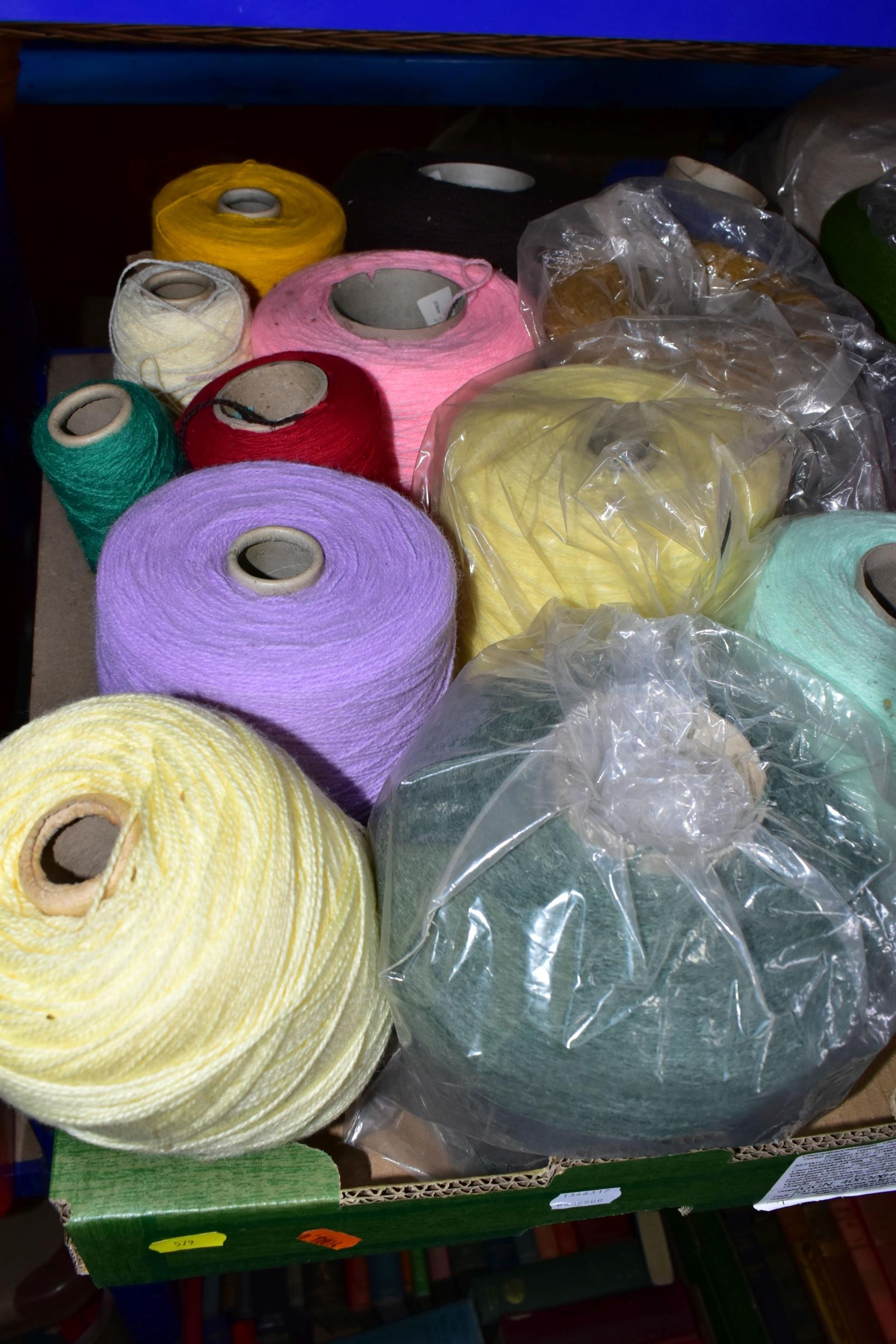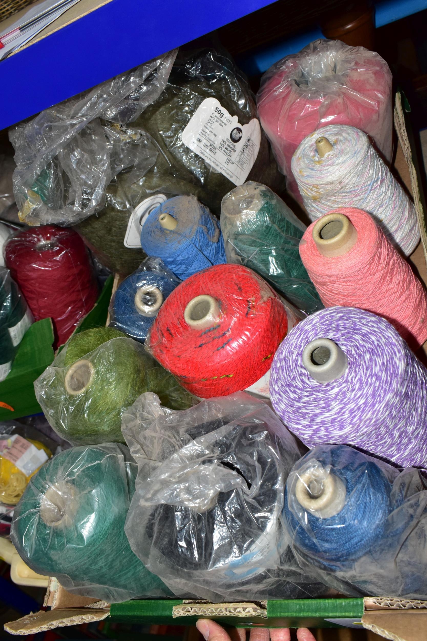 FIVE BOXES AND LOOSE KNITTING WOOL ETC, to include unused reels of knitting machine wool, unused balls of hand knitting wool, together with a small quantity of part used machine and hand knit wool, comprising natural and synthetic yarns (5 boxes)
