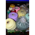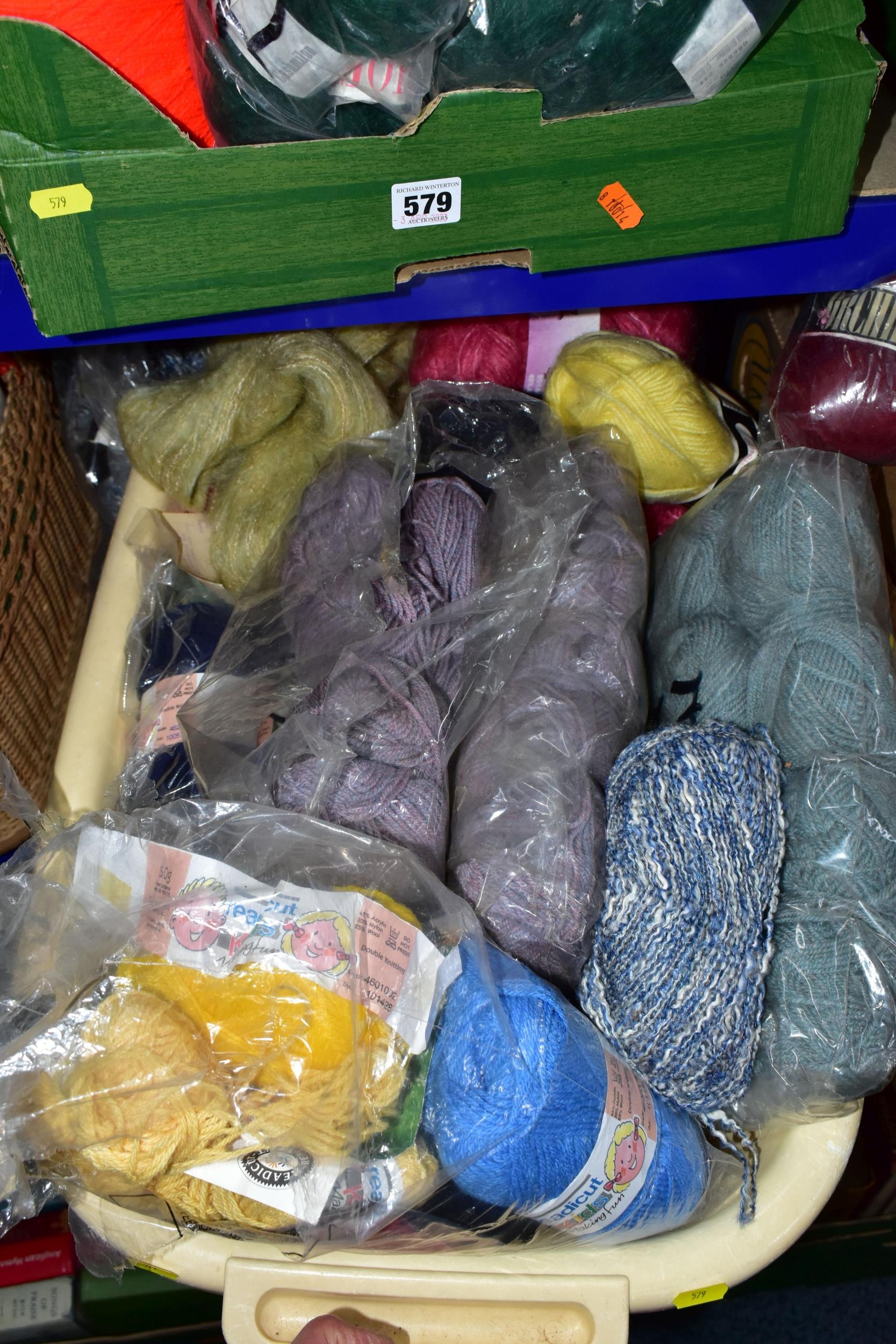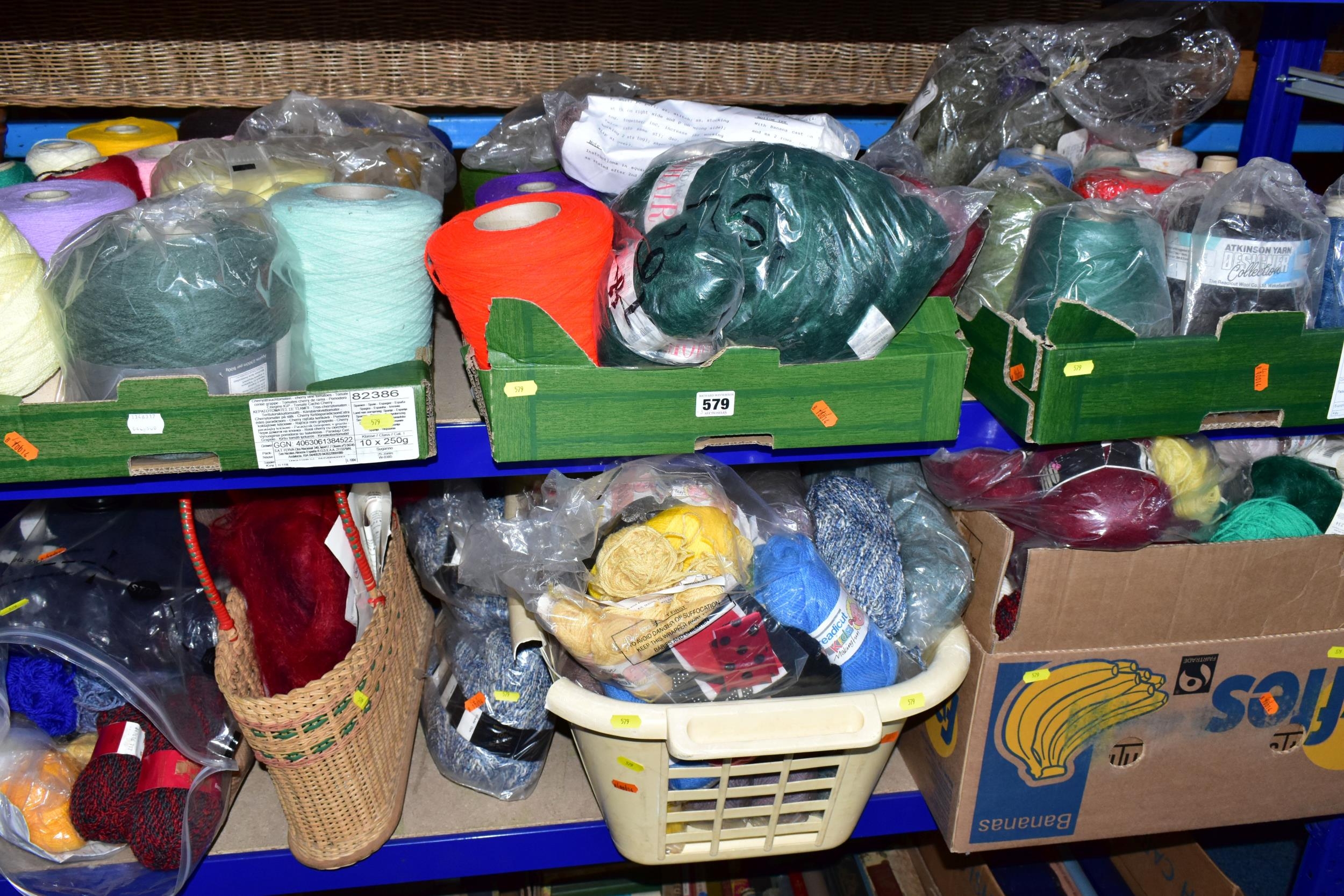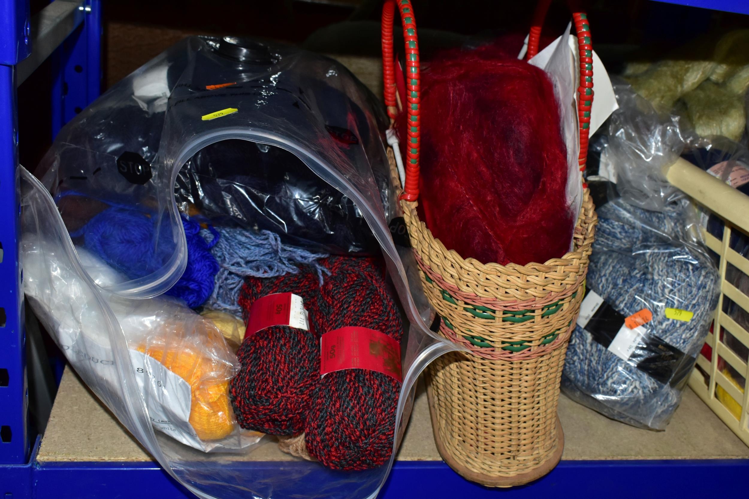 FIVE BOXES AND LOOSE KNITTING WOOL ETC, to include unused reels of knitting machine wool, unused balls of hand knitting wool, together with a small quantity of part used machine and hand knit wool, comprising natural and synthetic yarns (5 boxes)