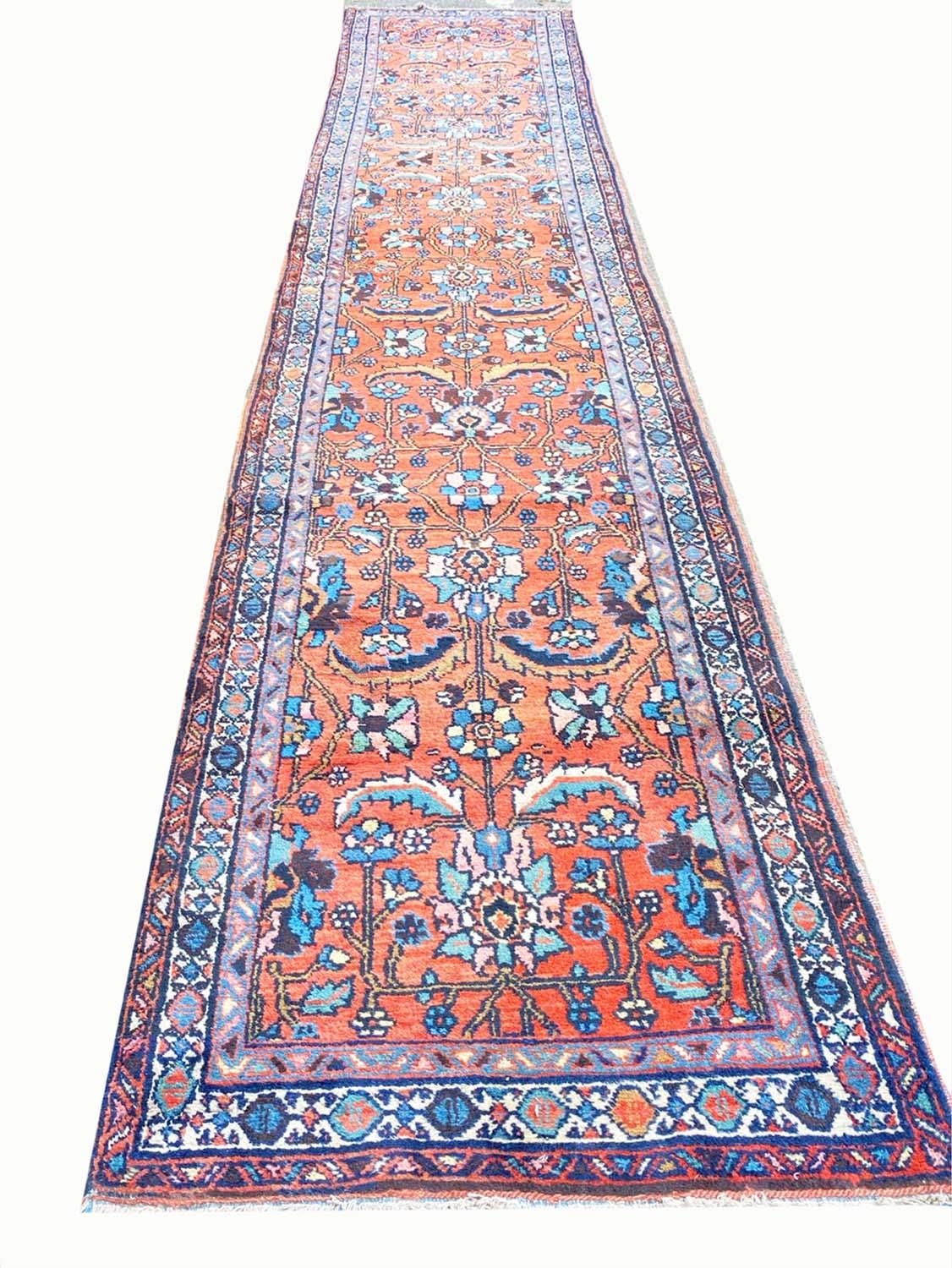 ANTIQUE PERSIAN HERIZ RUNNER, 450cm x 90cm.