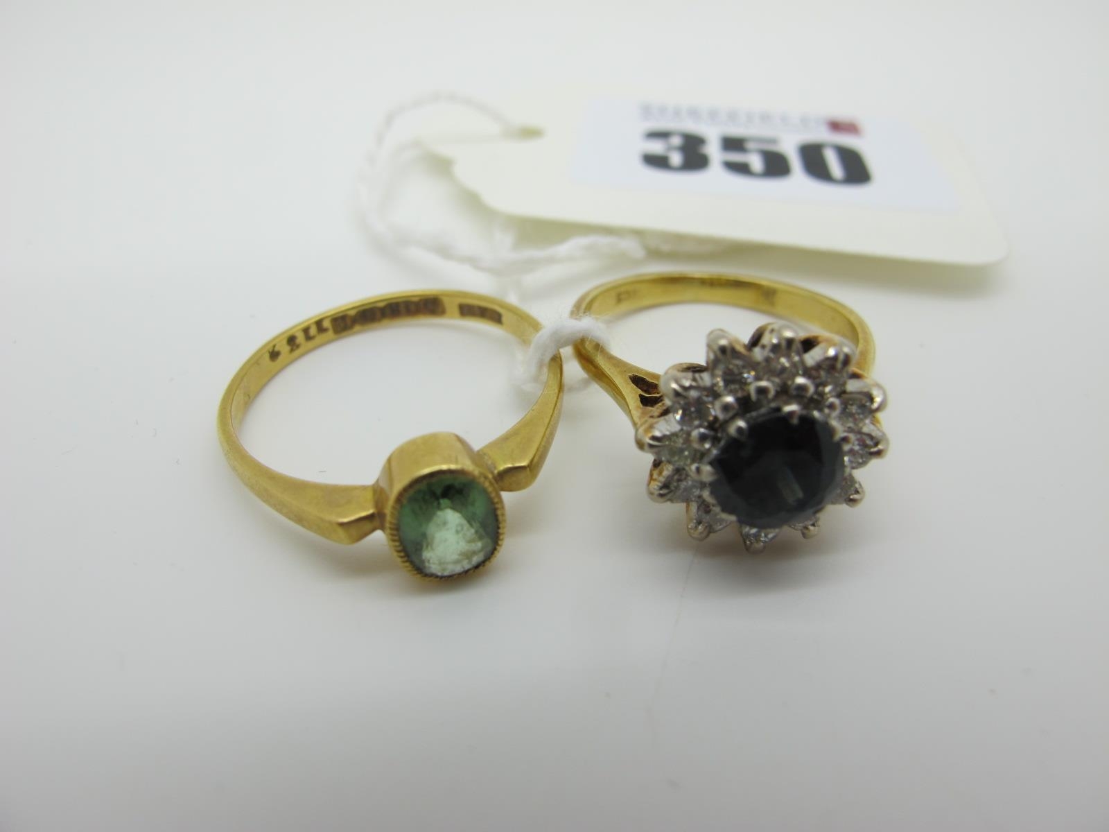 An 18ct Gold Dress Ring, oval collet set centre (finger size P); a cluster ring, of flowerhead design, claw set throughout, between tapered shoulders, indistinctly stamped "18ct" (rubbed) (finger size K) (total weight 6grams).