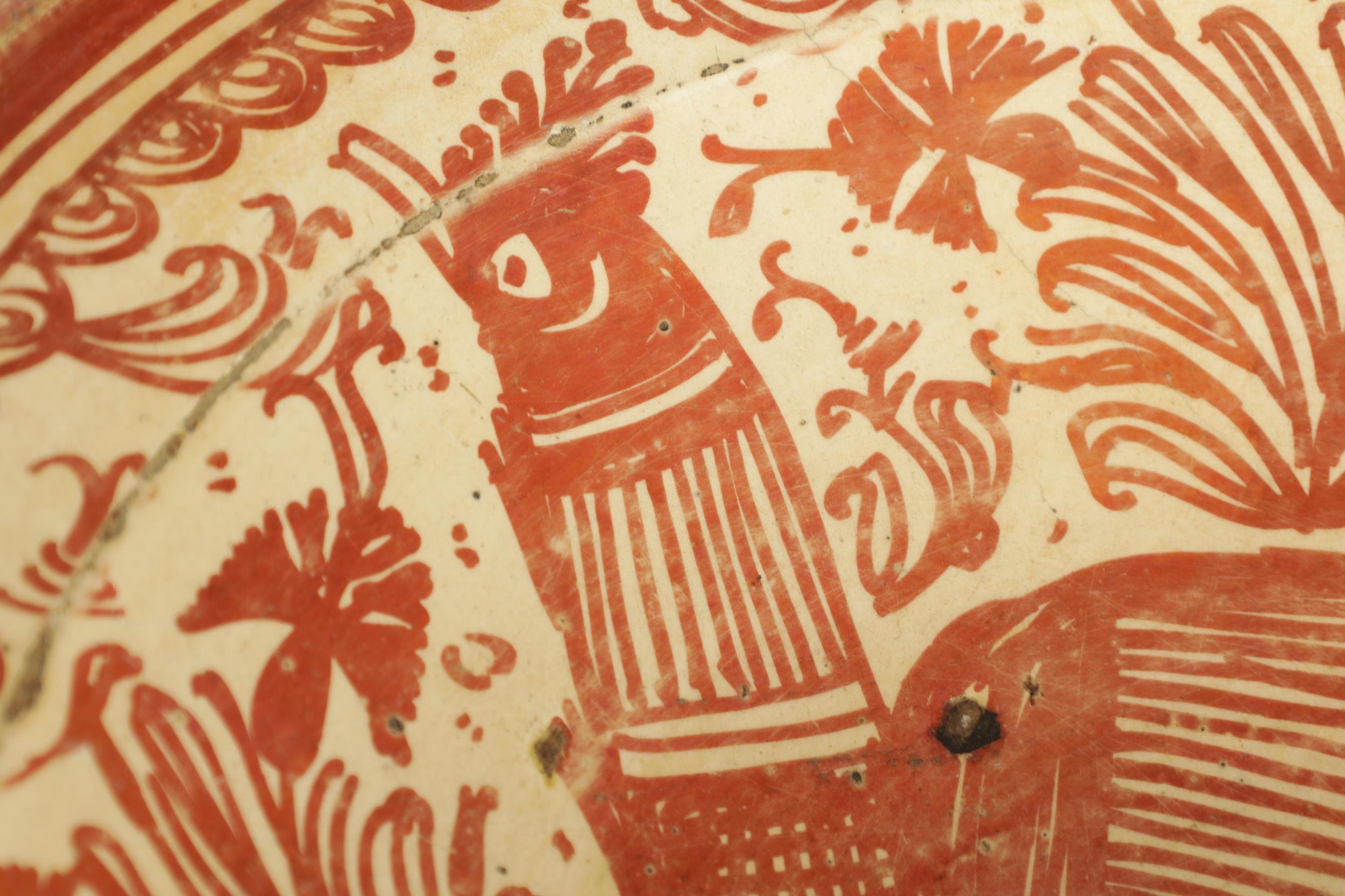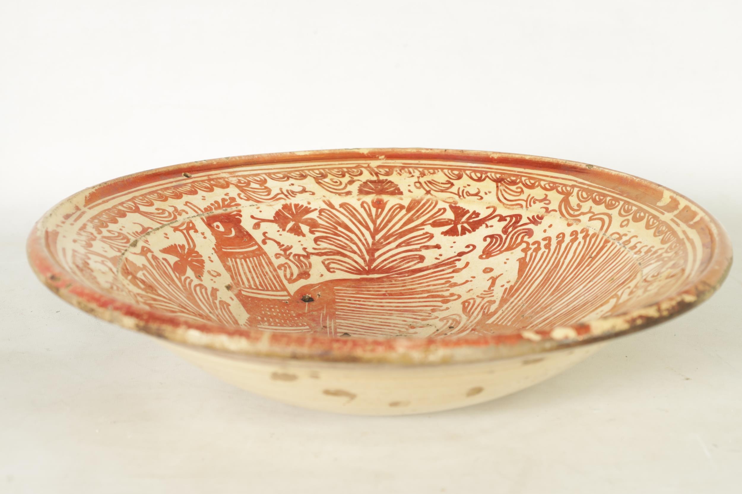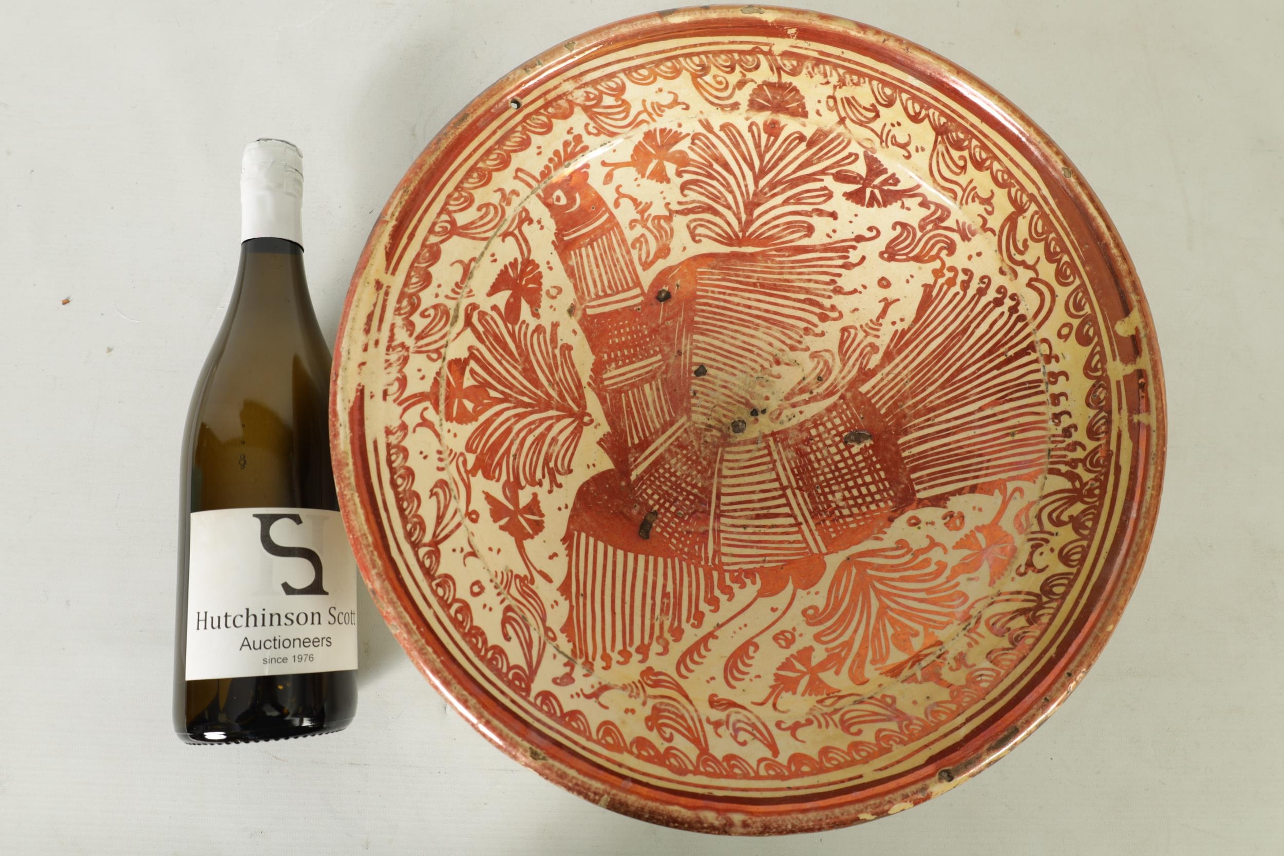 A 17TH CENTURY COPPER LUSTRE HISPANO MORESQUE HANGING CHARGER decorated with central cockerel and scrolling leaf work decoration (39cm diameter )