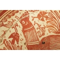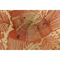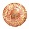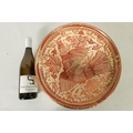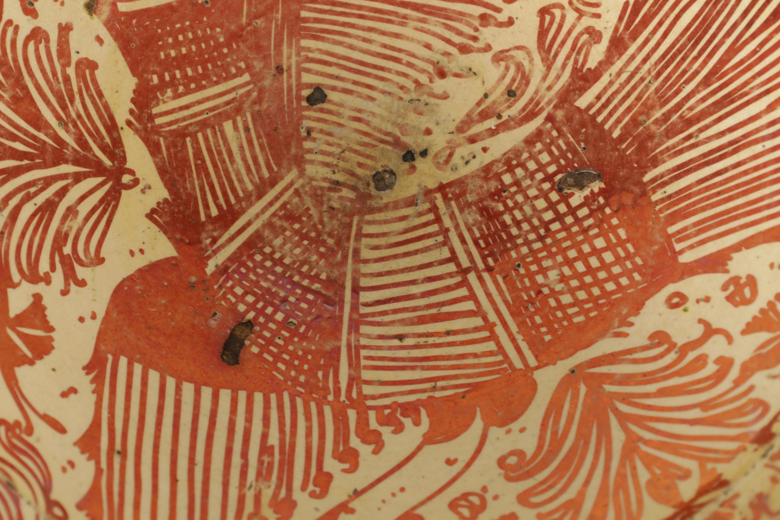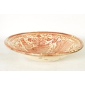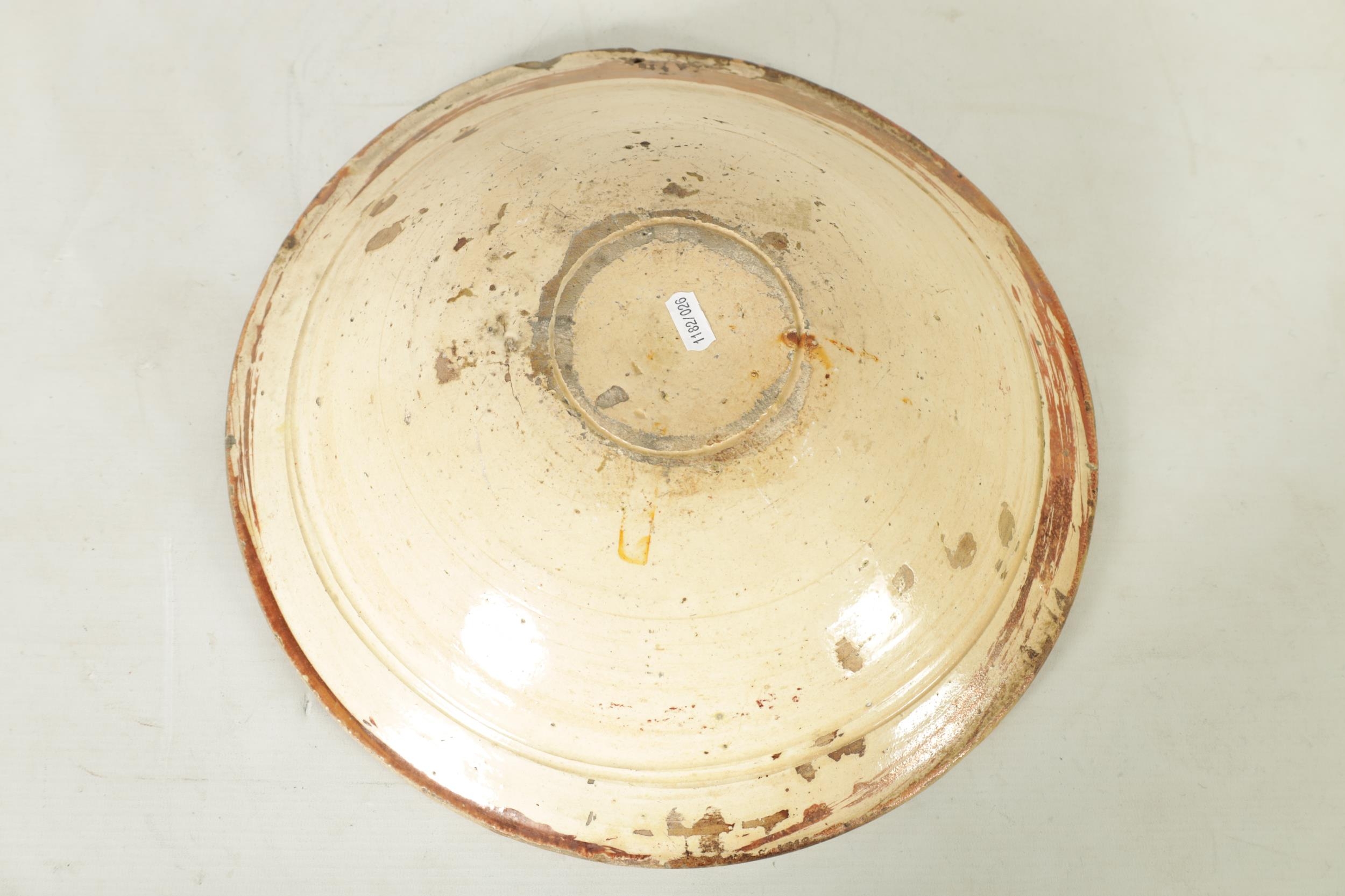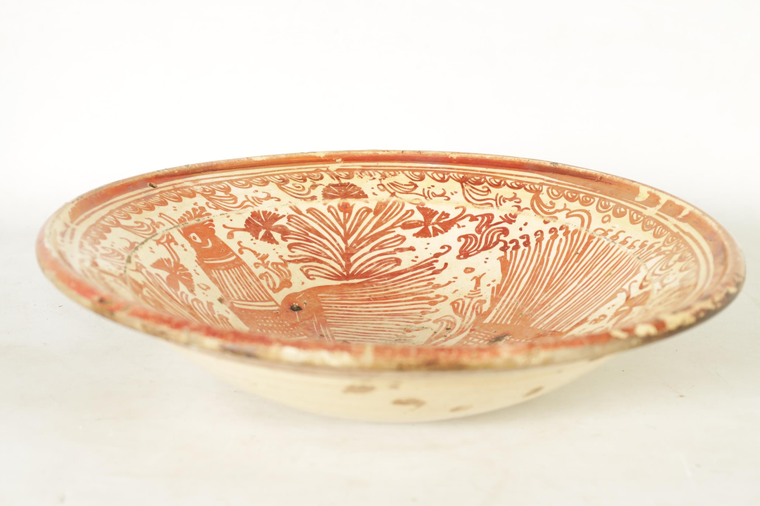 A 17TH CENTURY COPPER LUSTRE HISPANO MORESQUE HANGING CHARGER decorated with central cockerel and scrolling leaf work decoration (39cm diameter )