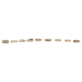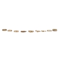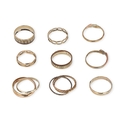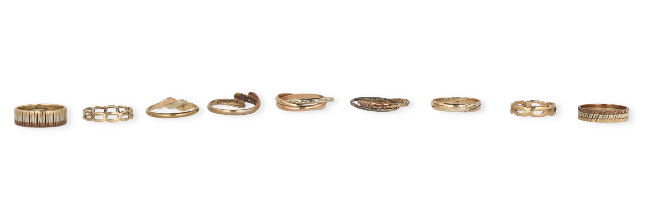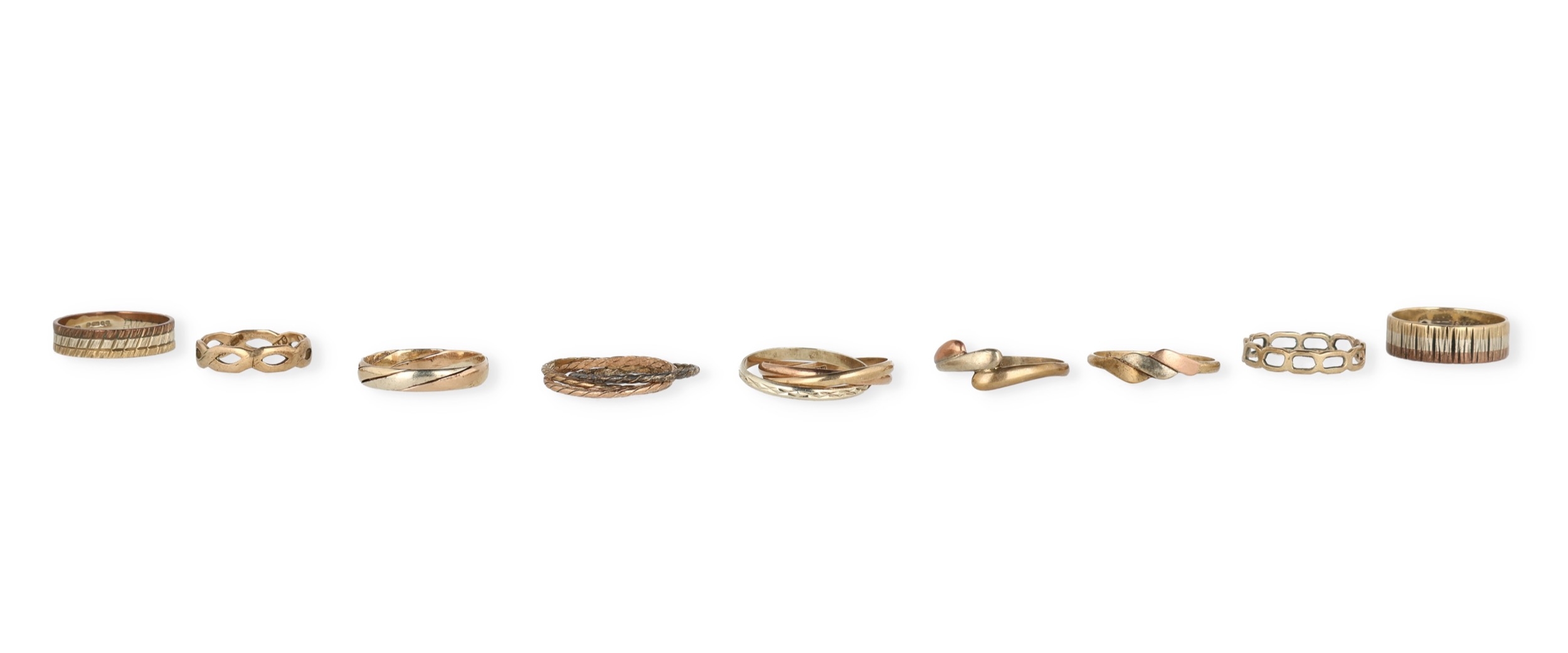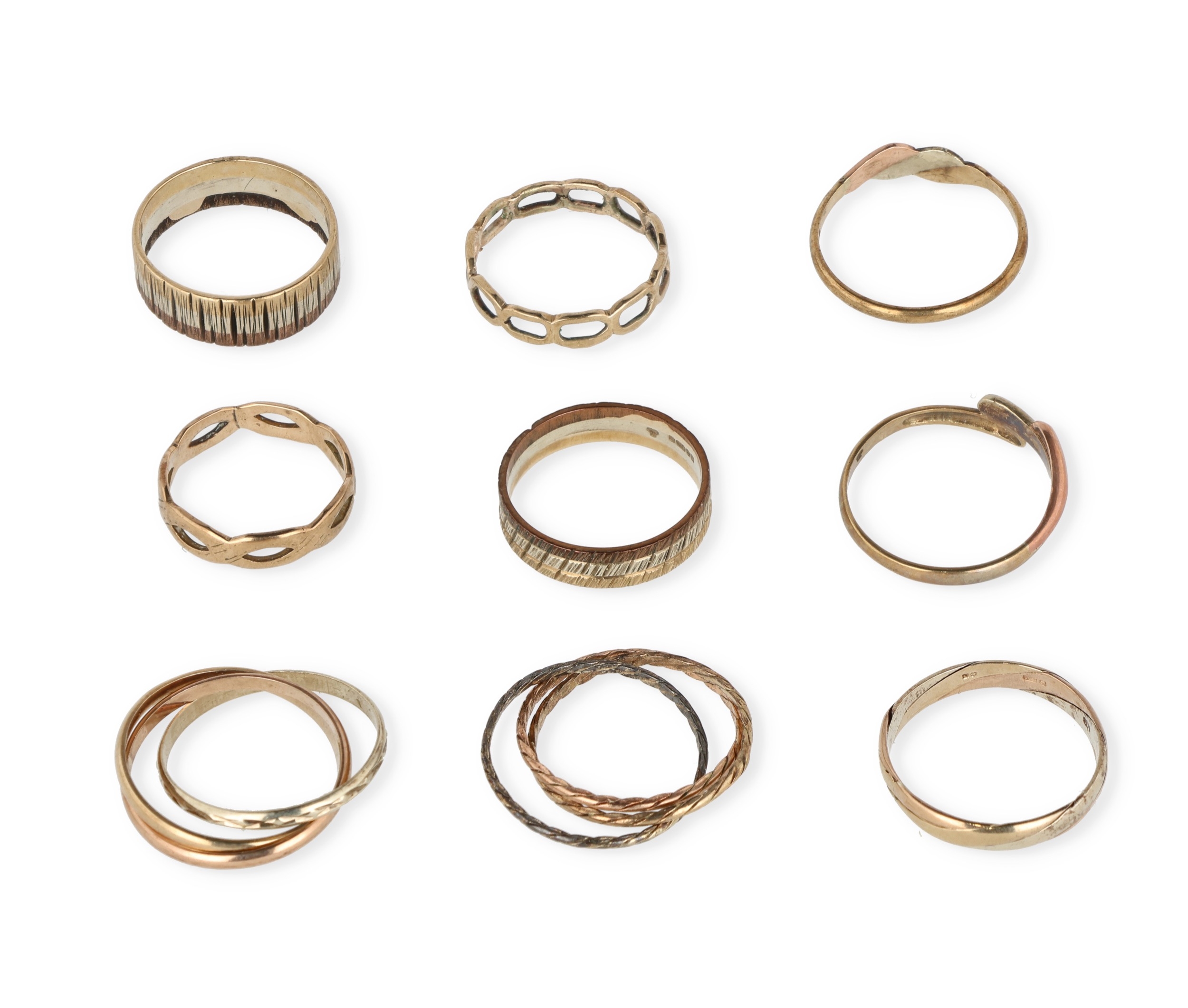 TWO 9CT THREE COLOUR GOLD RUSSIAN WEDDING RINGS, AND SEVEN OTHER 9CT RINGS OF VARYING DESIGN