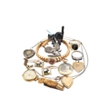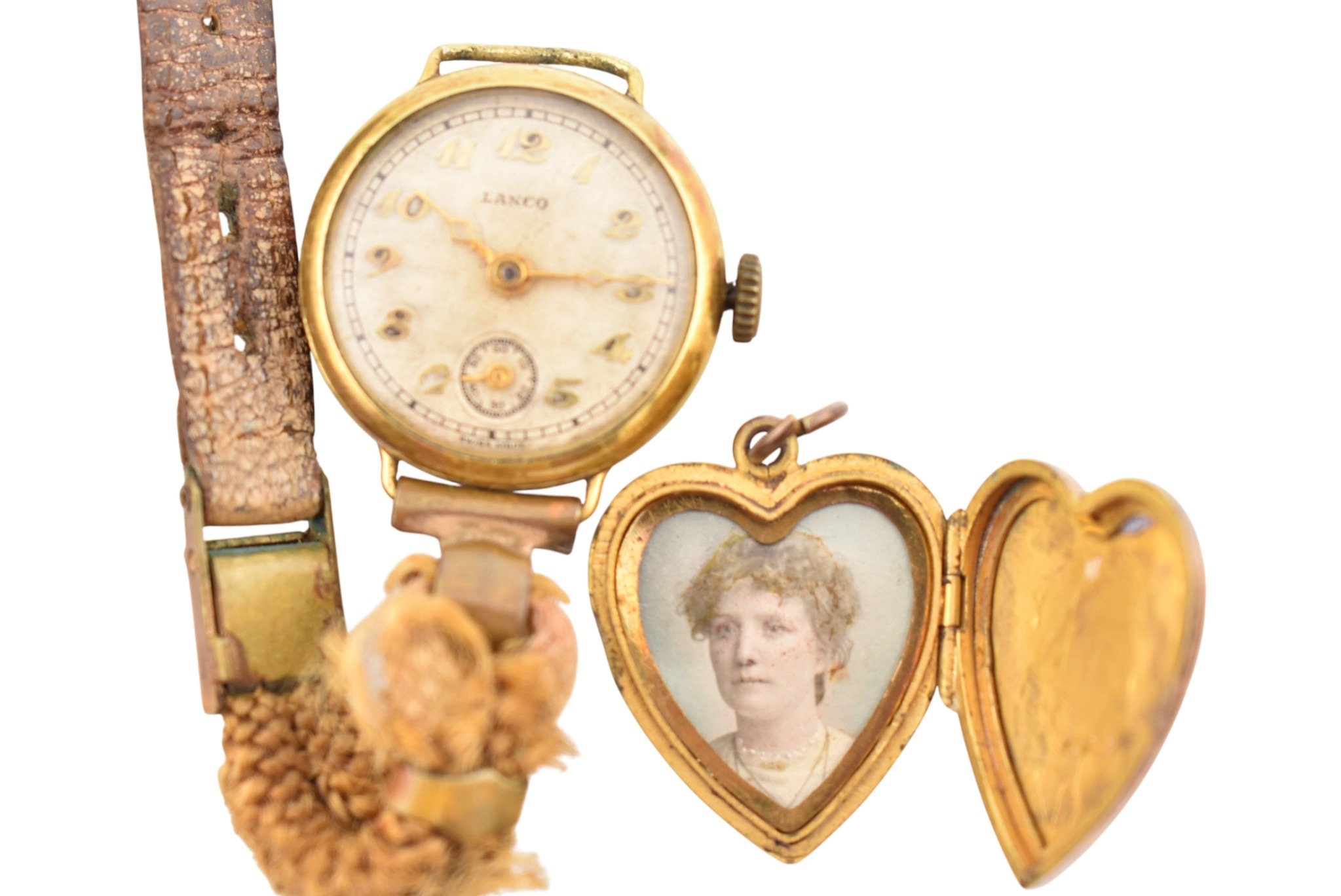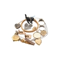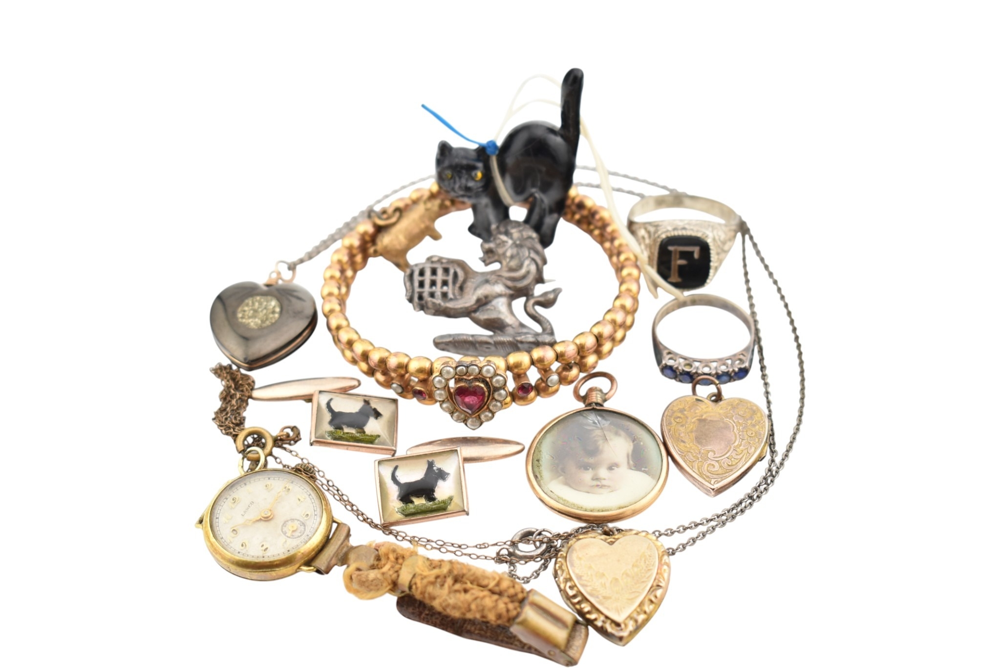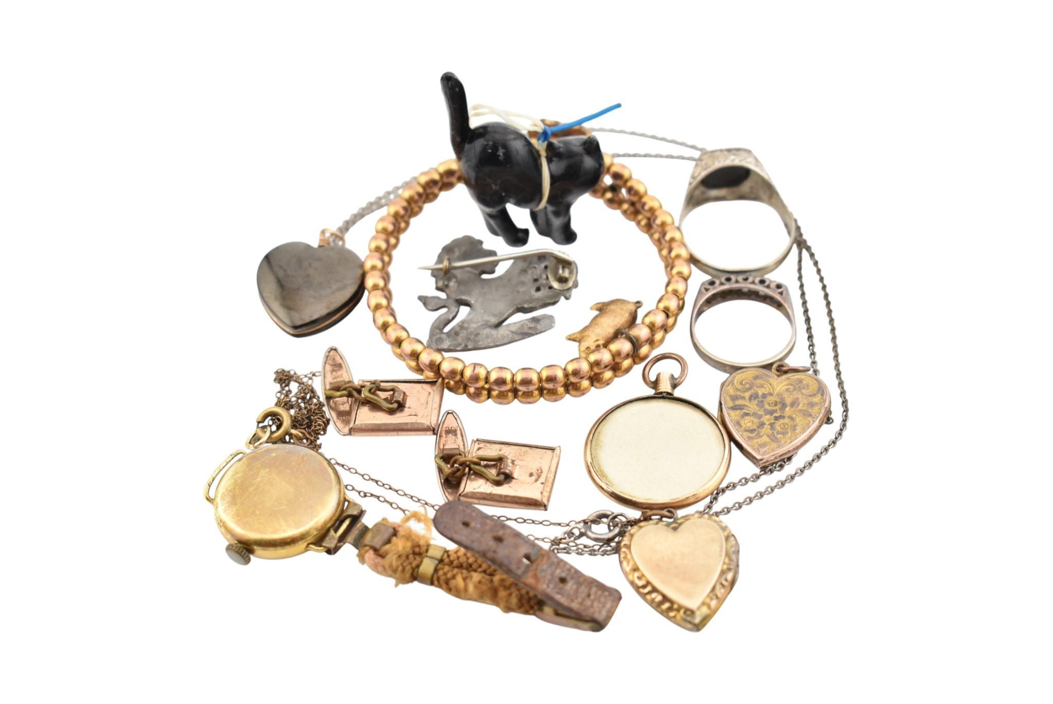 A collection of jewellery and a wristwatch. To include a gold bead bracelet with simulated pearls and paste heart motif strung with a pig charm. Also, 9ct gold back & front heart locket, a heart locket, a round locket, two enamel reverse carved Scottie Dog cufflinks, white metal lion & portcullis brooch, a hematite pendant necklace, 2 silver rings and a resin cat pendant.
