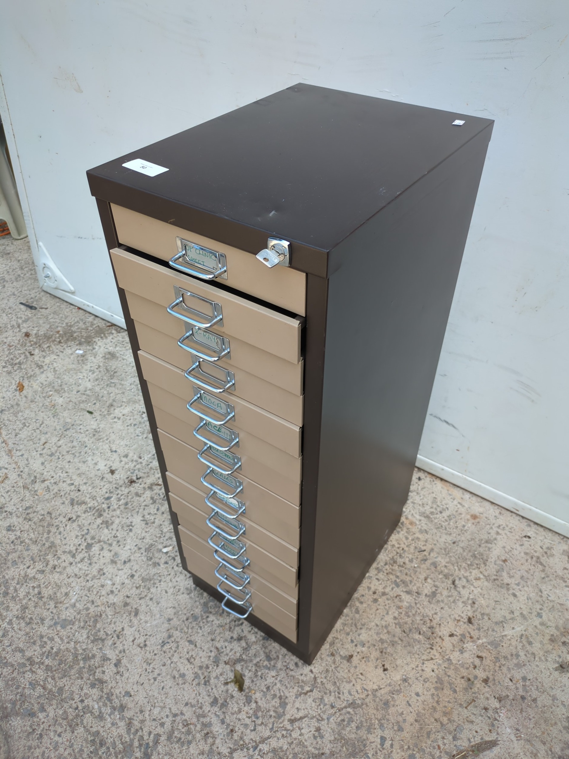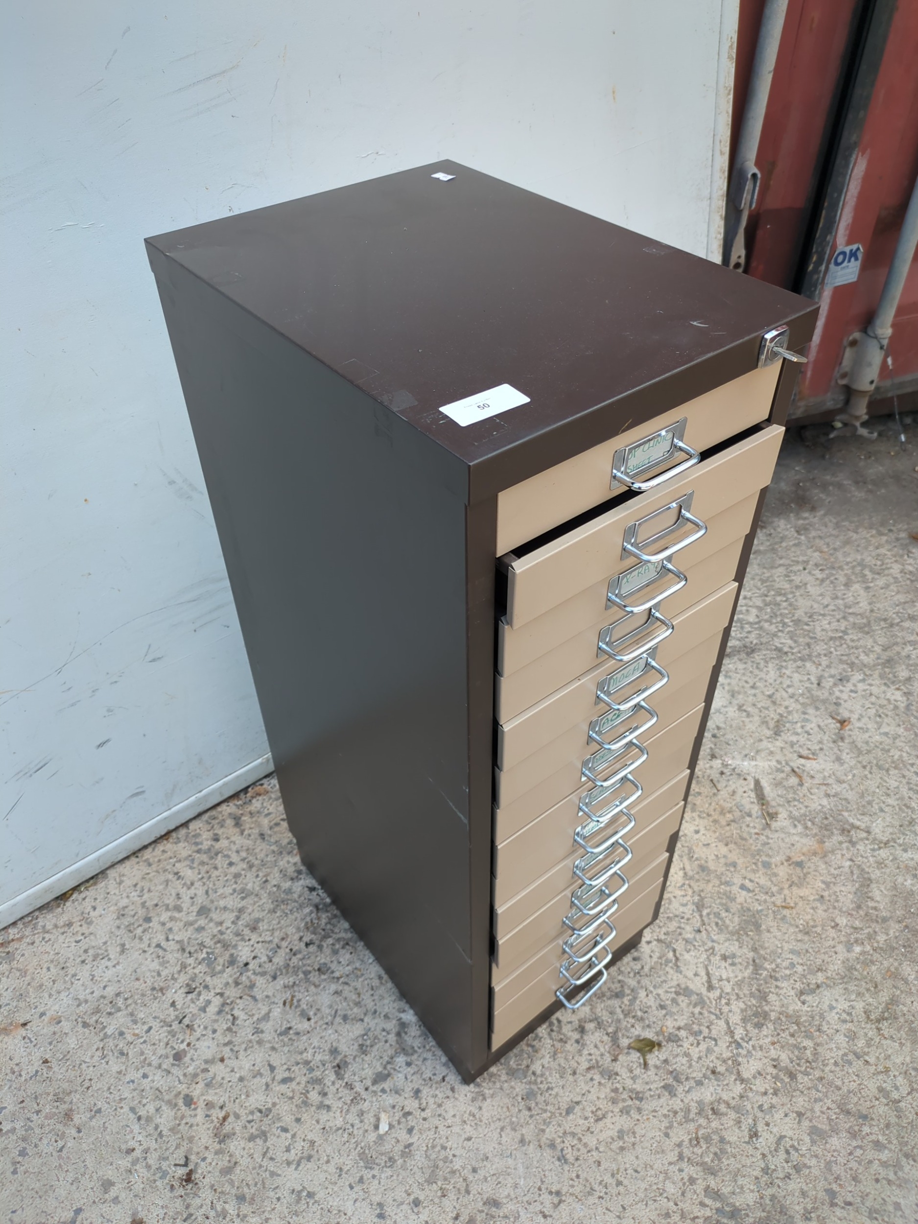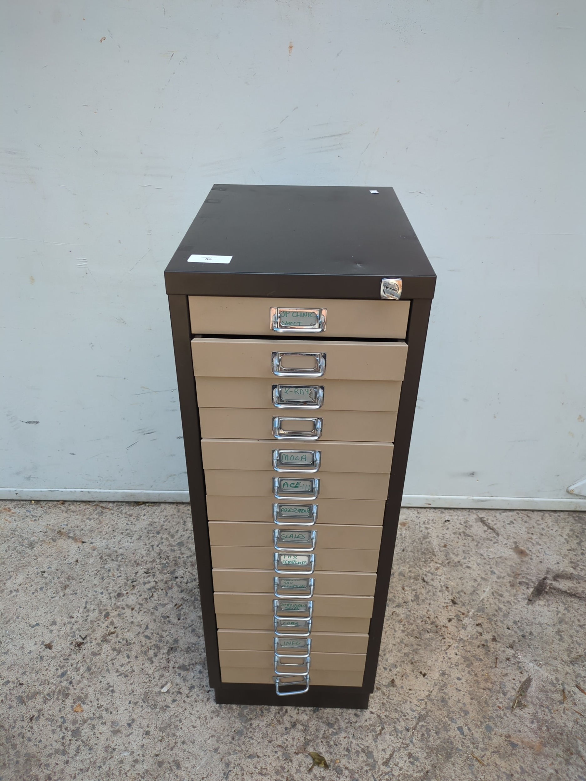 A metal 15 drawer filing cabinet