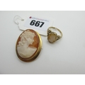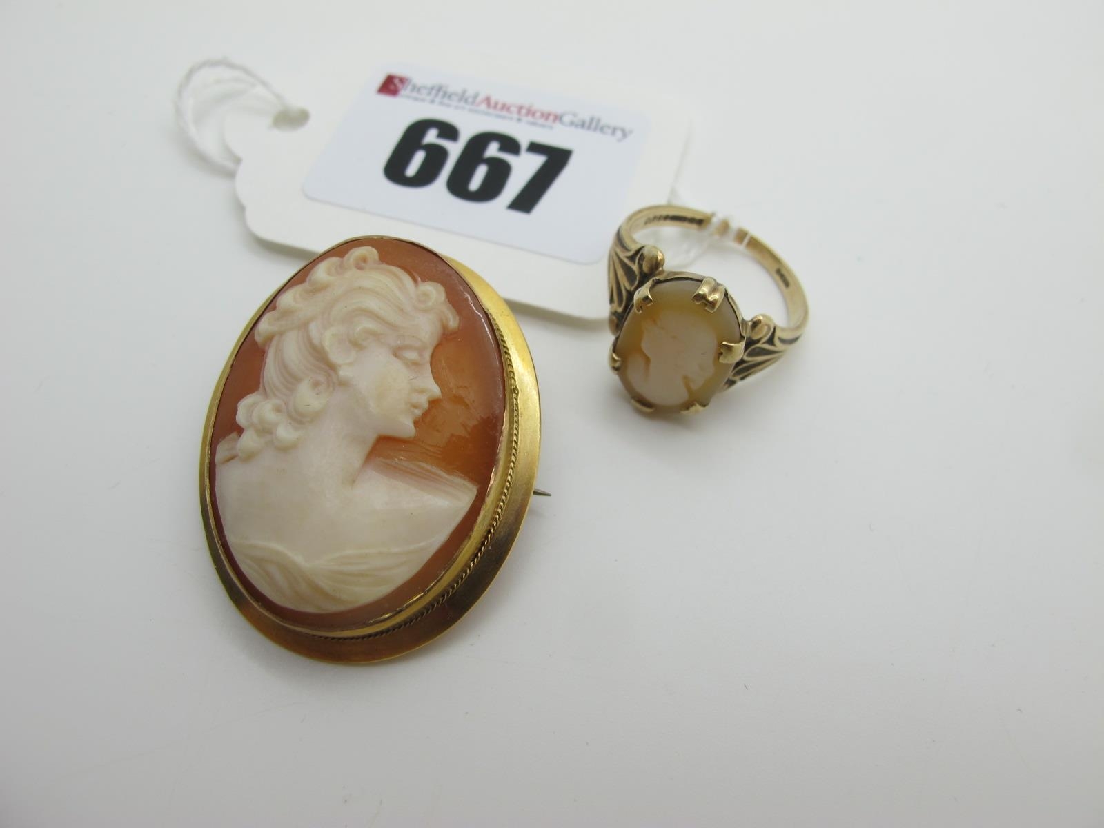 A 9ct Gold Oval Shell Carved Cameo Ring, (shank split); together with an oval shell carved cameo brooch, stamped "9ct". (2)
