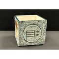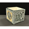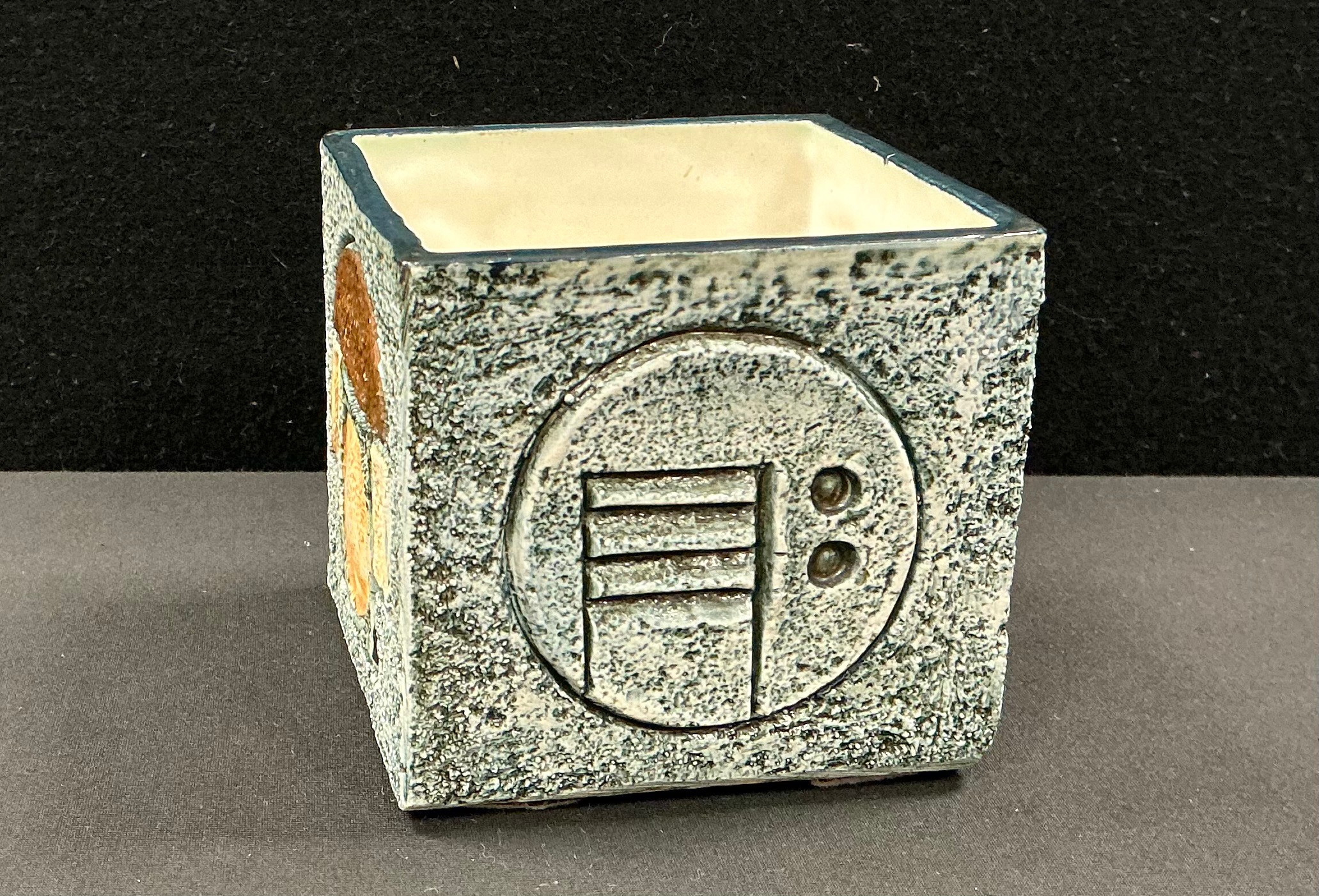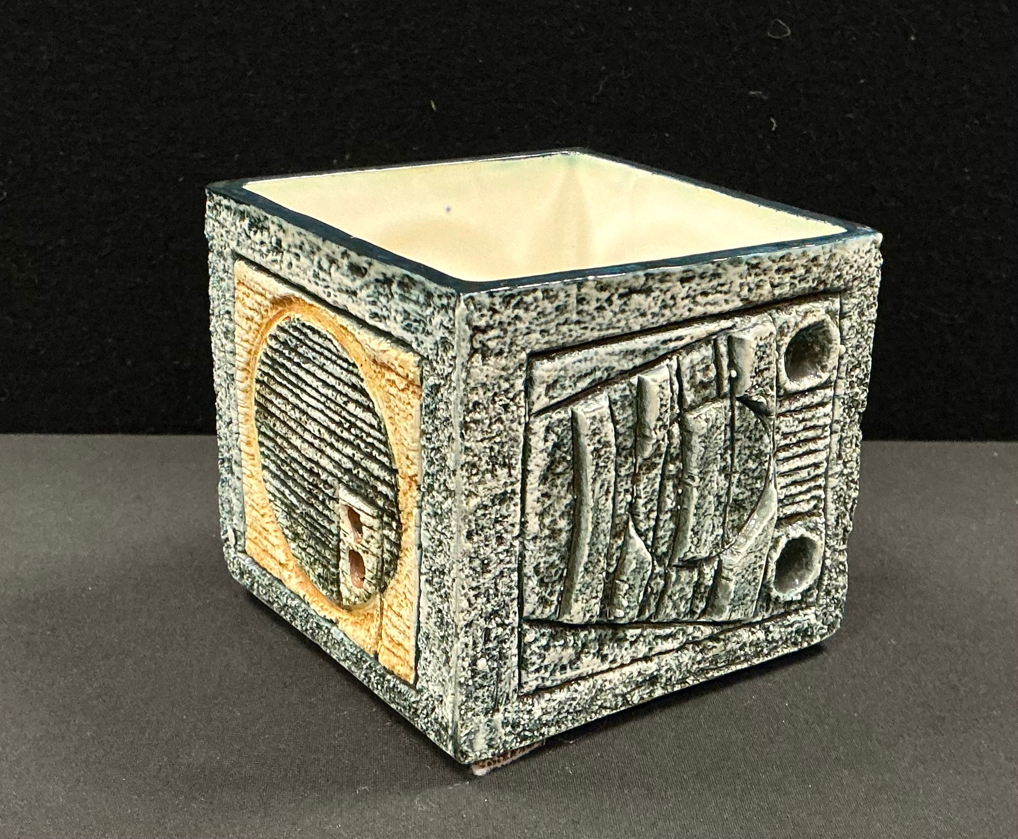 A Troika cube vase, by Jane Fitzgerald, decorated and incised with geometric shapes in shades of oatmeal and brown on a sea green textured ground, 8.5cm high, monogrammed, painted marks, c.1978