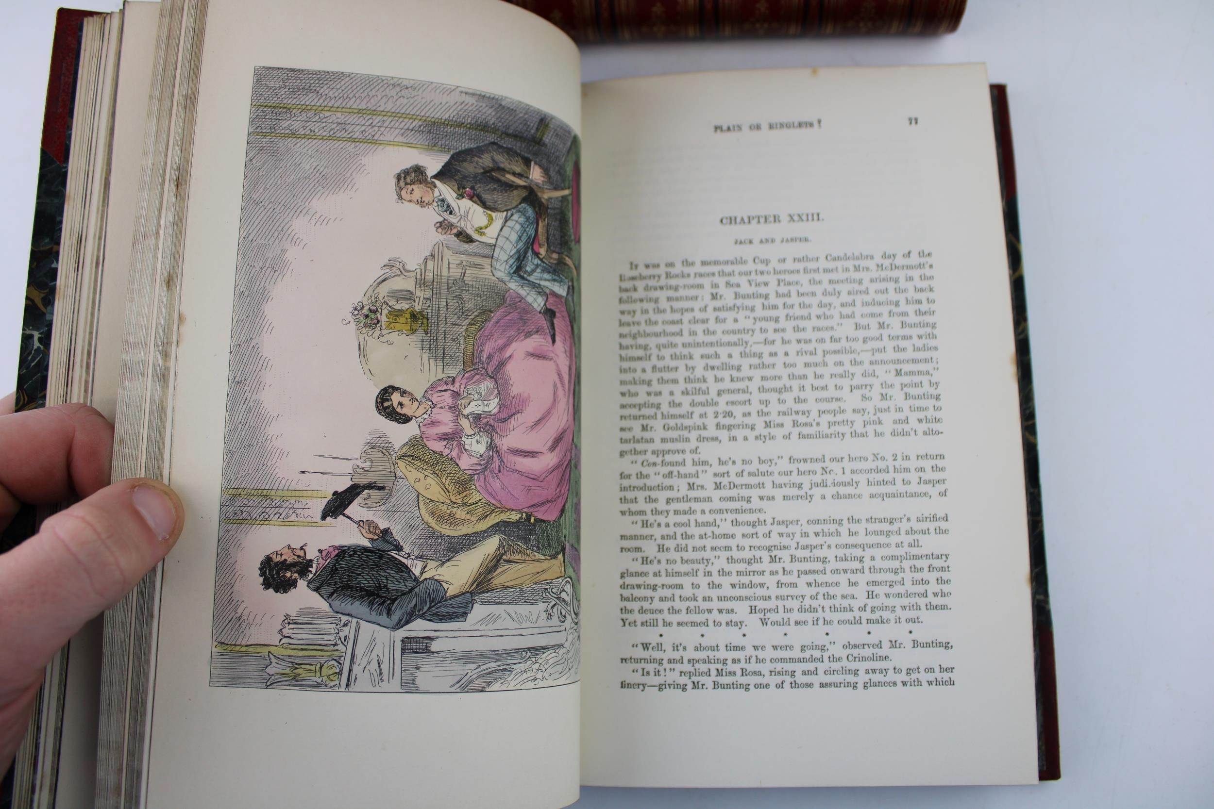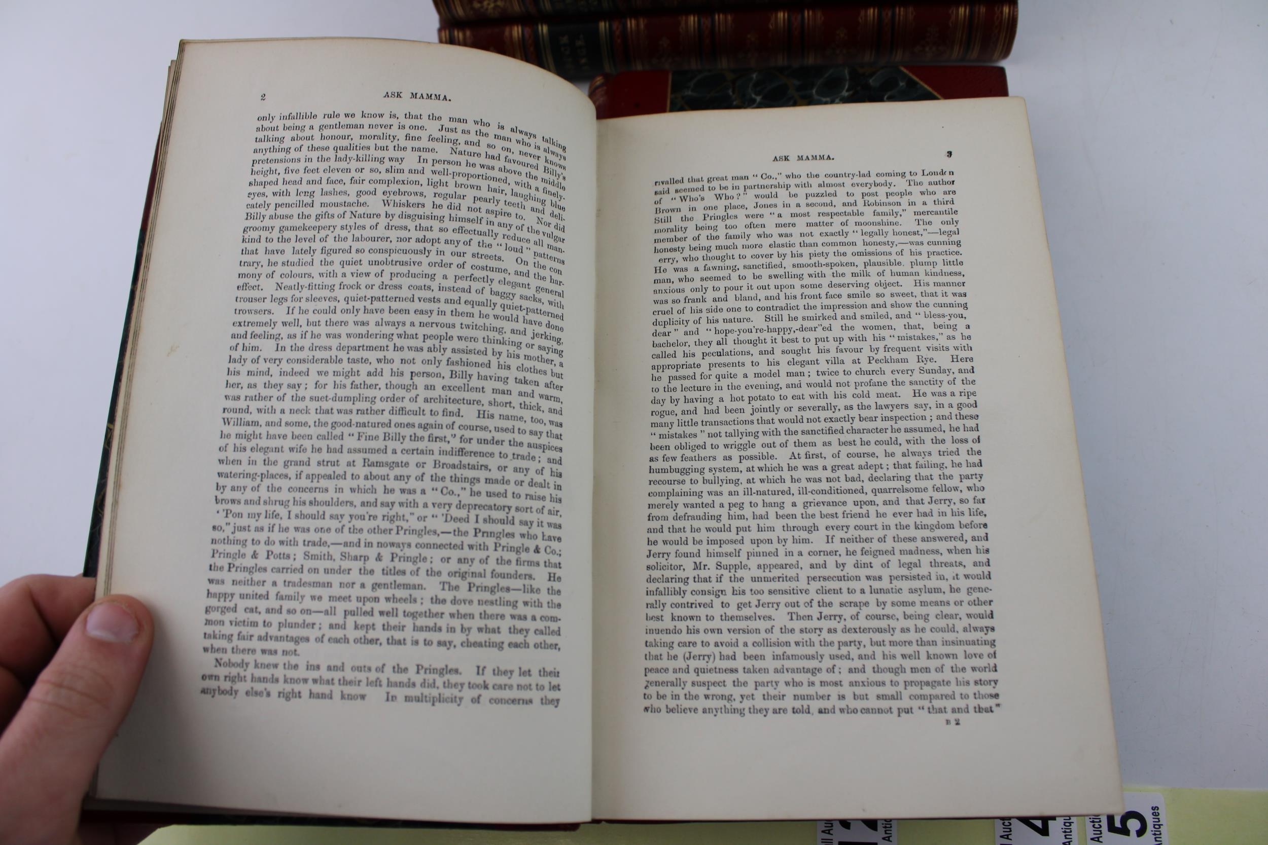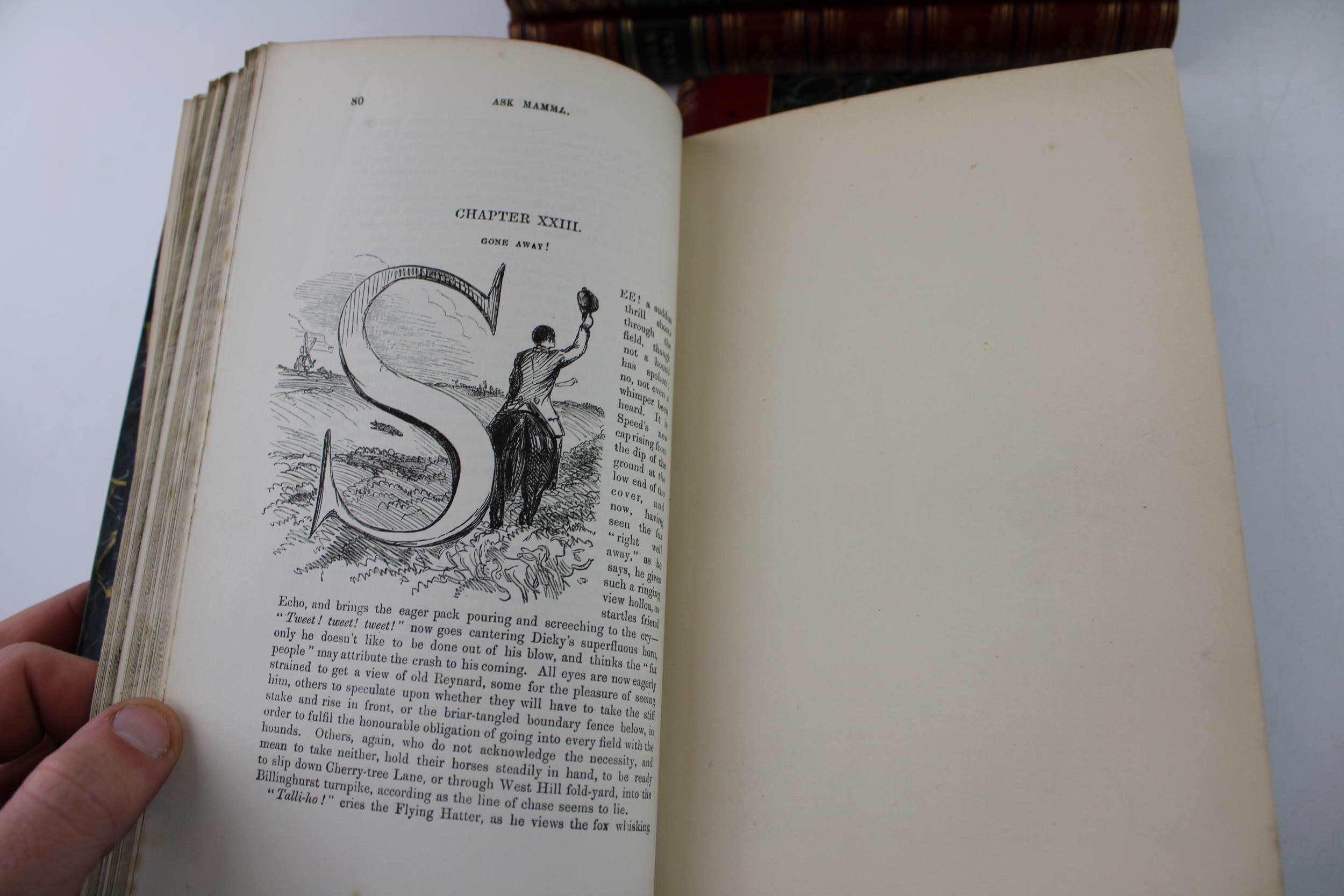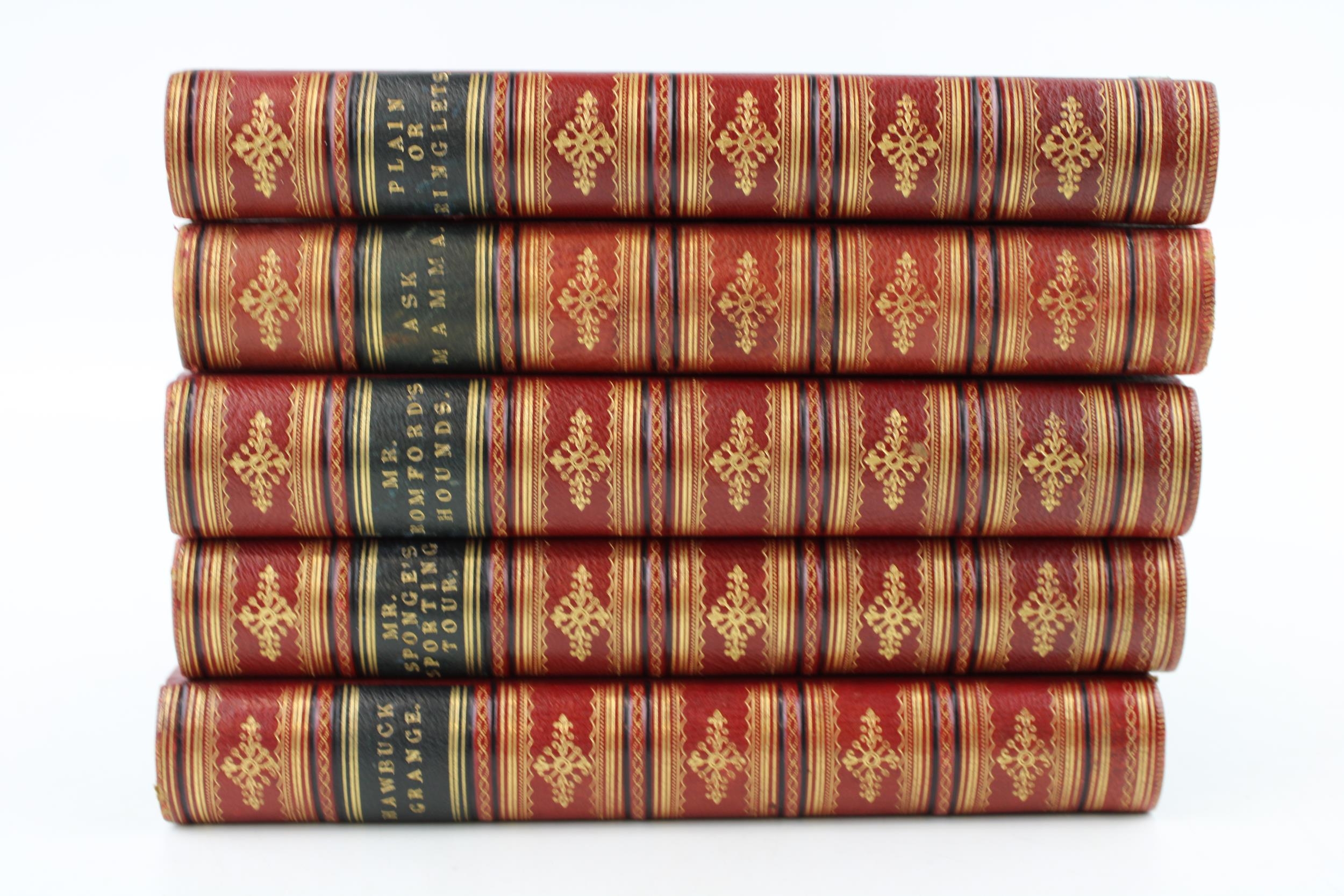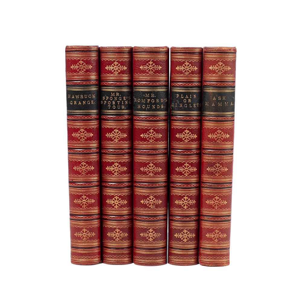 5 books c 1860 by Robert S Surtees - Mr Sponge’s Sporting Tour, Mr Romford’s Hounds, Ask Mama, Hawbuck Grange & Plain or Ringlets. All with matching very high quality original leather bindings and each measuring 22.5cm x 16cm x 3.25cm deep appx.