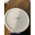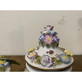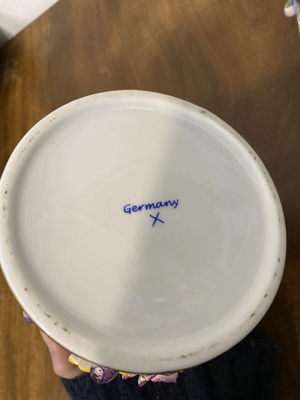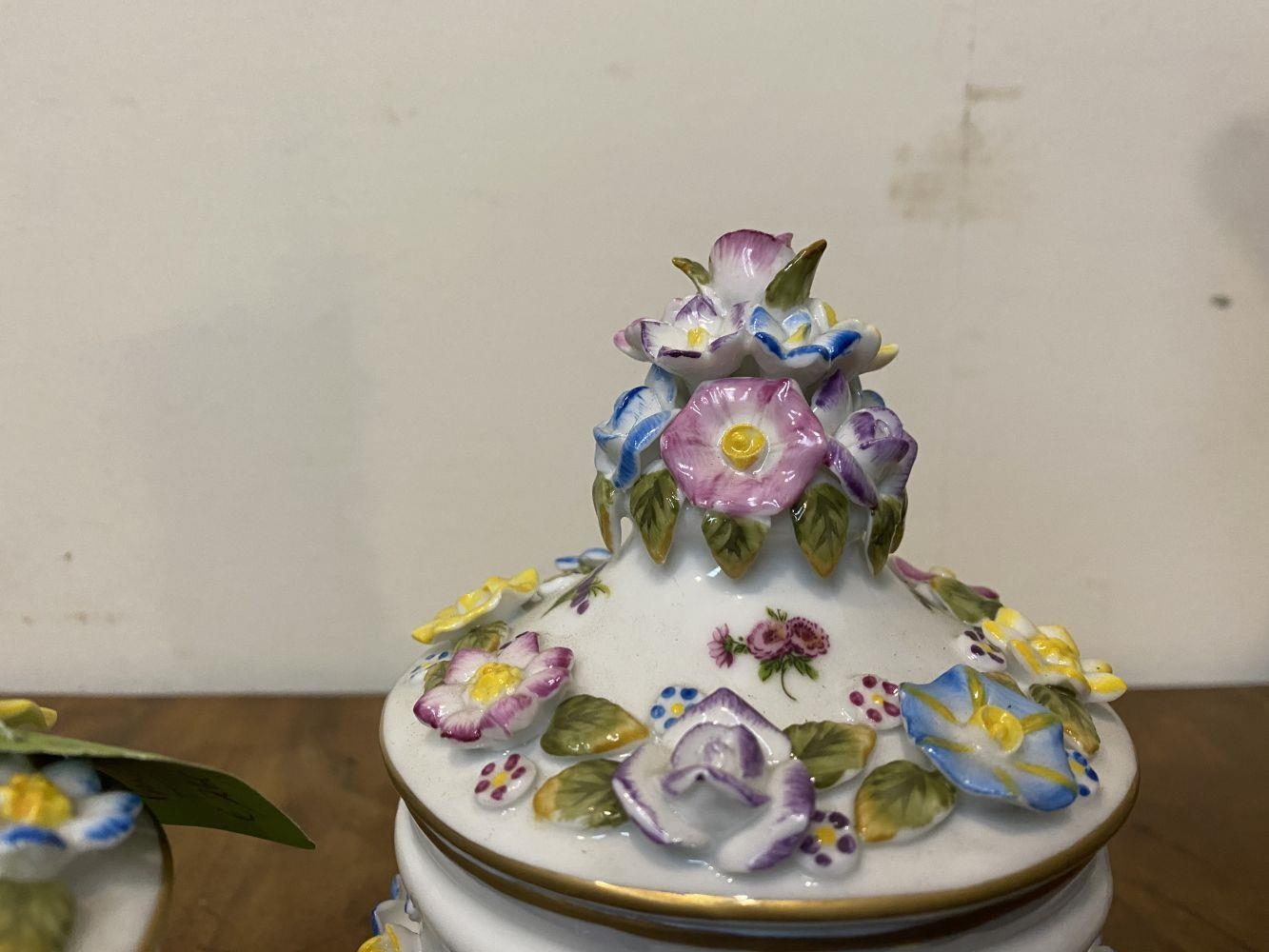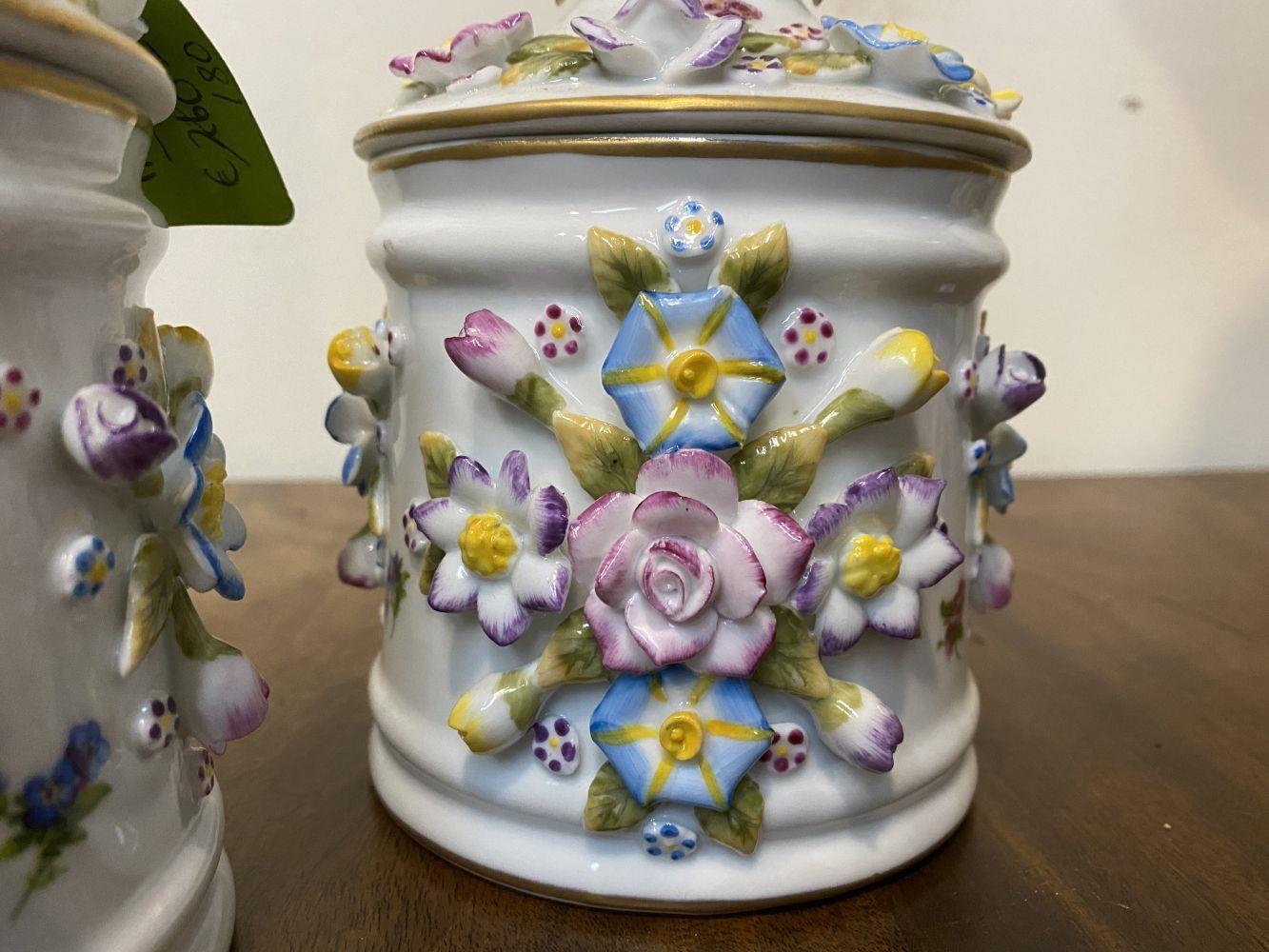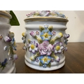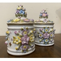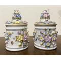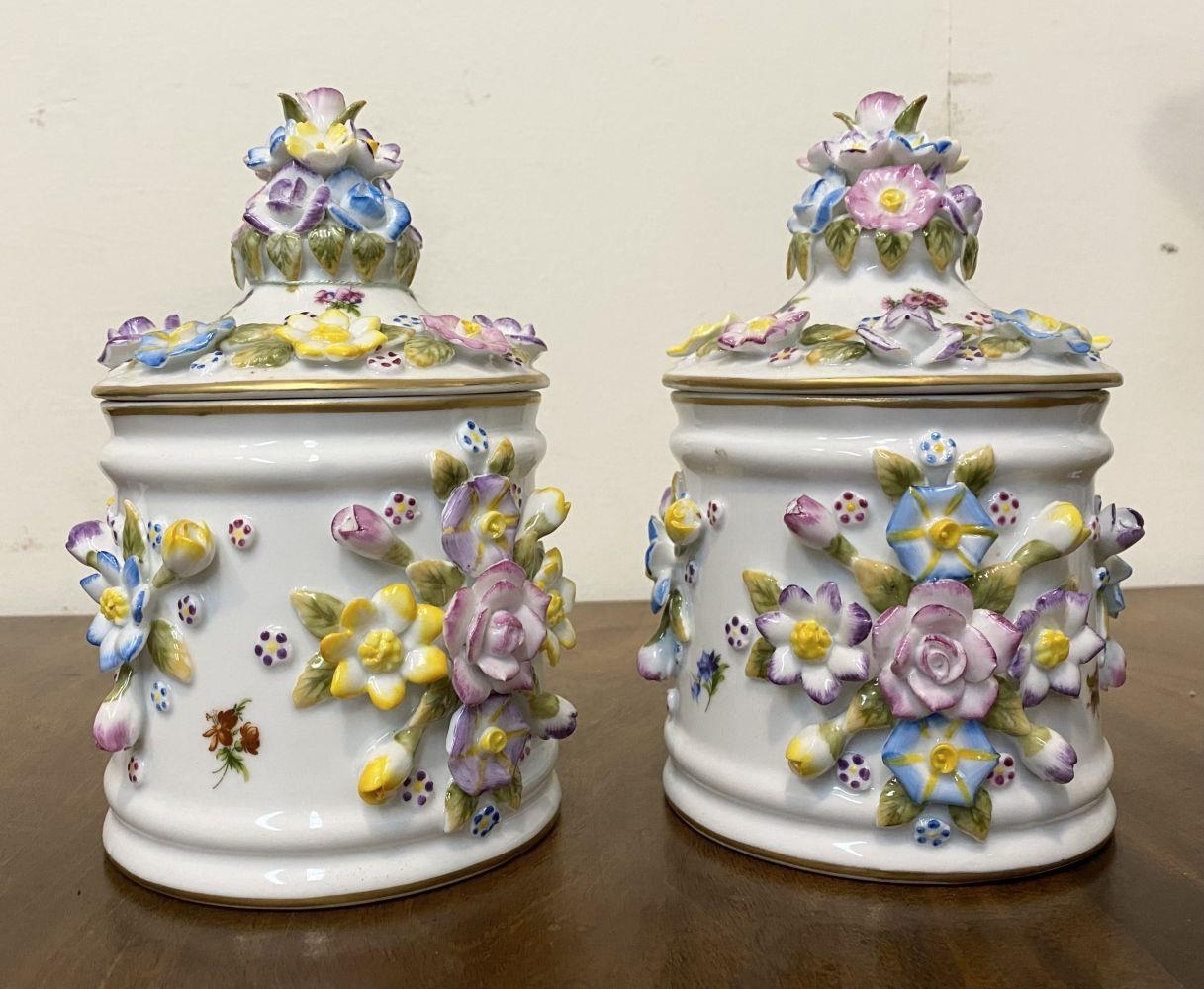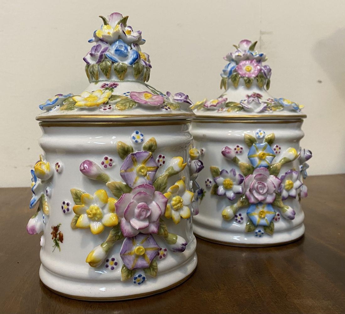 A PAIR OF VINTAGE GERMAN PORCELAIN COVERED POTS, c.1945, hand painted decoration with floral design in relief. Marked to base. Dimensions: 18cm high including covers