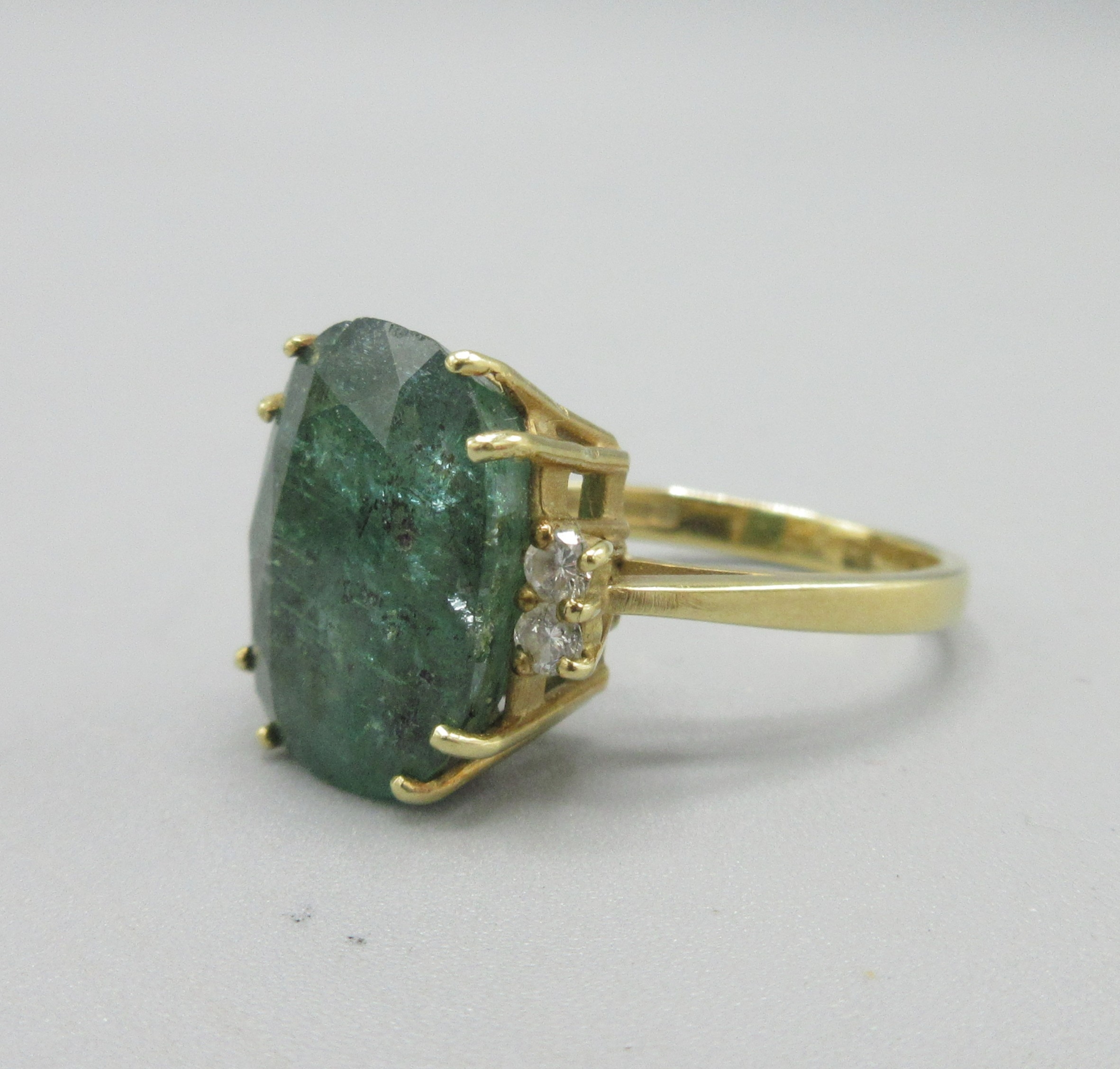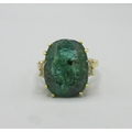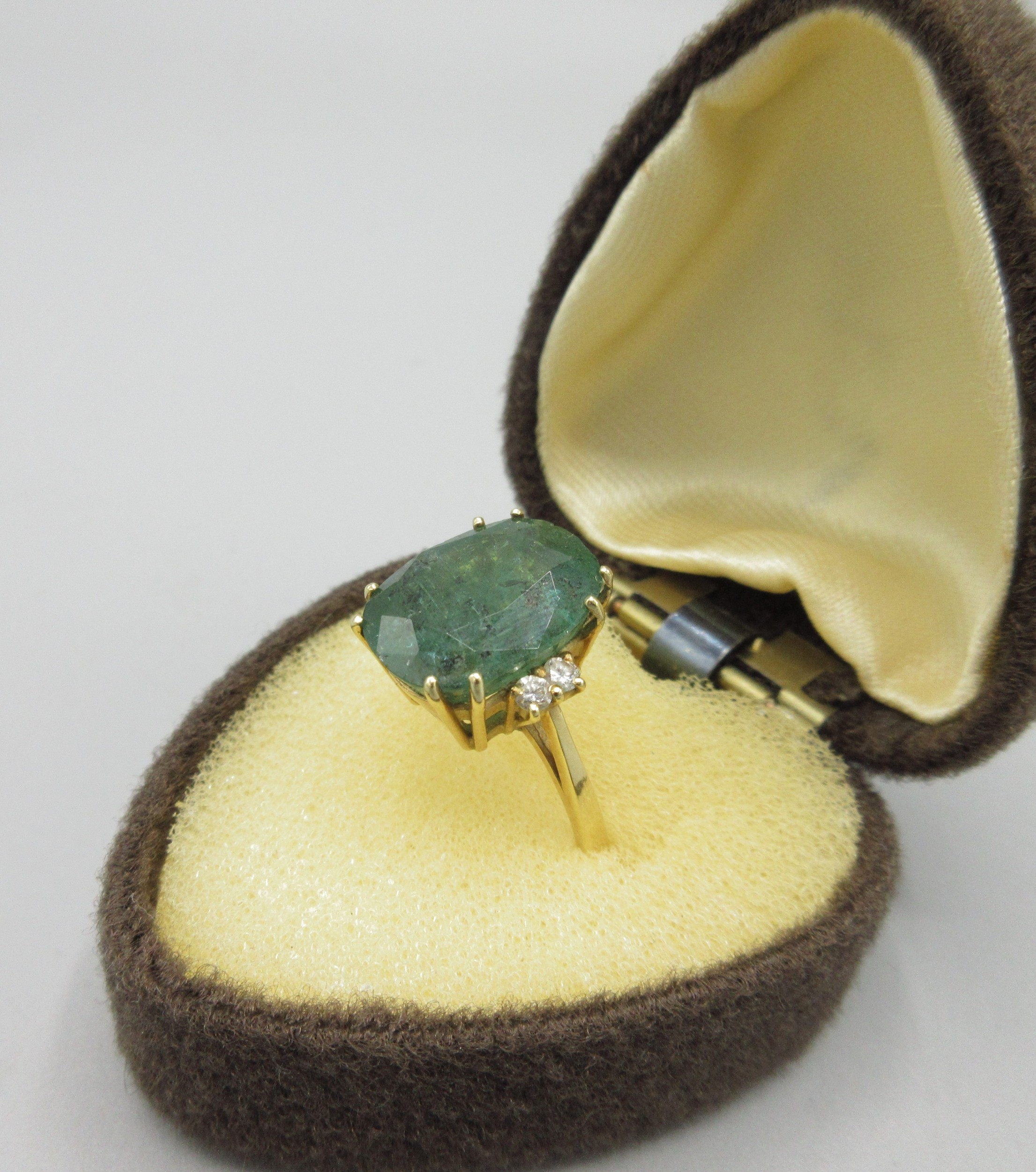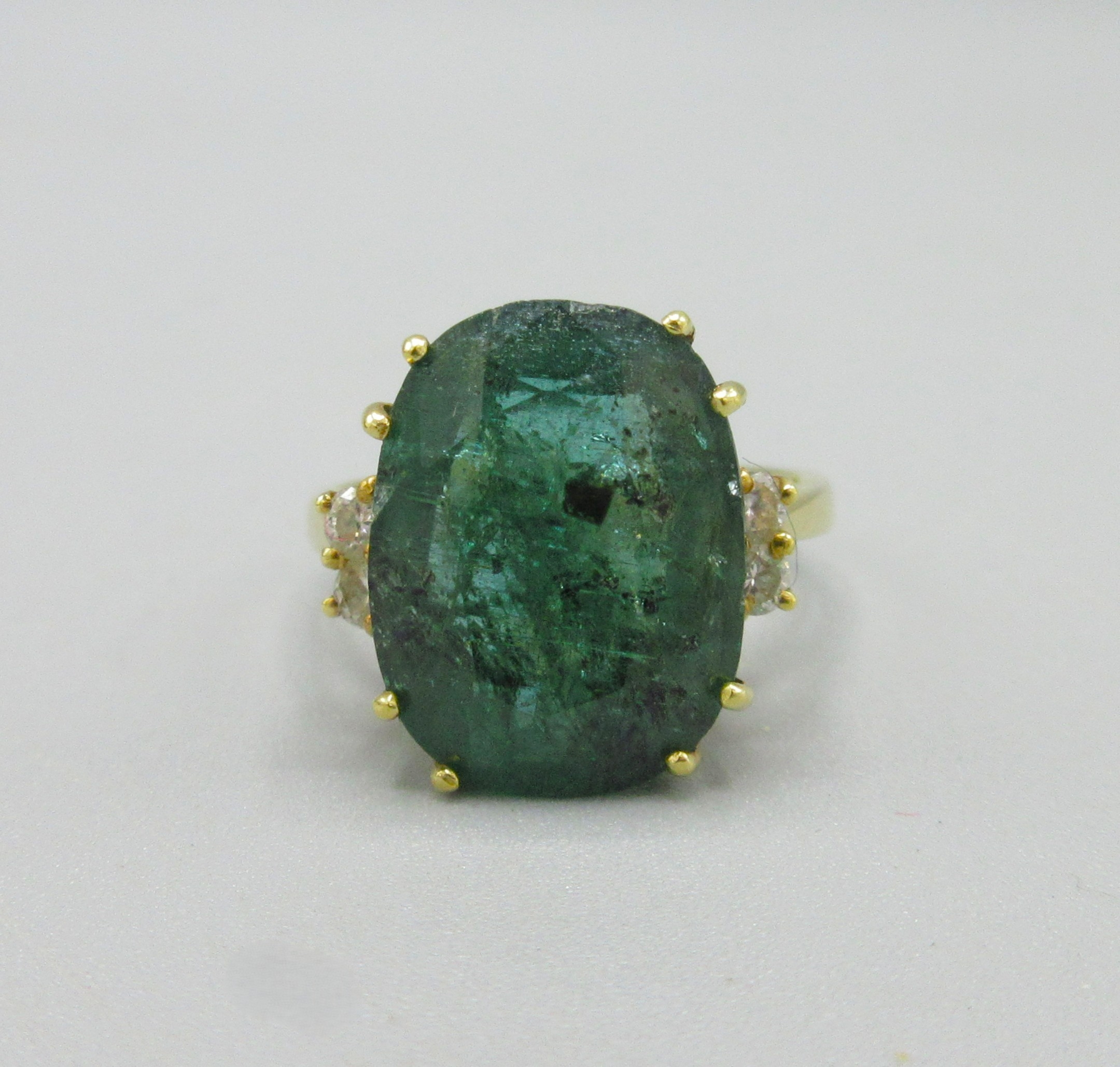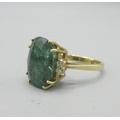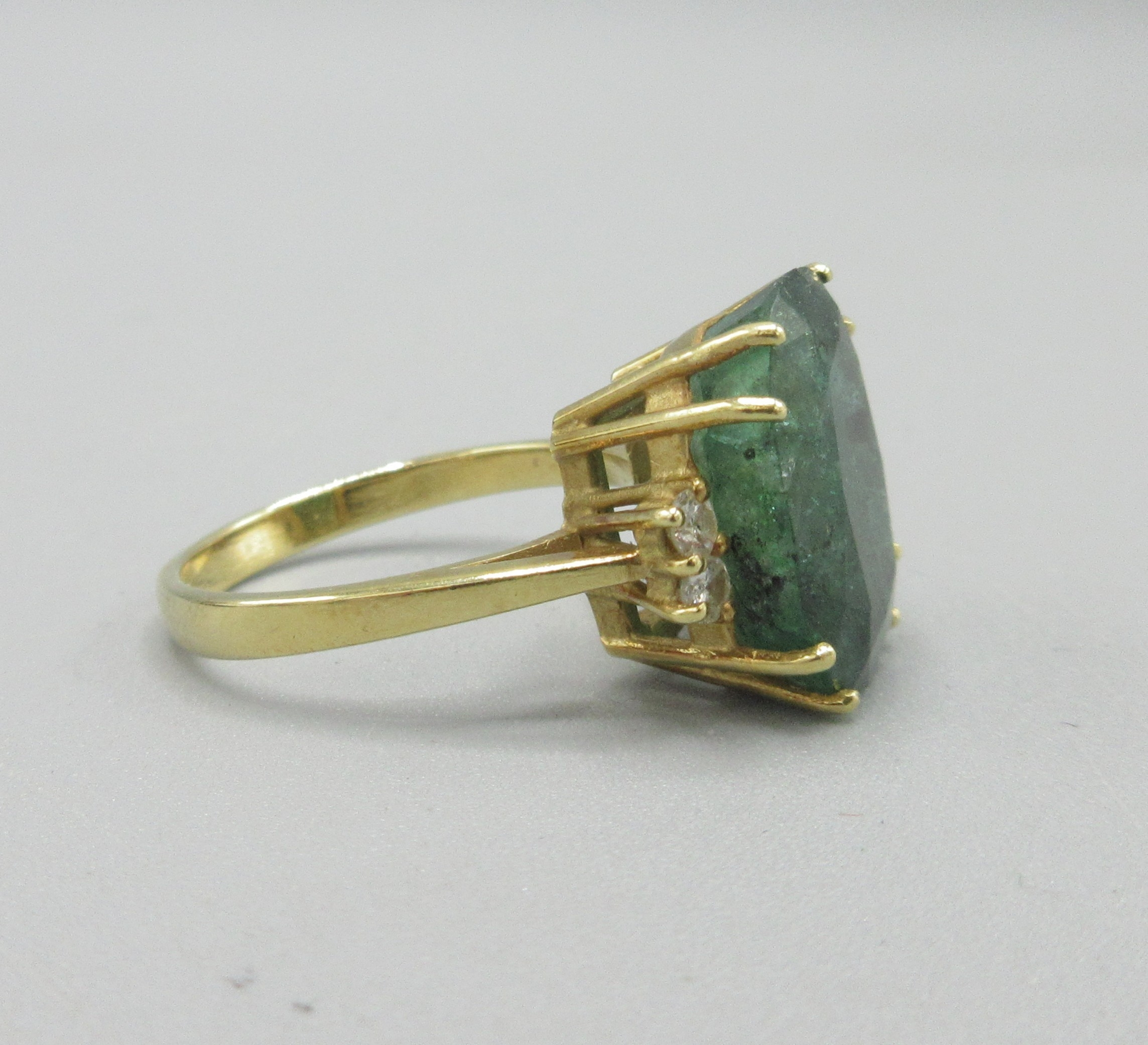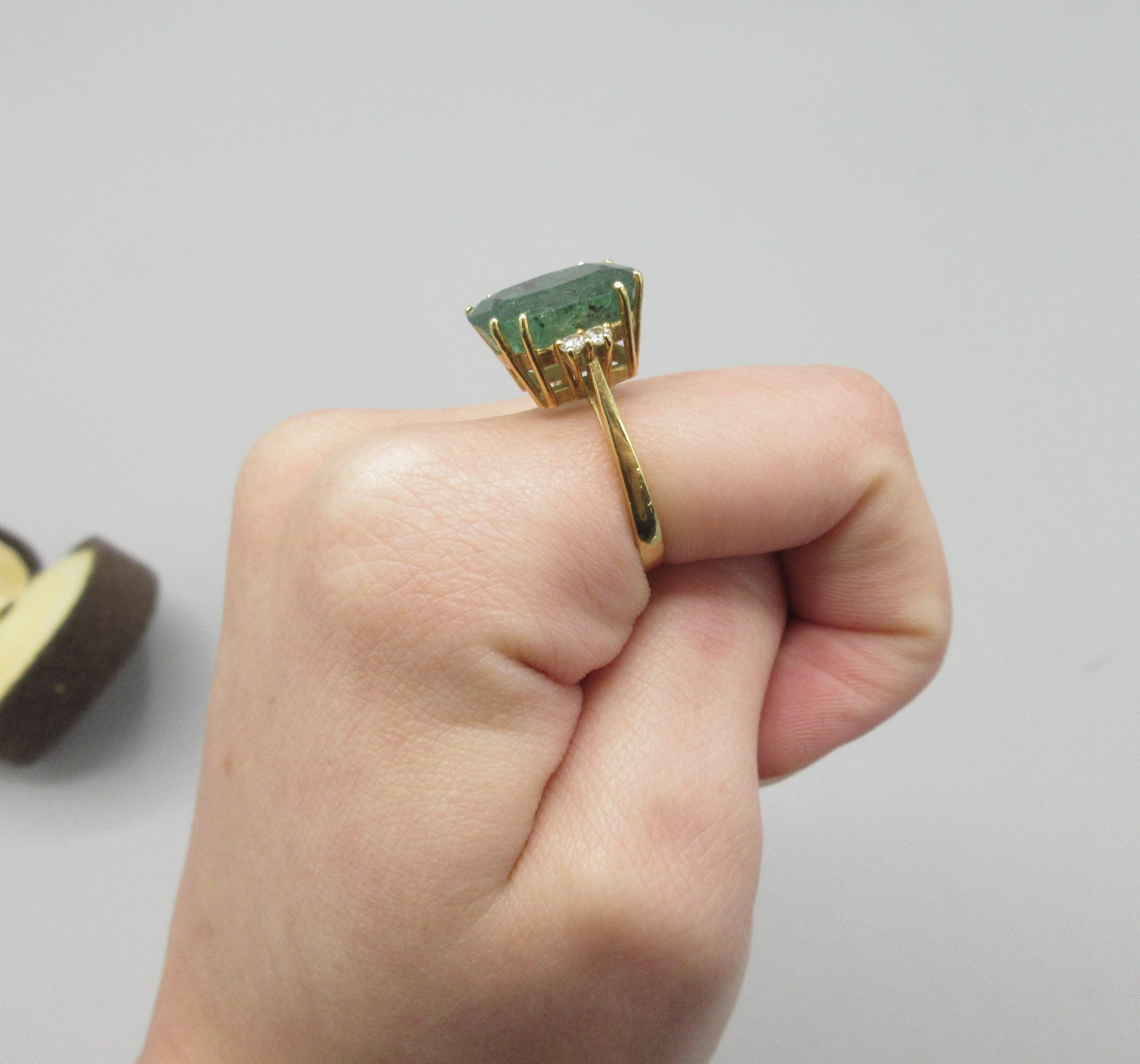 20th century 18ct yellow gold ring set with large cushion cut emerald flanked by two diamonds, emerald 15X11mm, size O, 5.8g, with 1993 insurance receipt