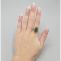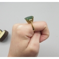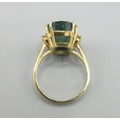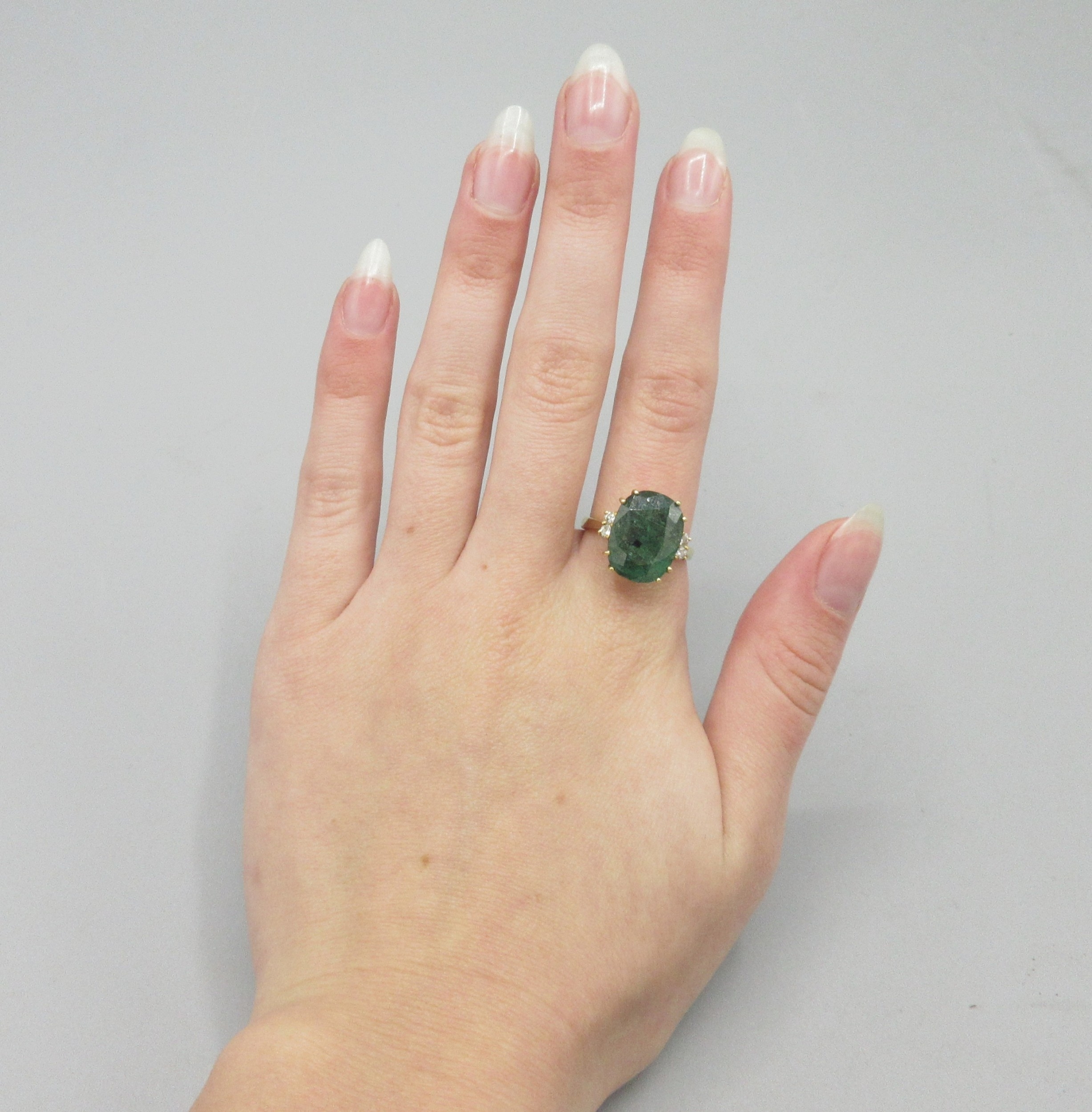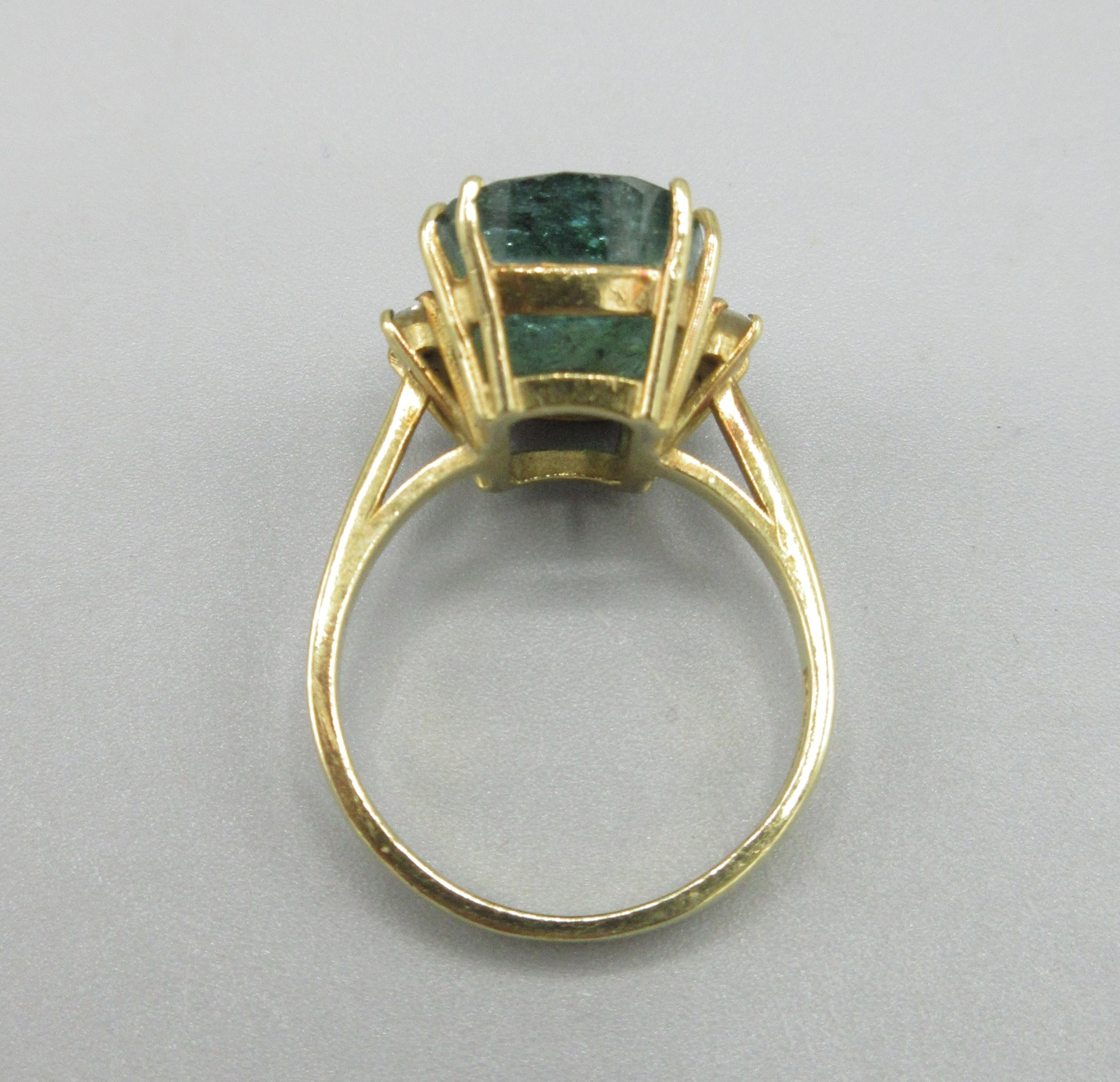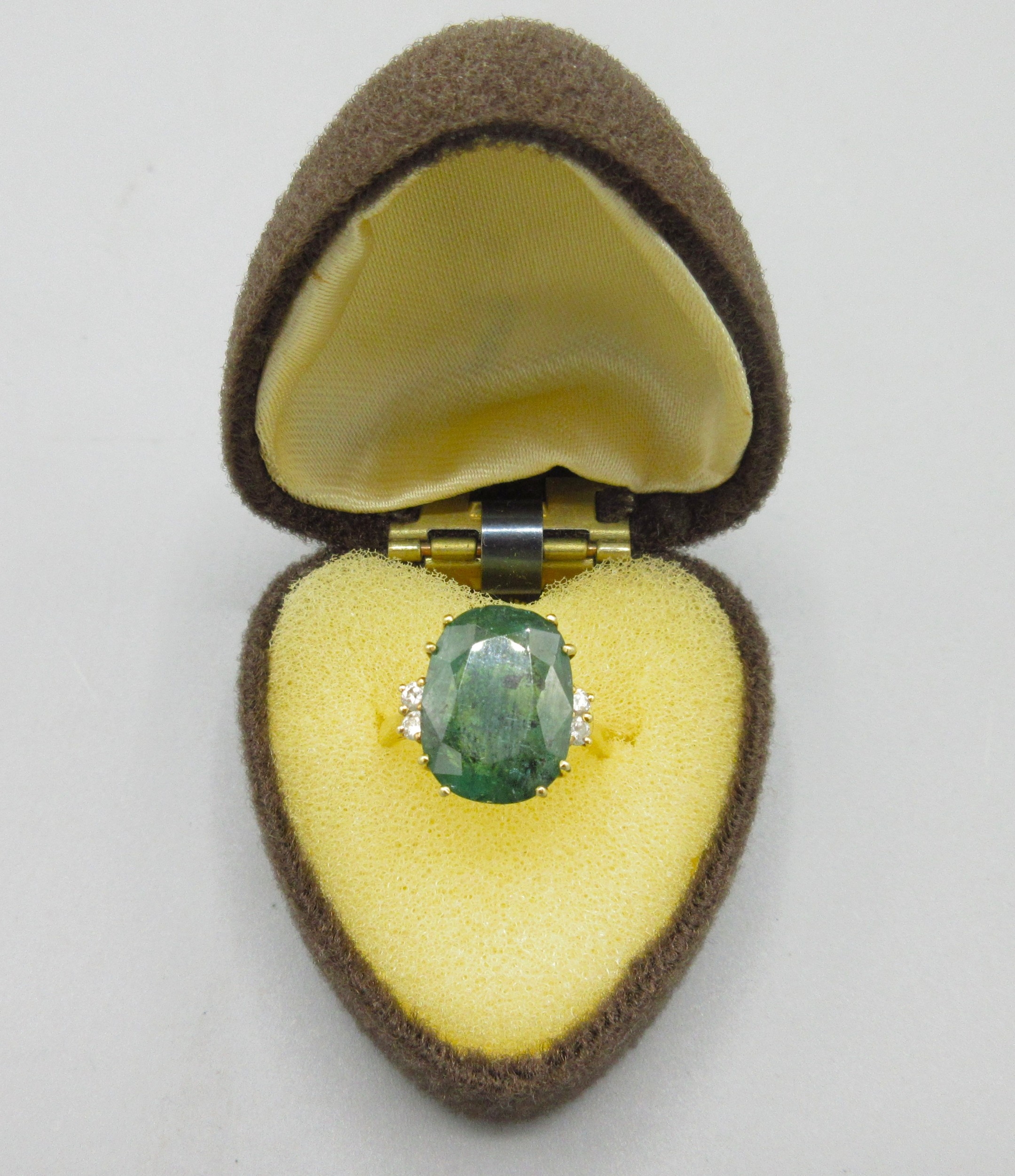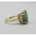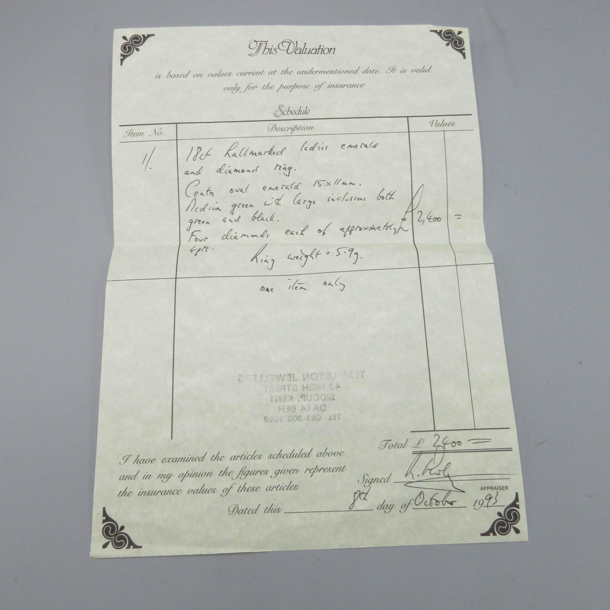 20th century 18ct yellow gold ring set with large cushion cut emerald flanked by two diamonds, emerald 15X11mm, size O, 5.8g, with 1993 insurance receipt