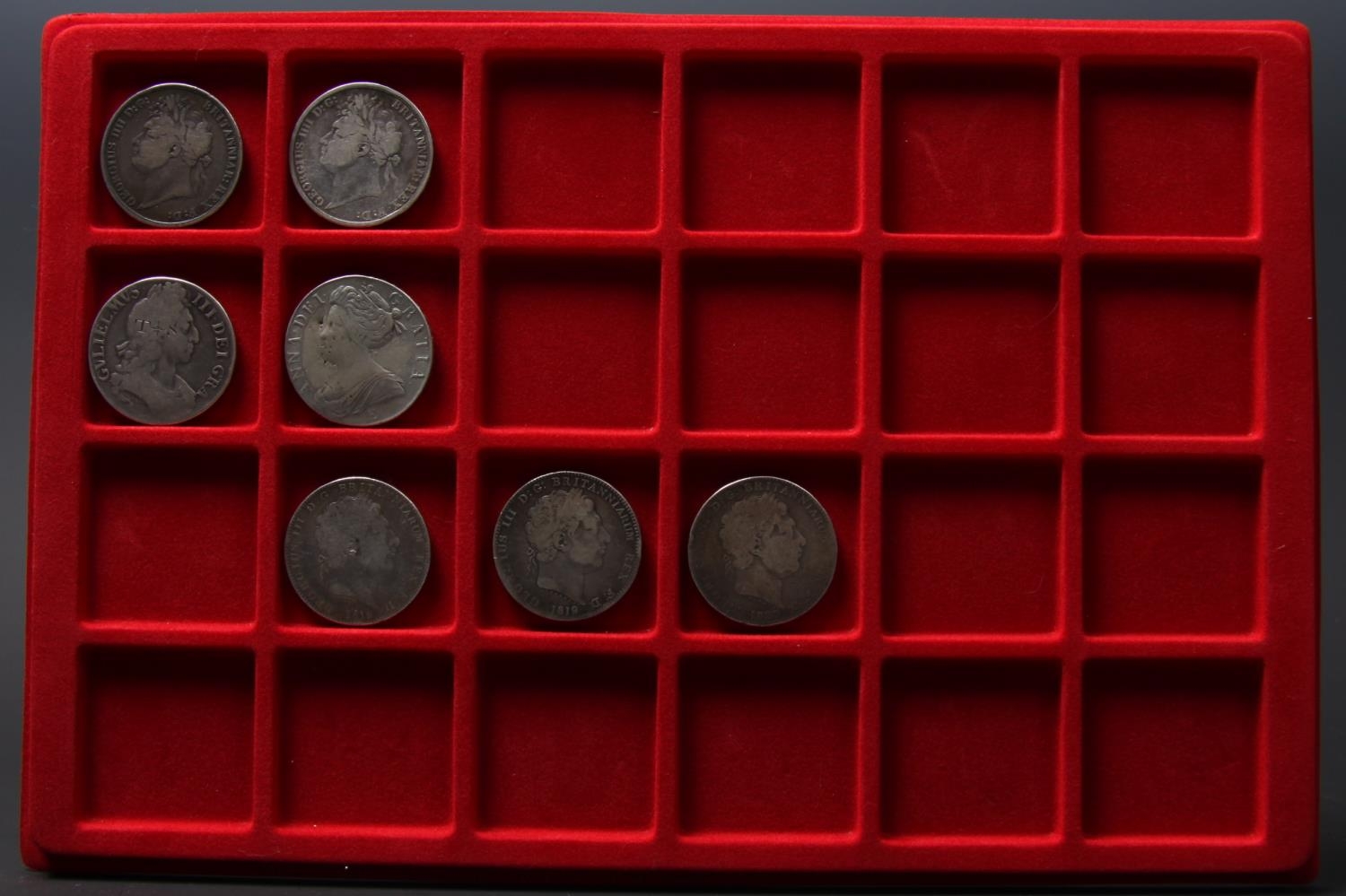 Coins, Great Britain, Crowns, 1696, T*S engraved centre of head, vg; 1707E, engraving and brooch mount removed, Fine; 1818, 19, 20, 21, 22, mostly vg-F [7]