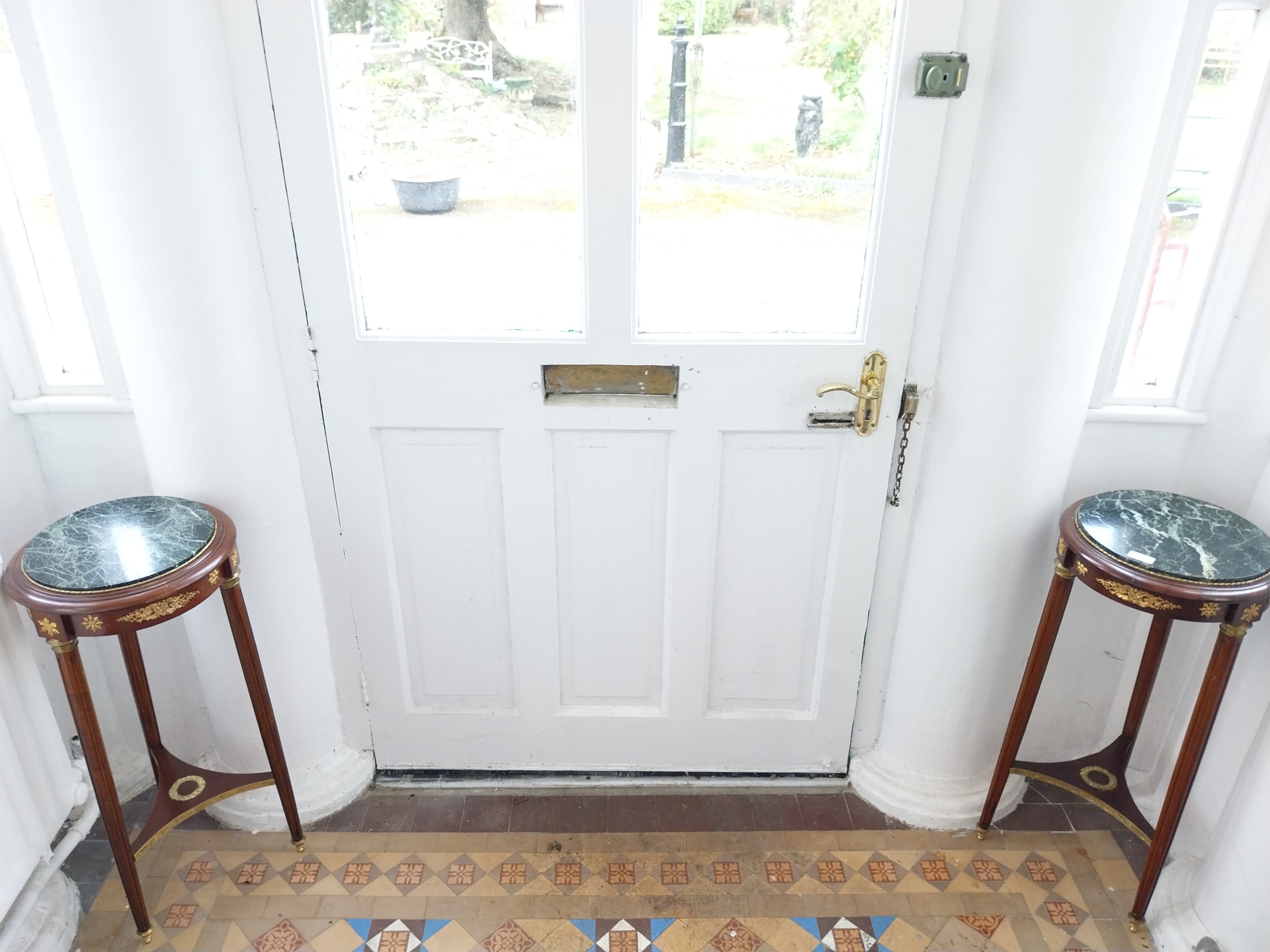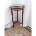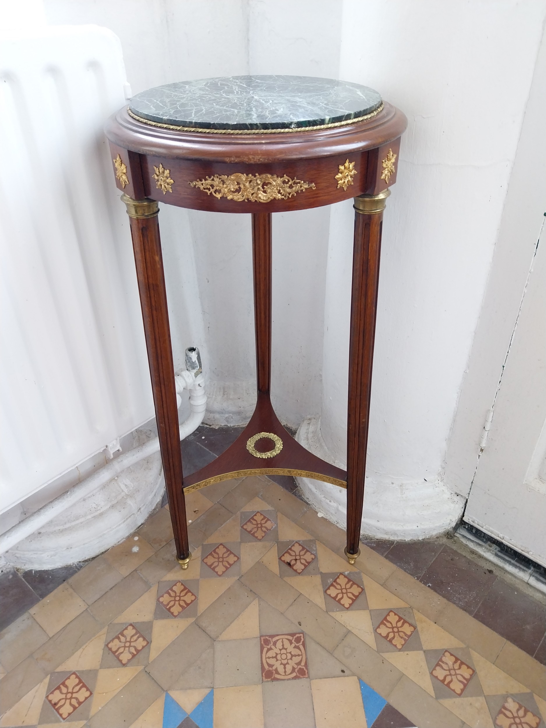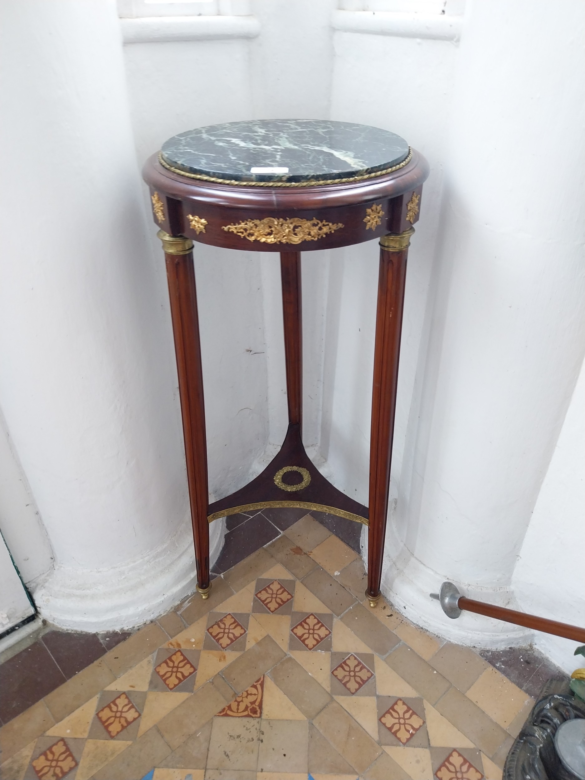 Pair of French mahogany jardiniere stands with ormolu mounts and marble inset tops. { 84cm H X 23cm Dia }.