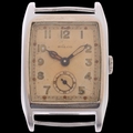 ROLCO (ROLEX SUBSIDIARY BRAND) - a Vintage chrome plated mechanical wristwatch head, circa 1930s, silver tonneau dial with gilt Arabic numerals, blued steel cathedral hands, subsidiary seconds dial and George VI Royal cipher caseback, 15 jewel movement with calibre 59, case width 26mm, working order