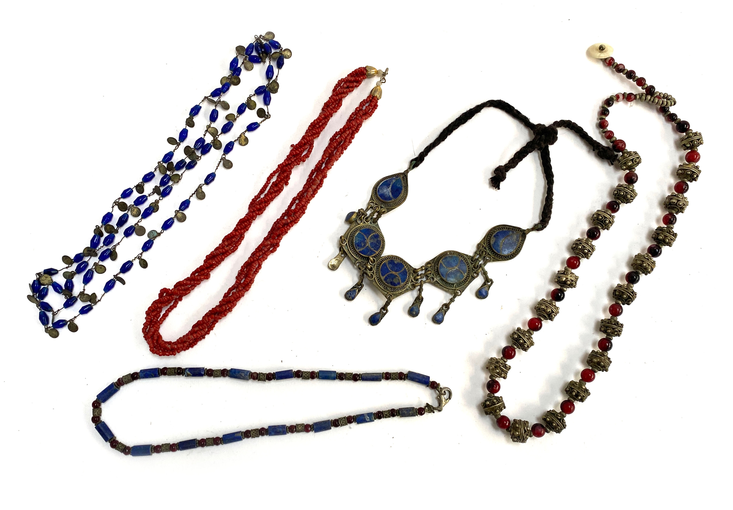 A small lot of North African and other beaded necklaces to include multistrand coral
