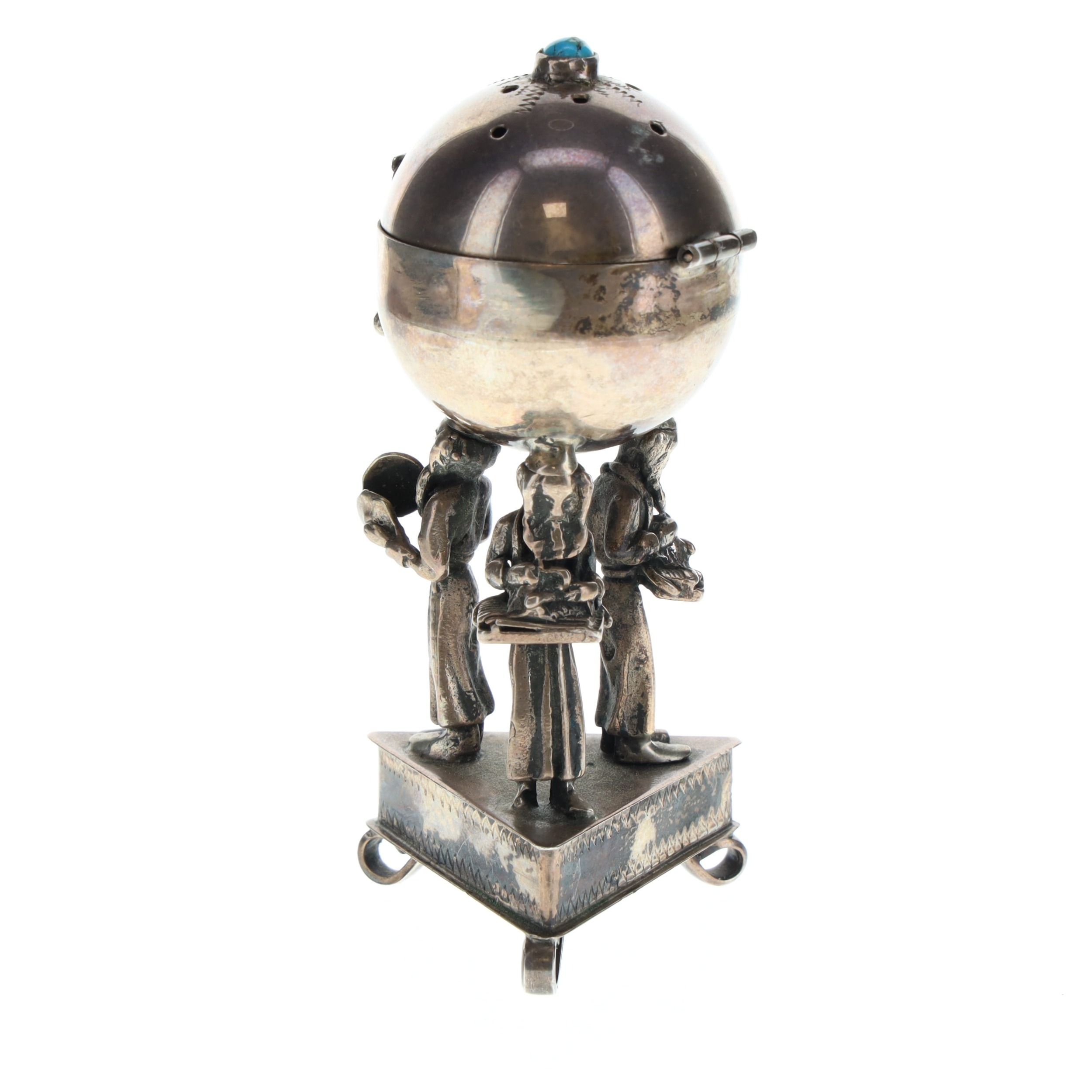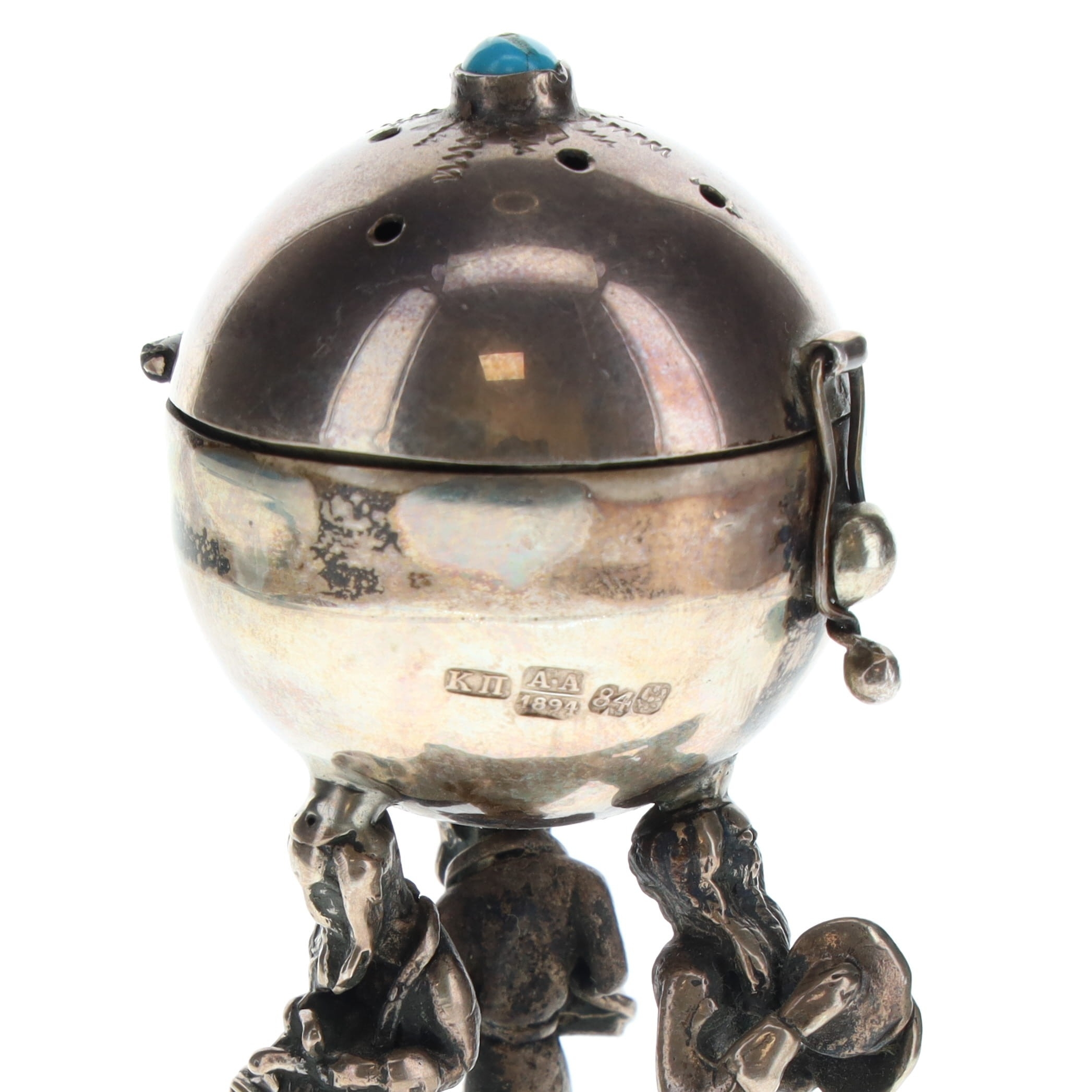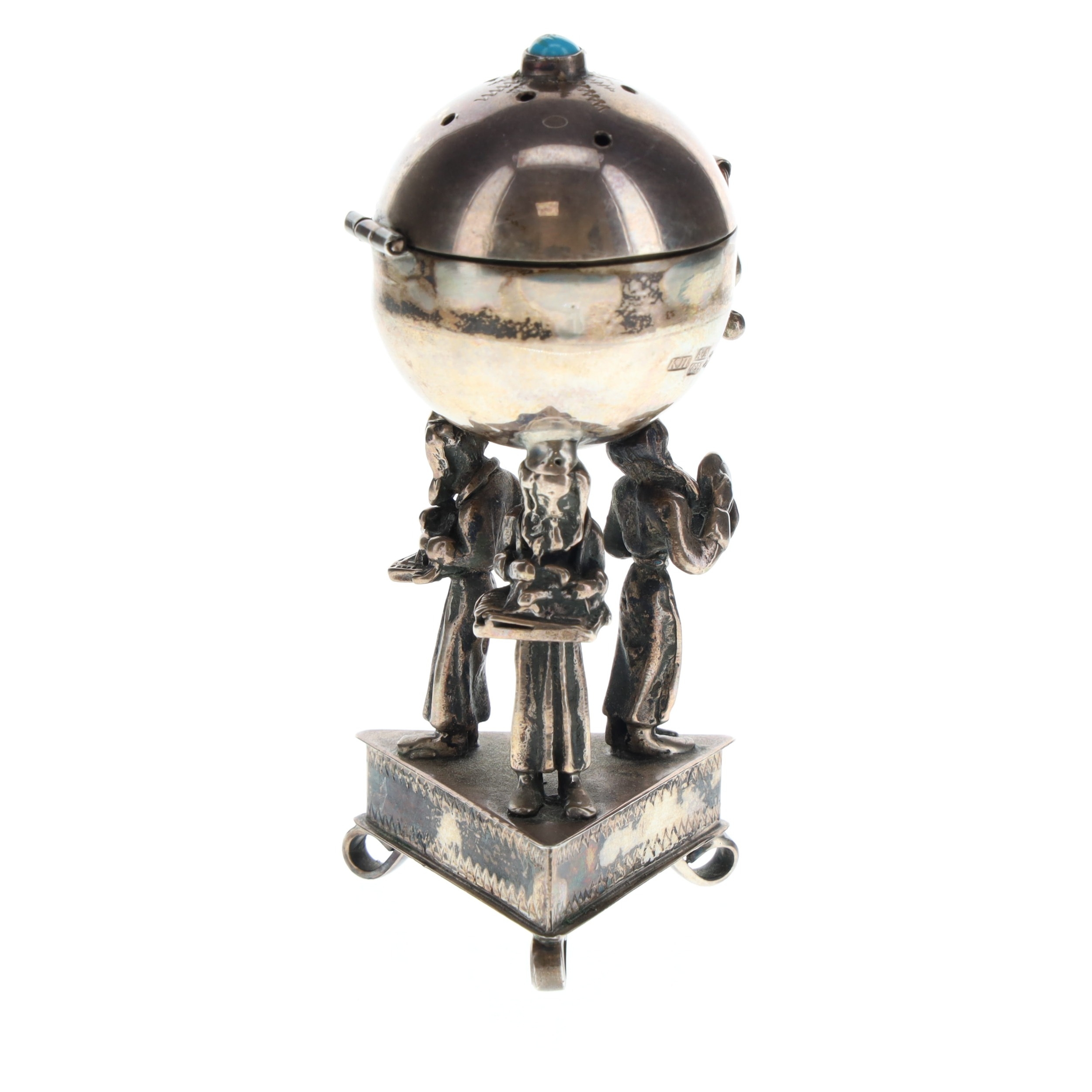 Antique Russian Silver Figural Pedestal Besamim Spice Box. Russian Cyrillic maker's mark reads as KP. Visible signs of age and tarnishing throughout.
