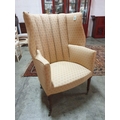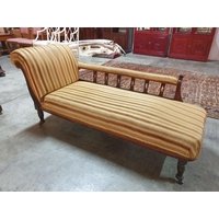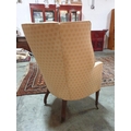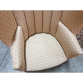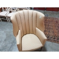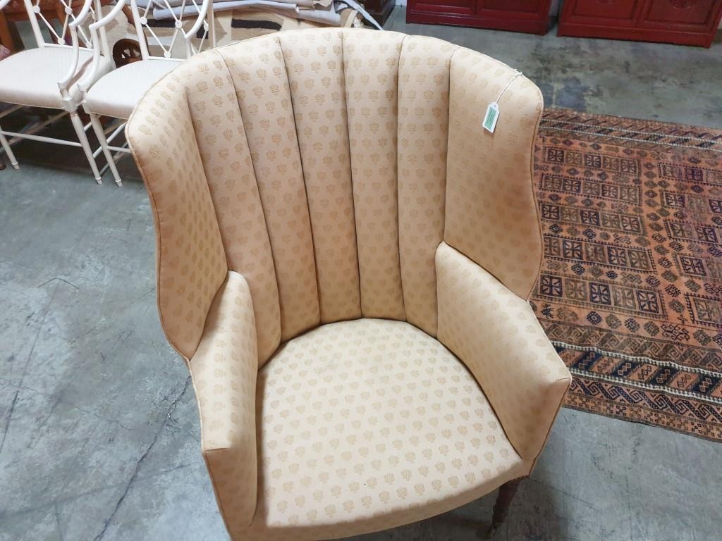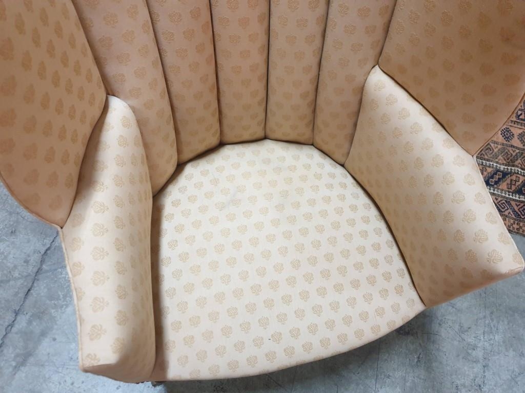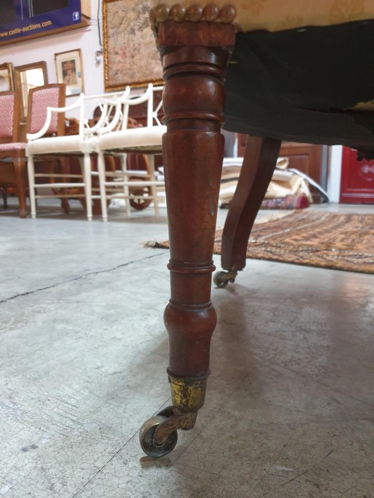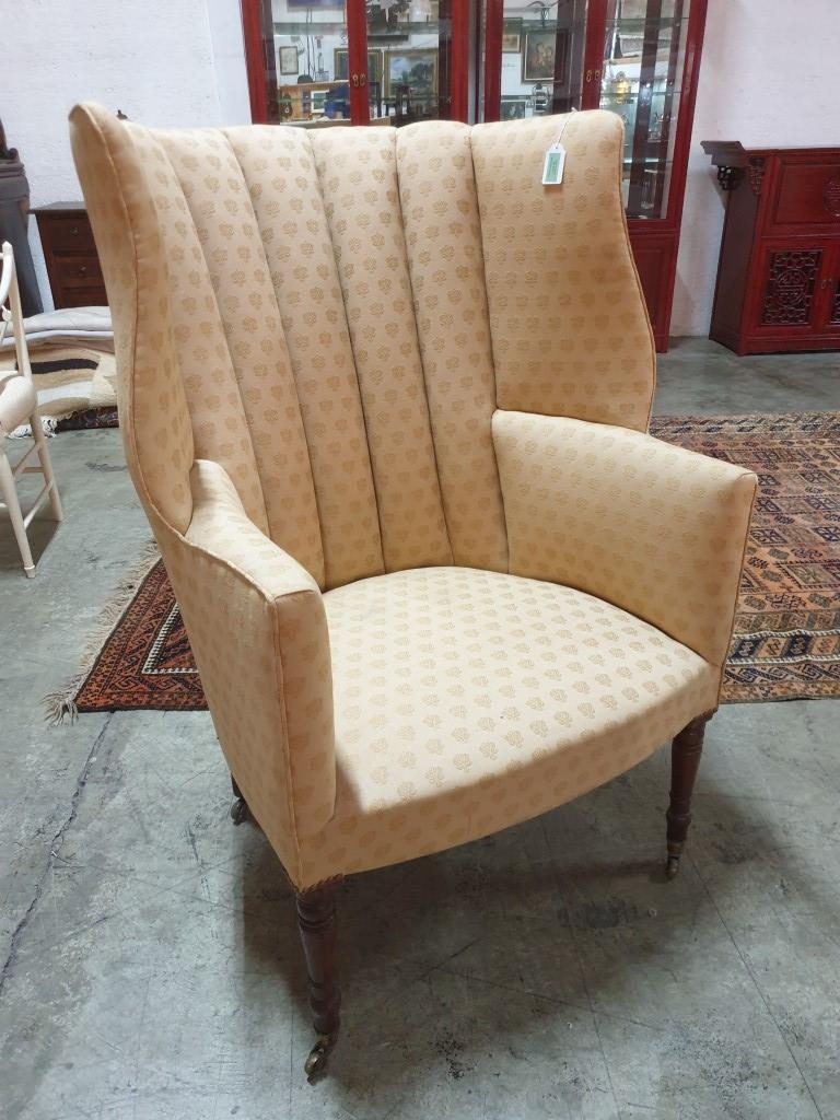 Antique Regency Blanche Bergere Lounge / Reading Tub Chair in Cream & Gold Tone Patterned Fabric with Turned Front Wooden Legs and Original Casters