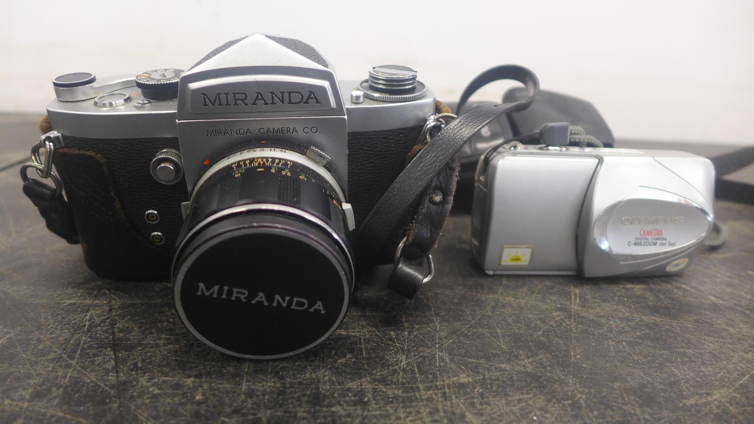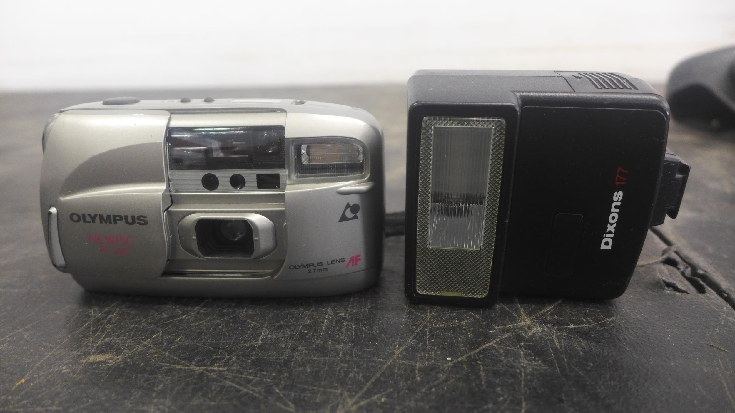 A quantity of cameras including Olympus C-460 zoom, a Miranda camera, an Olympus Newpic AF200 and a Dixons 177 flash